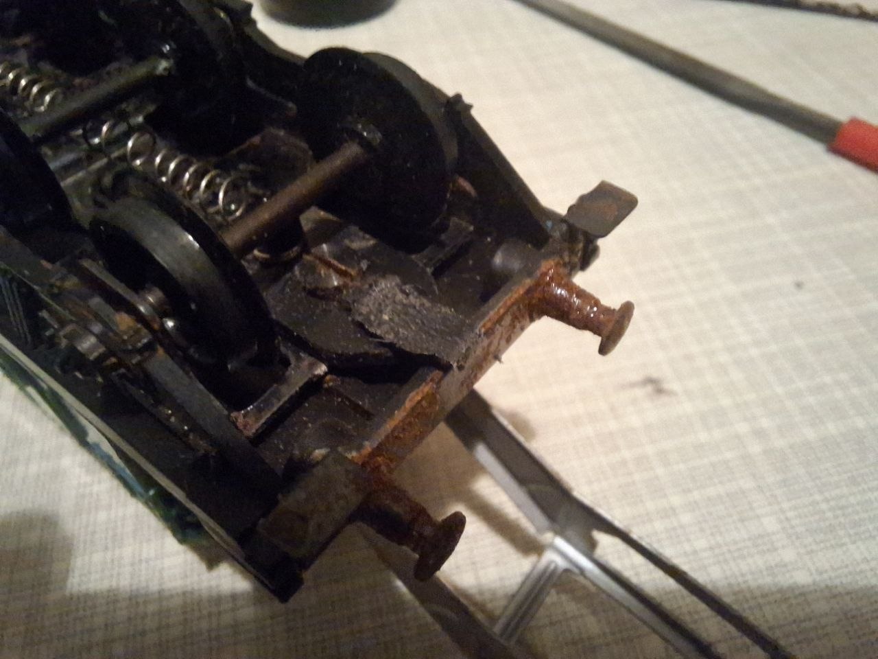 Підрізав раму, щоб передній бігунок мав ширший радіус повороту. Ось мій франкенбігунок. Ось як виглядає максимальний вигин рами і колпар з бігунком. Зчіпка вийшла трохи занизько, але це легко буде виправити. Головне, щоб по довжині підходила. По планах - корпус мені не подобається, надто вже примітивний. Покладу його в коробку до решти замінених деталей. Для корпусу використаю кіт від Italeri, який я купив раніше. Також треба якось розмістити мотор в котлі (треба якийсь вузький, але потужний мотор), а не в будці, привод через черв'як для плавності.