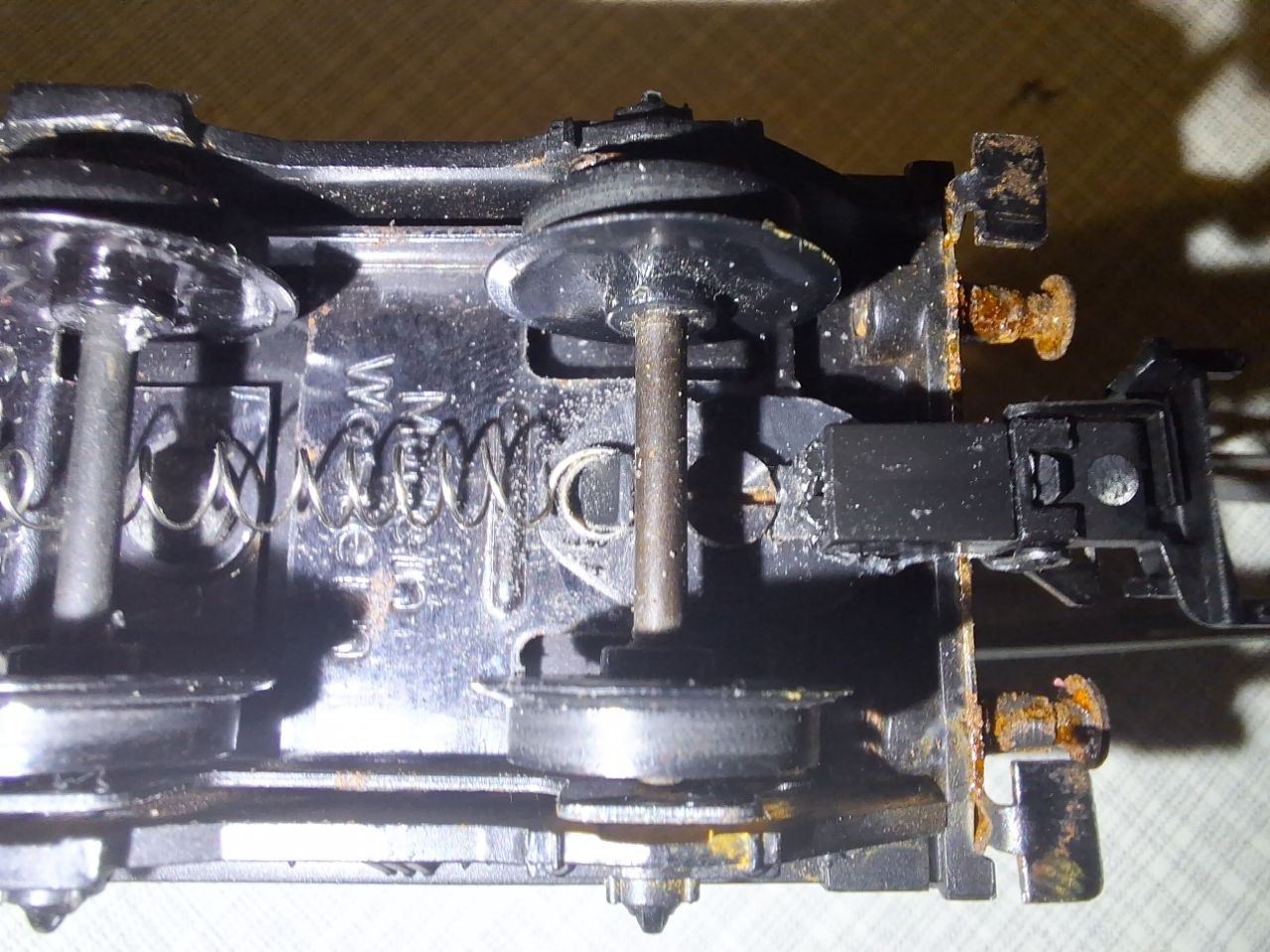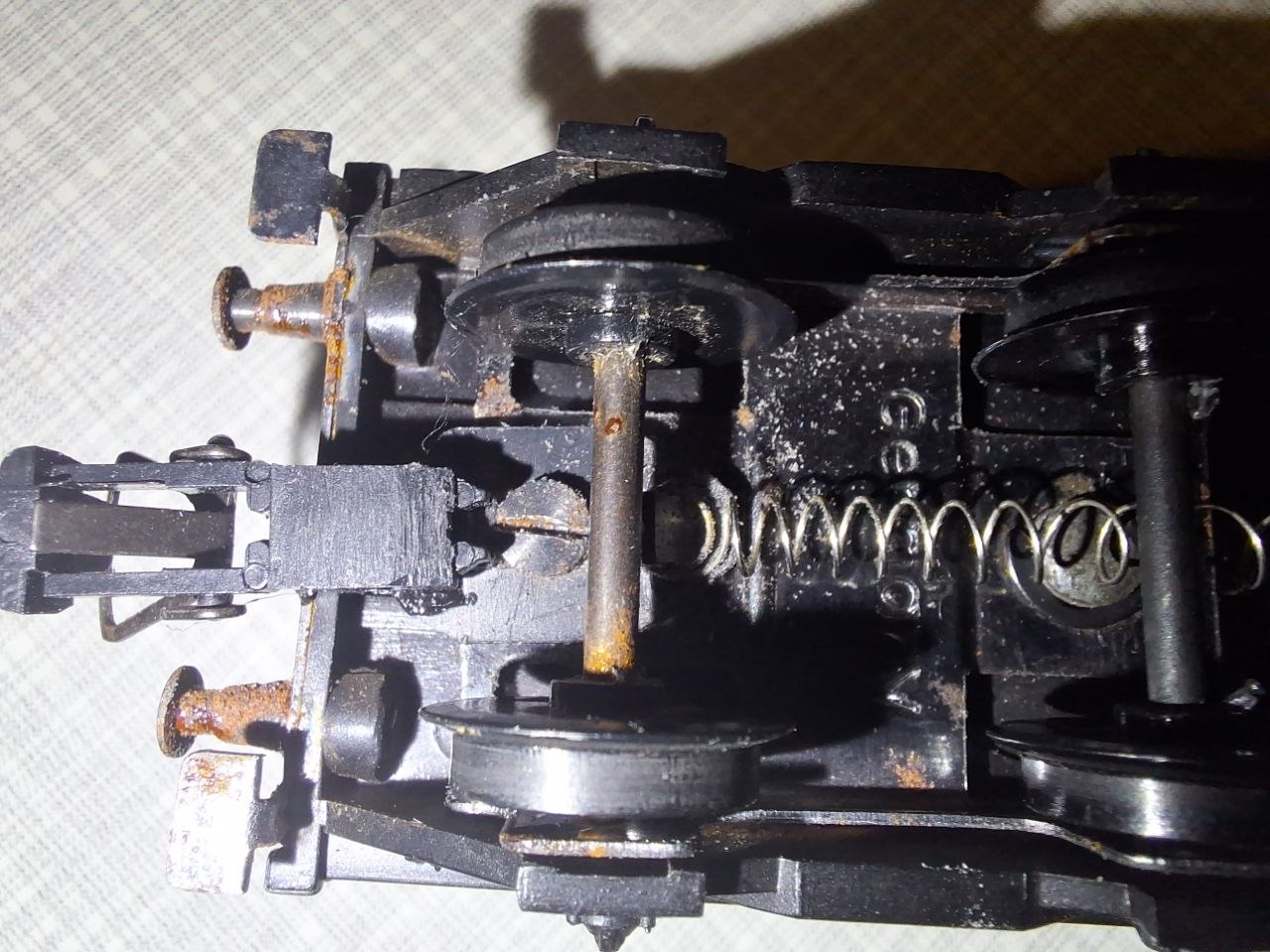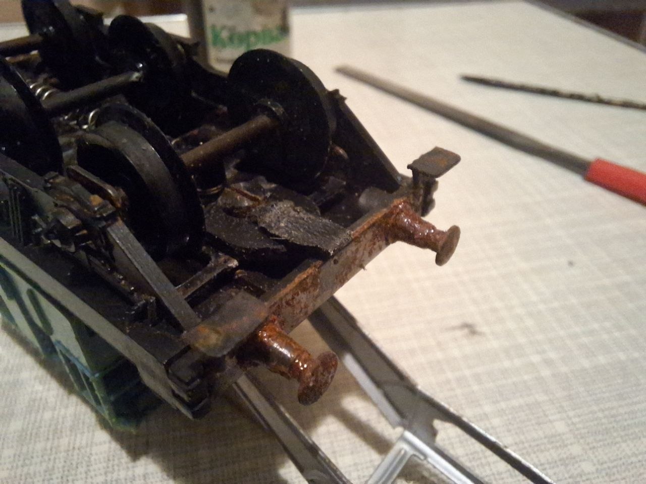 Купив ще один такий вагон. Пофарбував колеса акриловою фарбою в червоний. В принципі вони натужно стають в візки, але не обертаються вільно, думаю "розробляться". Капнув олії, крутяться помітно краще.