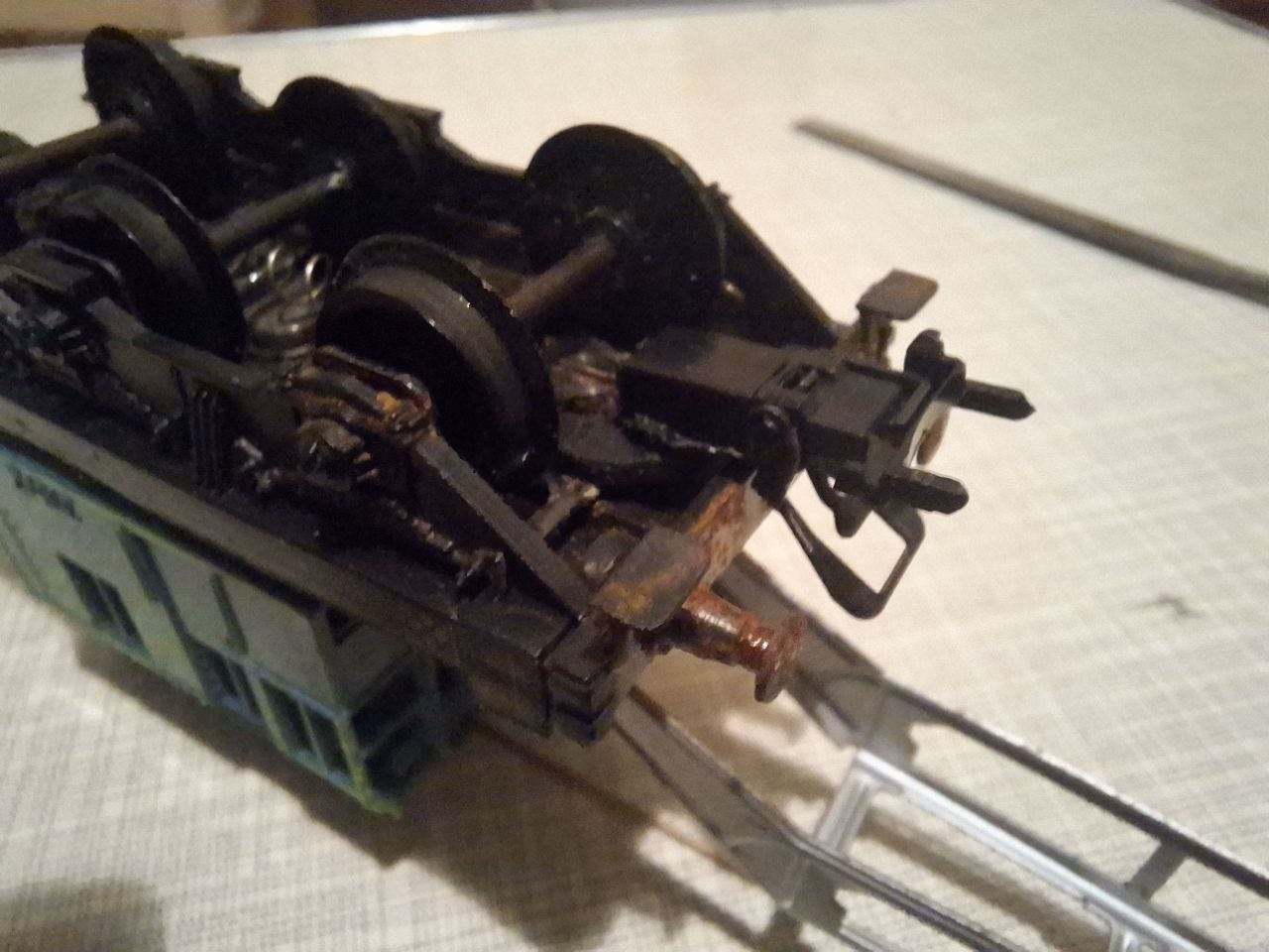 Якось купив був за безцінь чистячий вагон Kleinbahn, а саме шасі вагона і бачок, без корпусу. Тоді купив древню цистерну Fleischmann чисто заради самої "бочки". Відпилявши її дно і розширивши отвір я зміг засунути в неї металевий "бачок" і прикрутити довшими шурупами до платформи. Вийшло круто саме тим, що цистерна не декоративна, а функціональна. Негарно вийшло, що з одного боку завеликий "звіс", розбавлю якимись деталями може. Поки що там буде просто гальмівна площадка.