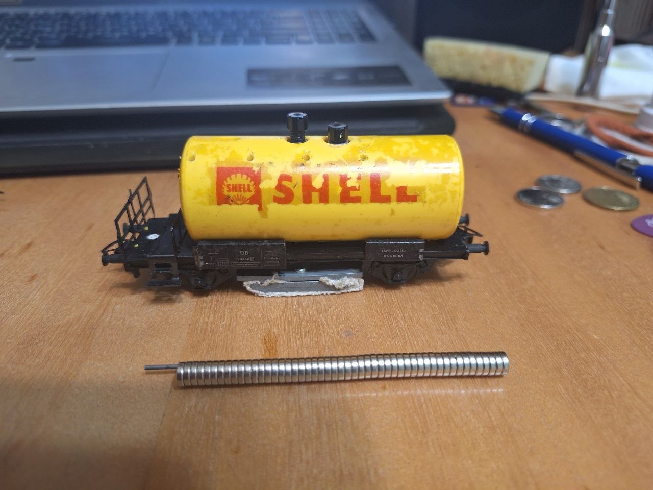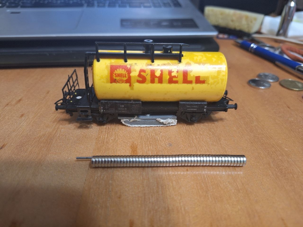 Мав поламану драбинку від цистерни Piko, наклеїв малярну стрічку на цистерну, позначив отвори для драбинки, але це чисто щоб припасувати (кріплення на драбинці зламані). Фіксувати ж драбинку буду на магніт, щоб легко знімати при потребі. Знизу приклею на неї цей дріт, він магнітиться. Але спершу вирівняю і розплескАю.