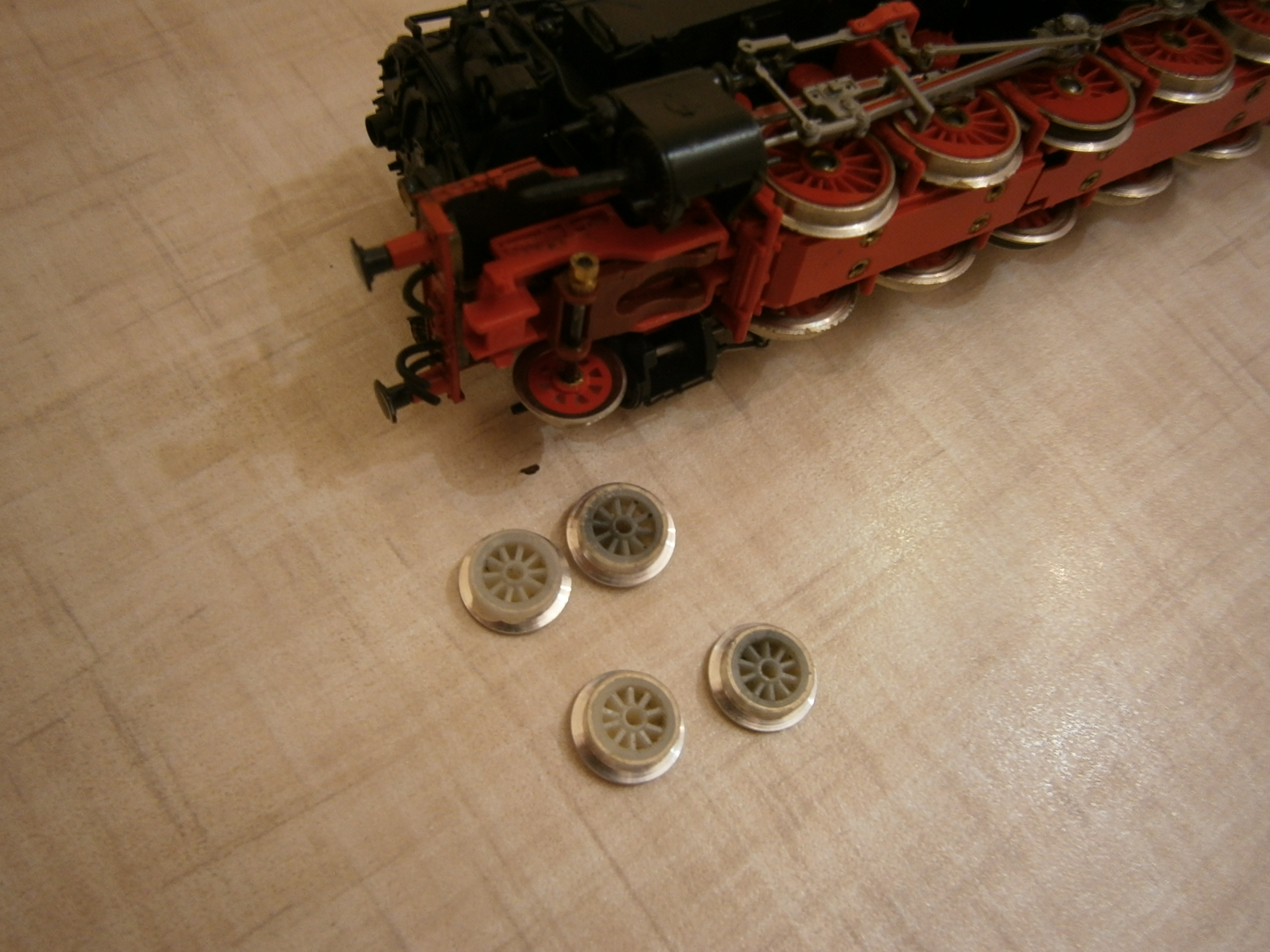 До речі, коли я намагався зробити менше обертів (за дуже аж малі), то лок починав ніби "захлинатися". Відчувалось, що йому важко і він зараз почне буксувати.Тим більше, що там трьох полюсний мотор. Я впевнений, що на Роковскую модель з п'яти полюсним мотором і маховиками можна чіпляти і довші потяги.