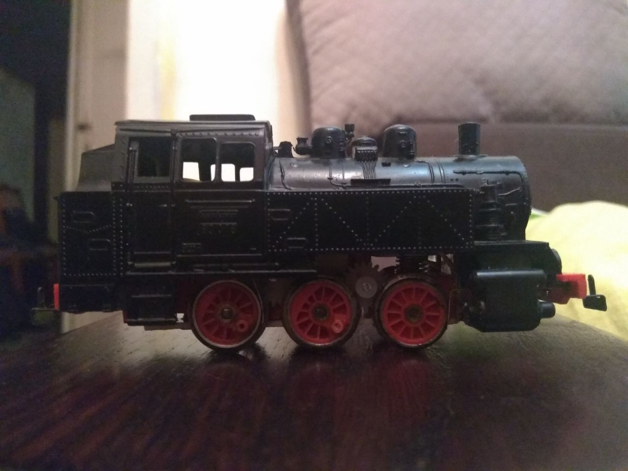 А сьогодні я взяв баласт від іншого бр80, підняв баласт, поки що на пружині, прикрученій до опори. Просвіт між рамою і котлом виглядає реалістично і прикольно. Вперше катав з корпусом, запинки і зіскакування передньої пари на стиках списую на те, що рейки на дуже нерівній підлозі, виходять якісь американські гірки. Віднесу до батьків, в них по рівній підлозі щоб навколо ялинки з вагонами їздив. Щодо приводу на передню пару треба його таки зробити, бо та пробуксовка 2 і 3 пари виглядає ефектно, але неефективно. Шестерню не дуже хочу, бо її буде добре видно, я дуже радий як вийшло, що більша частина деталей шасі закрита корпусом. Тому якщо зрозумію як зробити чи купити дишла, то через них, якщо ні - через шестерню. Треба ще передню пару купити як ті 2. Корпус буду переробляти вже після свят щоб вийшло щось таке, як у Вовера. Відео: