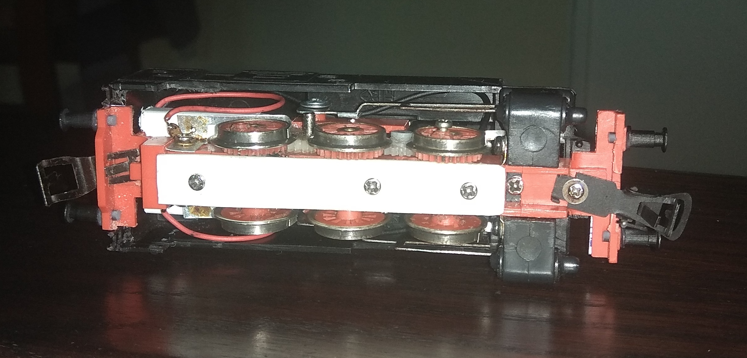 Вирішив, що пошук першої паровозної пари і кулісного механізму може зайняти набагато більше часу, ніж мені здається, тому додав таки шестерню між першою та другою парою. Виглядає не сильно гірше, зате їде тепер як танк. Час від часу зіскакує перша пара в тих самих двох місцях кола на стиках, тому це мабуть вже провина не шасі, а рейок. Навіть так, боком, він продовжує намотувати кола. На даний момент я задоволений результатами, з часом продовжу. Напевно щось нове запощу вже коли він буде під ялинкою з вагонами кататися. А там в наступному році поступово буду продовжувати.