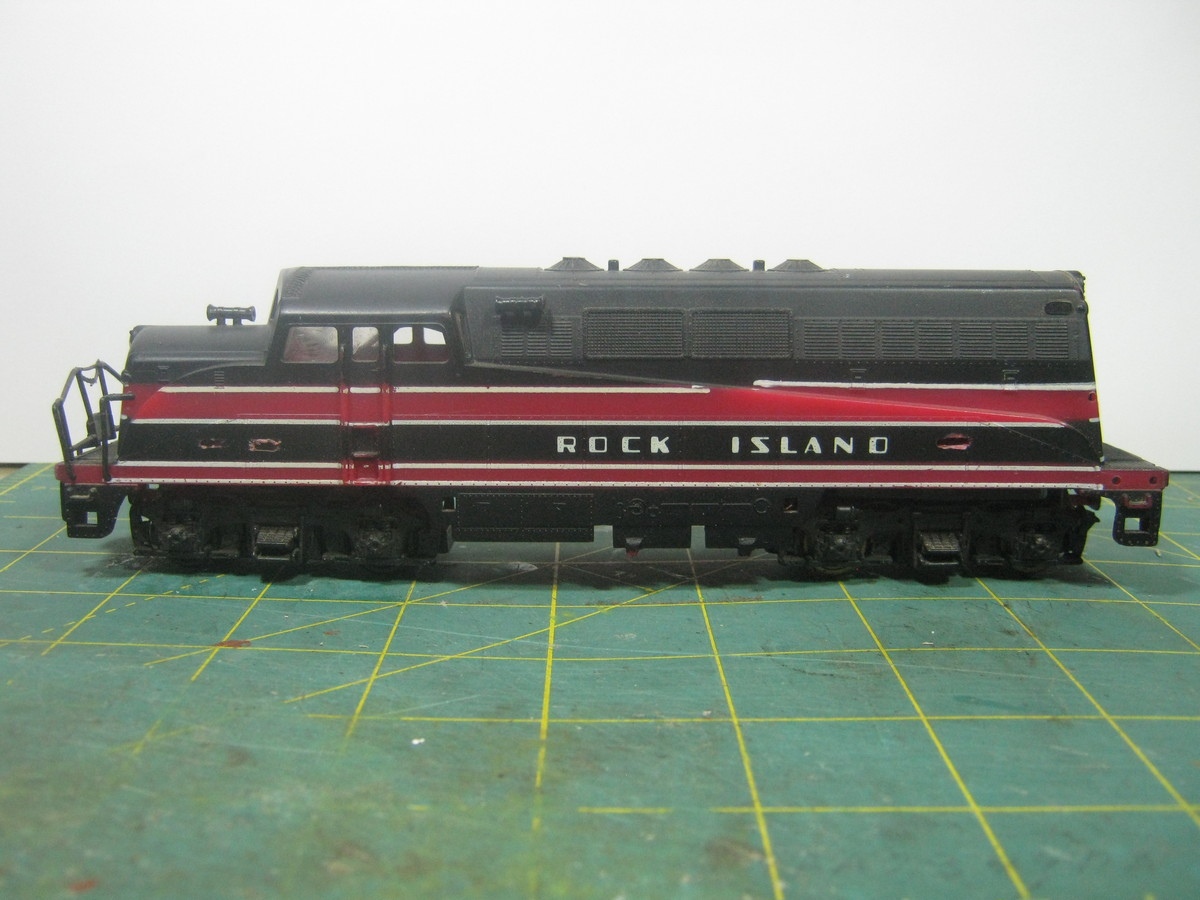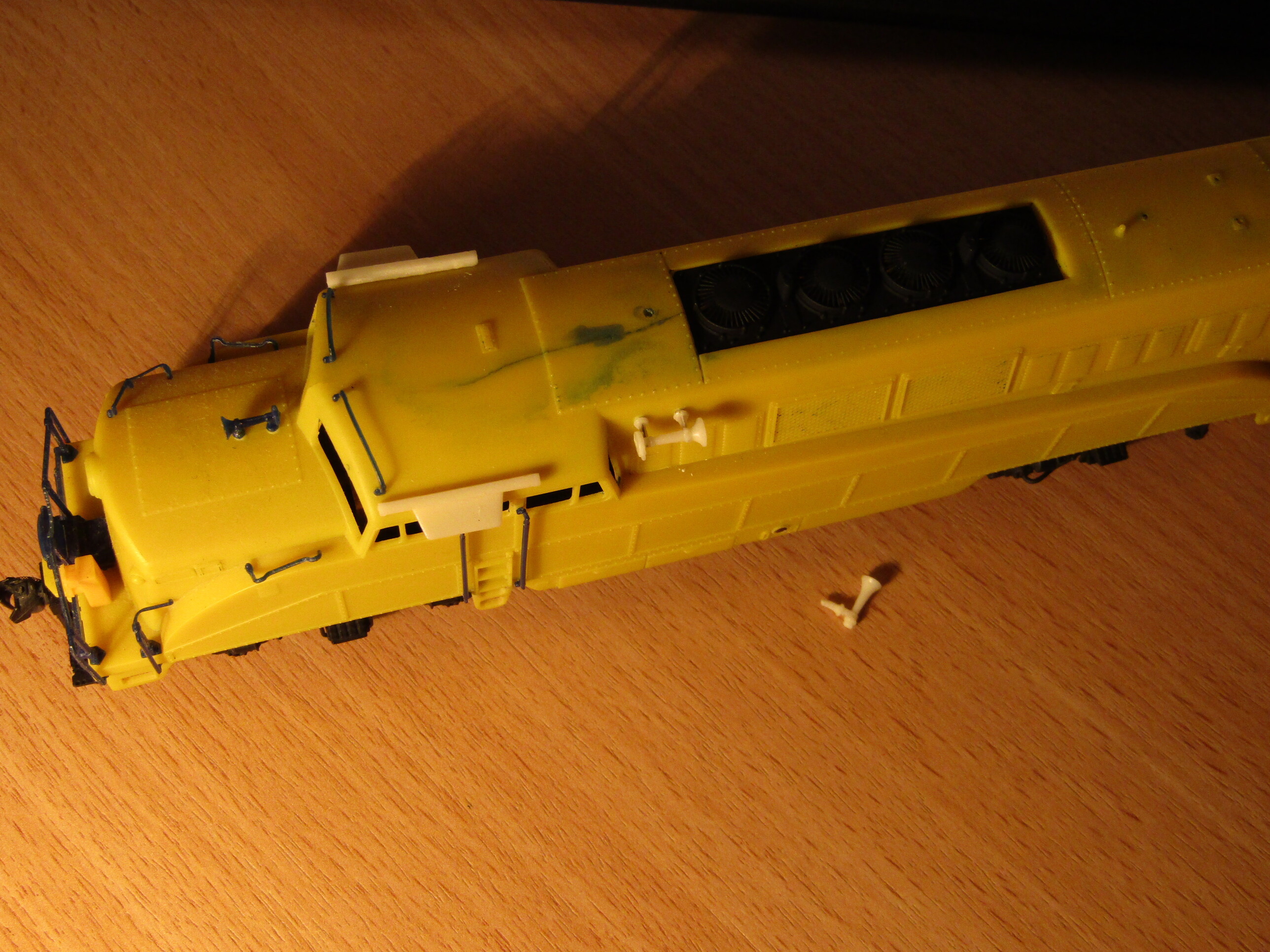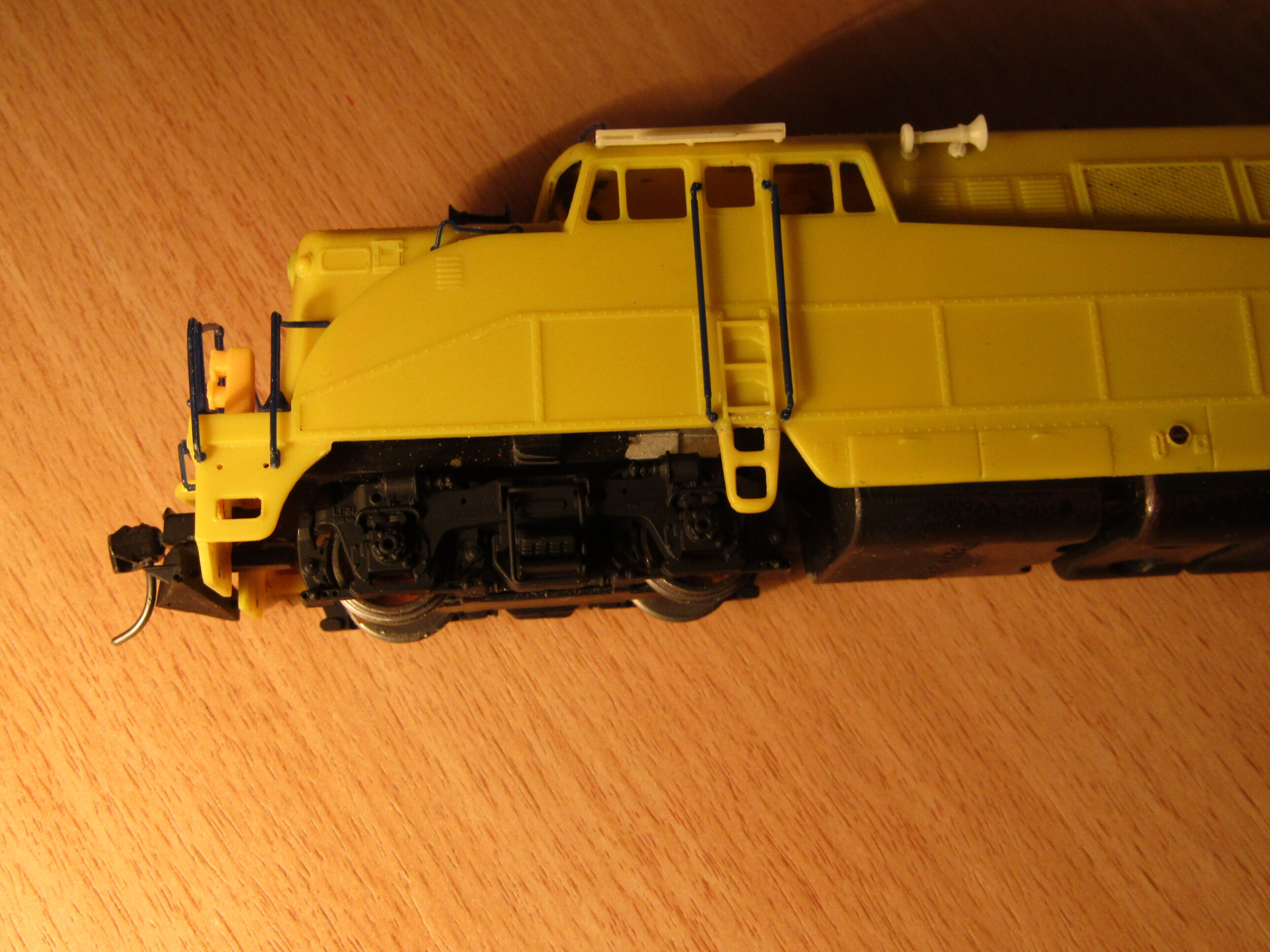 На моём какой-то умелец варварски прорезал отверстия в бортах и вставил две тележки. Я так понял, что тележки от TYCO.