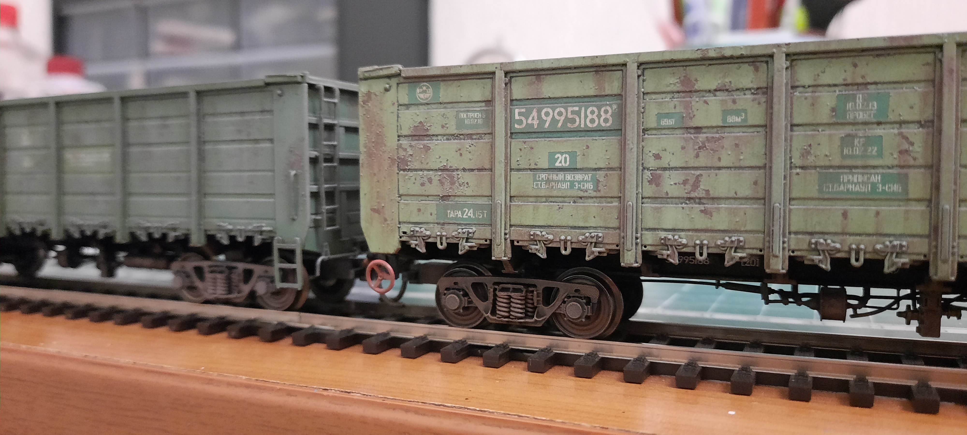 Подумал, глядя вчера по проезжающий товарный поезд, что на разных вагонах ходовая выглядит по-разному. Буду делать разного оттенка тележки, колёса. В жизни трудно найти какого-то одного цвета телеги грузовых вагонов.
