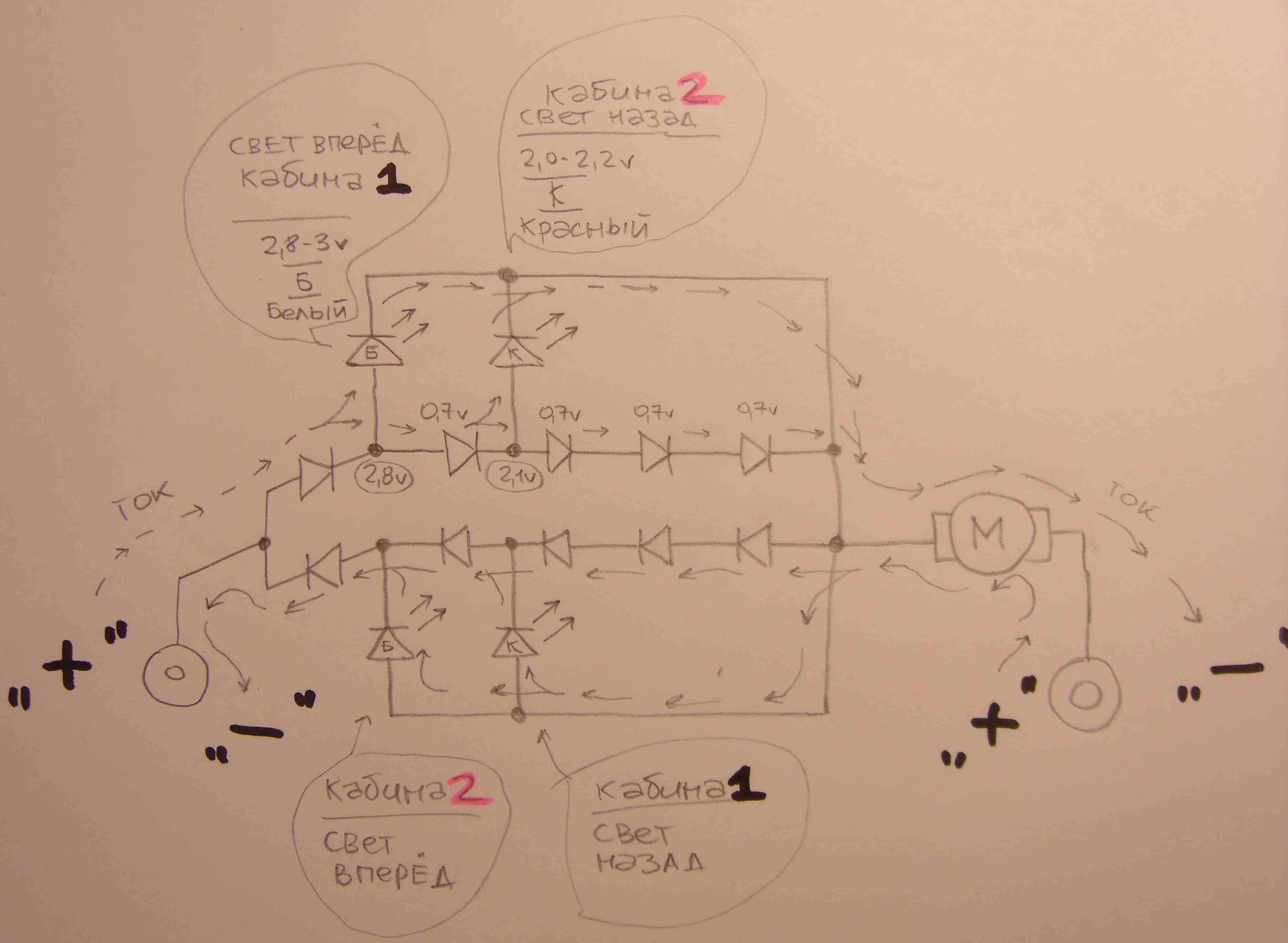 2. Режим стою со светом - даем напряжение на рельсы до 3 - 4v (и бросаем регулятор) - ток пойдет через цепь из 5 диодов и 2х светодиодов (точнее по одной из 2х цепей согласно полярности) и через катушку мотора - зажгутся светодиоды белый и красный в одной цепи (верхняя или нижняя цепь на картинке) сразу на полную - мотор стоит, потому что все первые 4V на рельсах на себя заберёт цепь освещения из диодов, а мотору останется 0v - мотор стоит - свет горит!