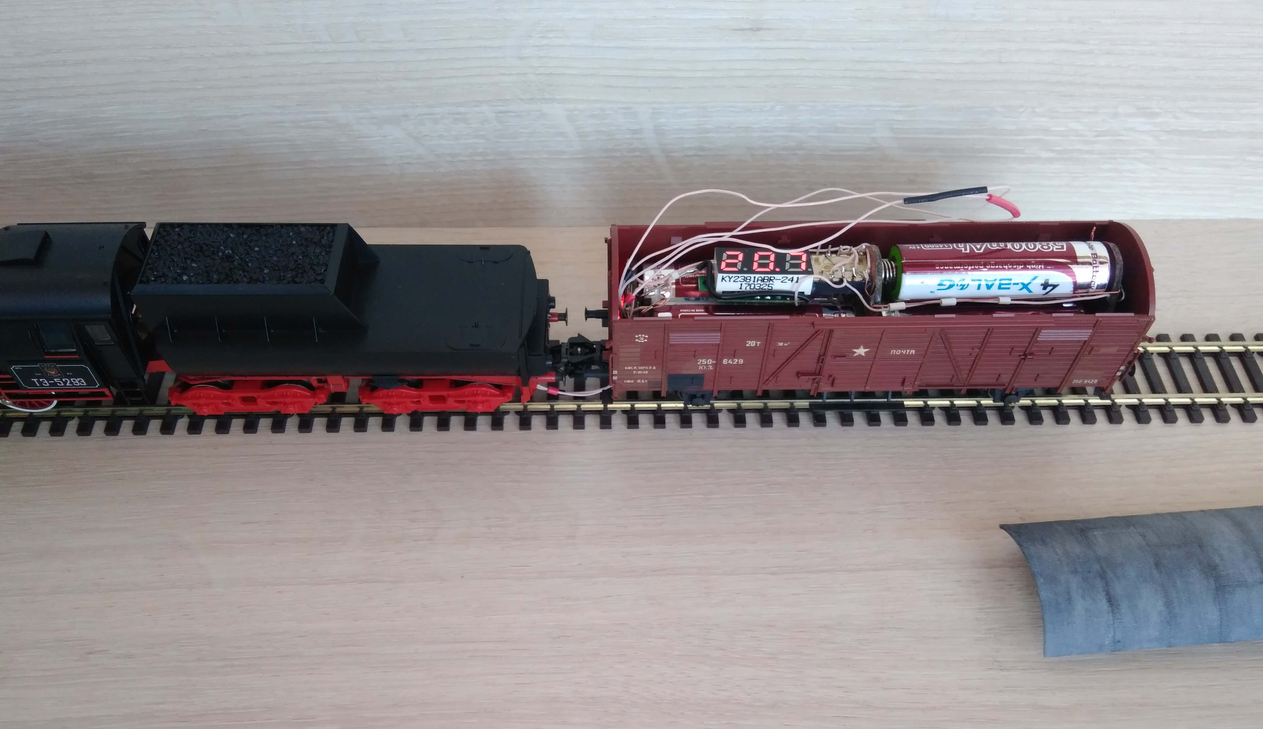 Осоветил его как смог, это неотъемлимая часть теперь паровоза, в нём лежит питающий аккумулятор 20v (5х3,7v), и спрятана функция включение - выключение, сделано на герконах, установленных в торцах вагона.