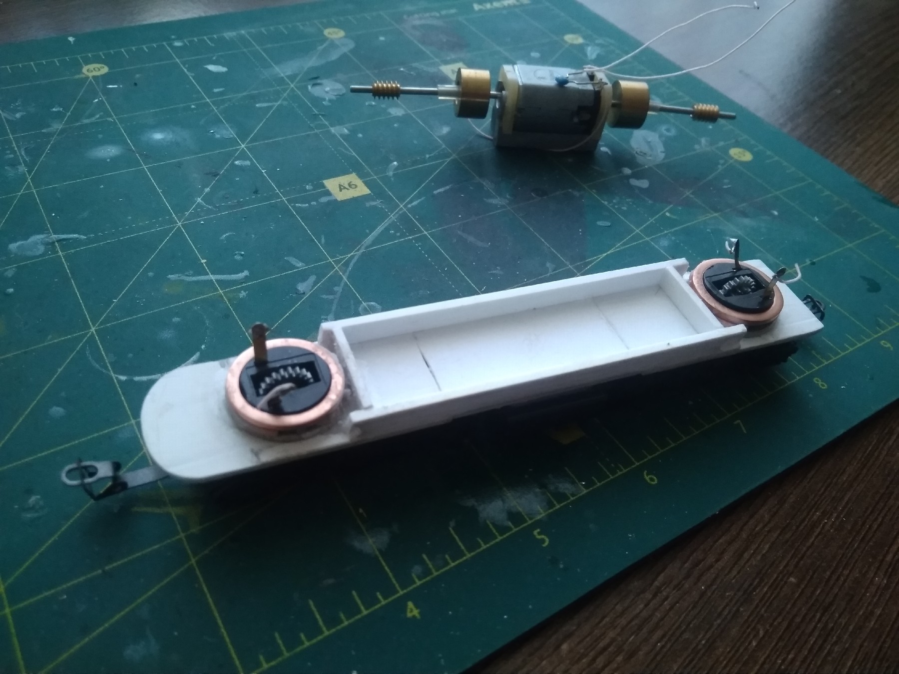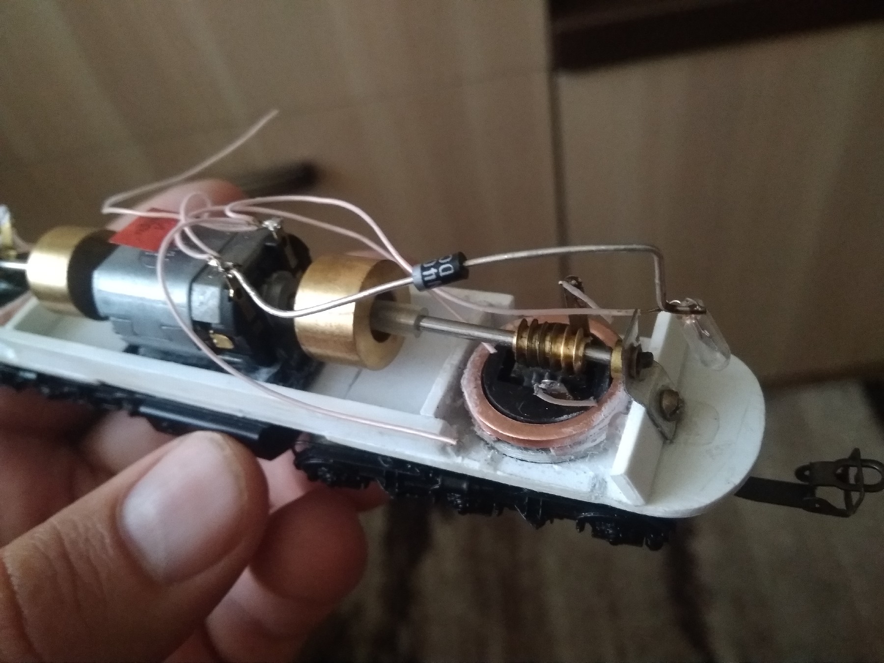Дякую за пораду з грузиками для коліс! Нагрузив скільки можна було раму, правда можна було не дуже багато бо маховики мішають, деякі куски свинцю приходилось плющити на наковальні. Але незважаючи на недогруз тяга у моделі виявилася адекватною, я до того ж замінив бандажі на обрезиненій осі на нові. На фото на платформі приблизно 115 грам вантажу, він витягує її під гору без пробуксовки. Споживає біля 190мА на 10в при ході вперед та біля 100мА назад (додаткові міліампери споживає лампочка). Іде плавно, але шумно.