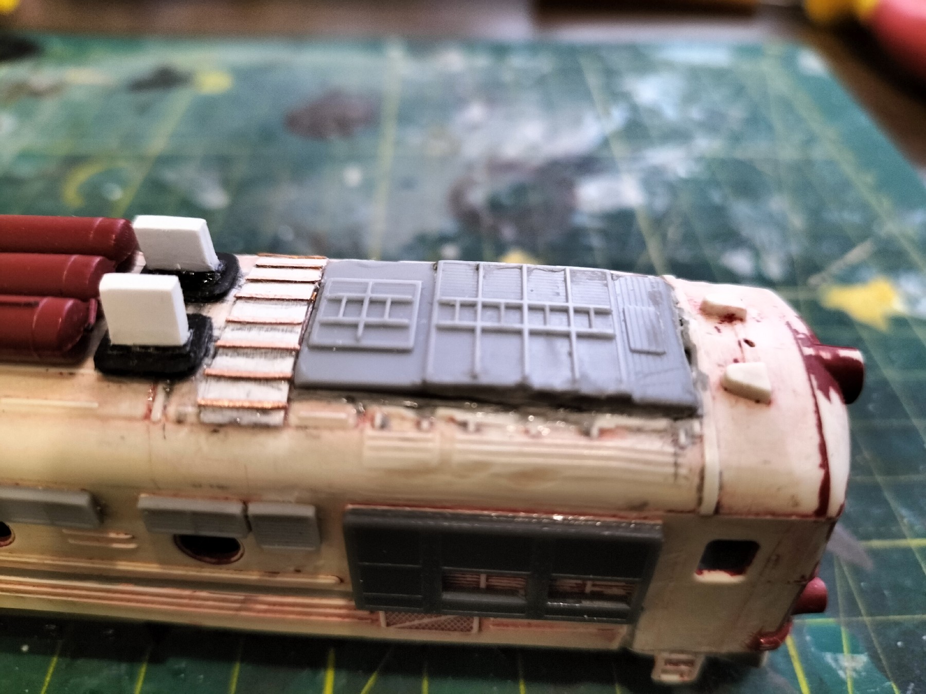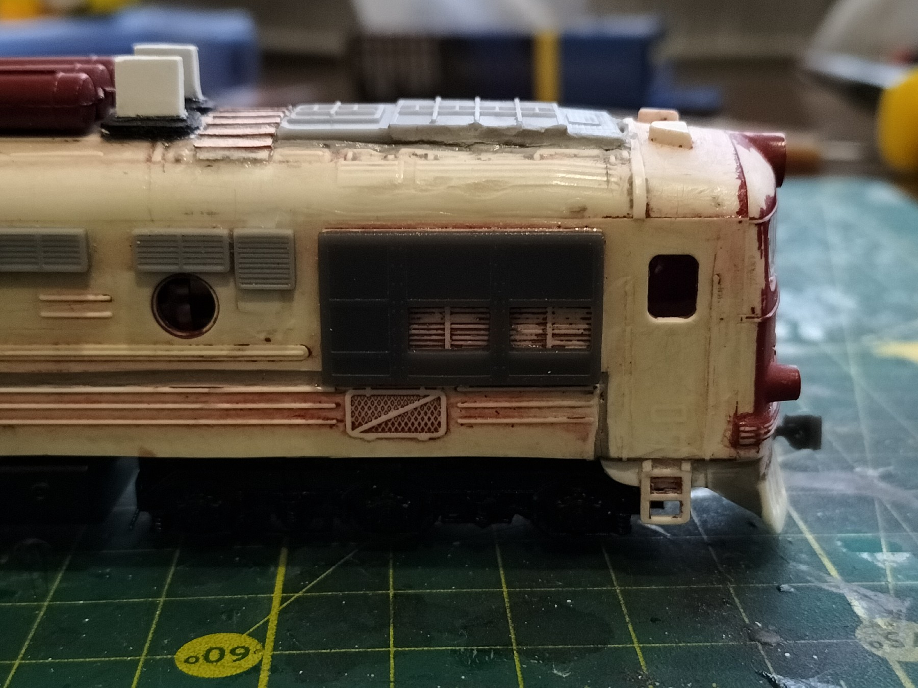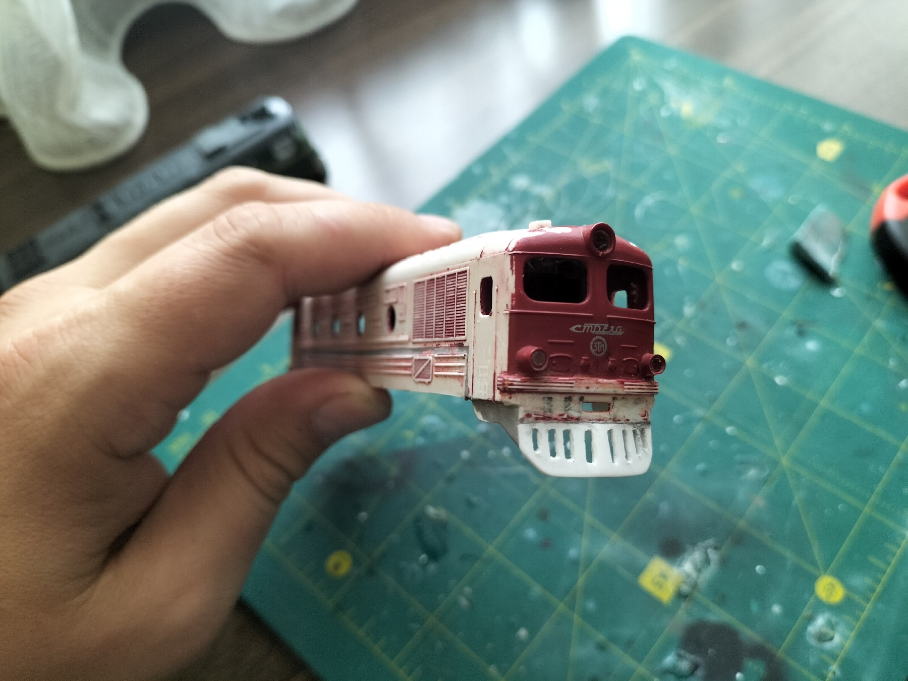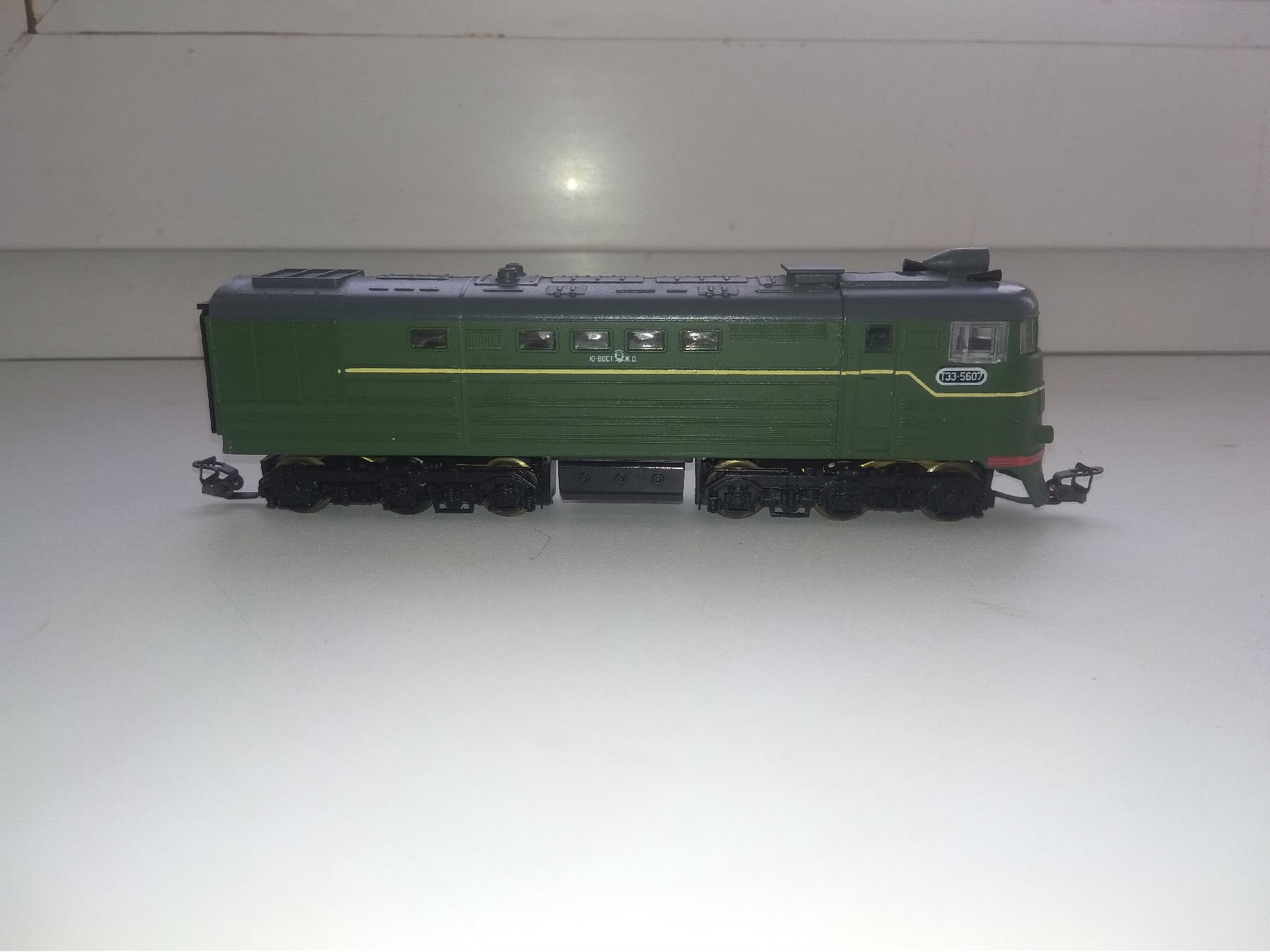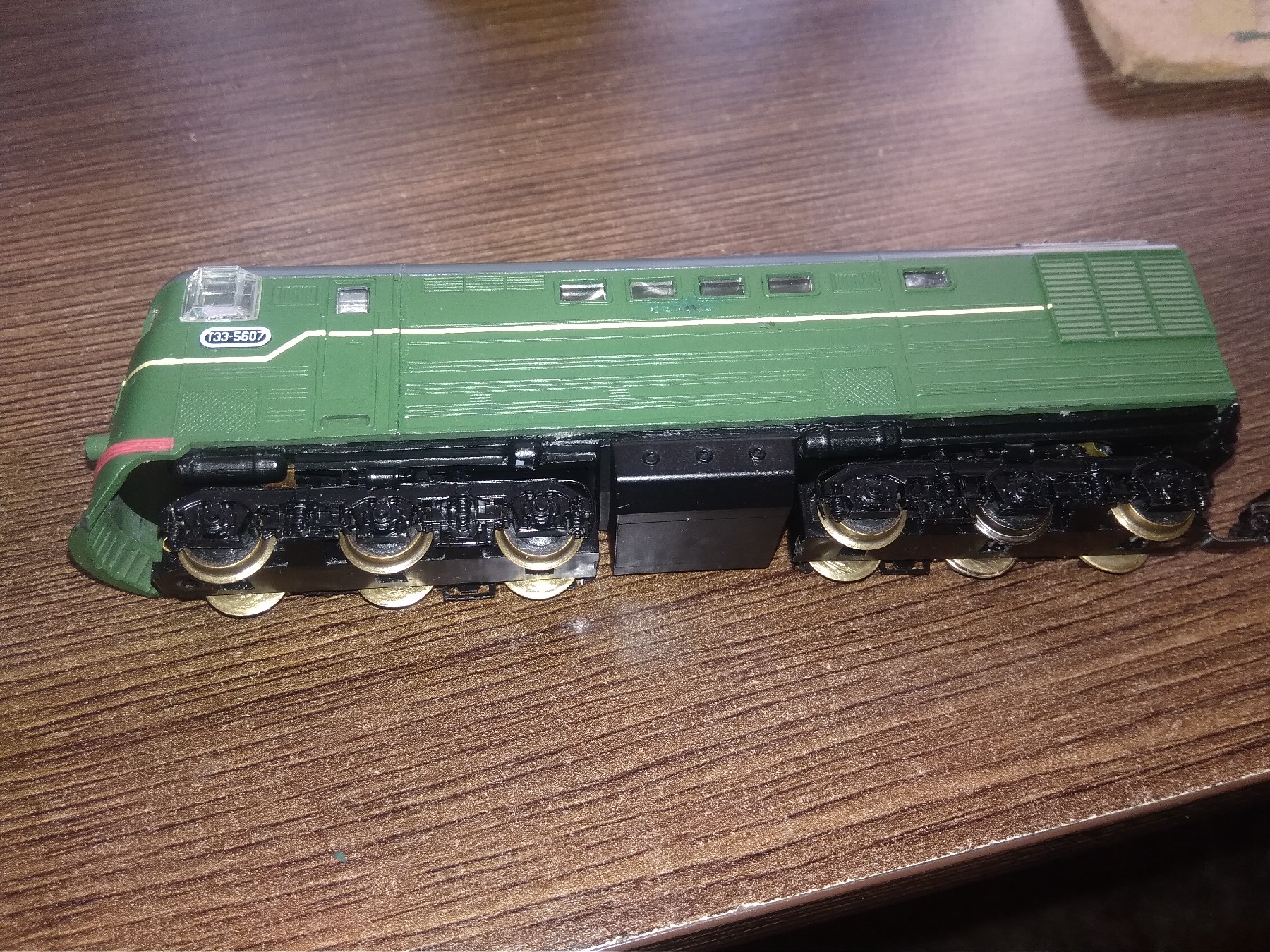 Майже доробив. Залишились доставити драбинки ззаду, декалі та везеринг. На раму приклеїв друковані резервуари з пробних 2ТЕ116, а то у "Пересвета" про деталізацію рами забули взагалі.. Баласт приклеїв до стелі корпусу 45 грам. Знаю що не дуже вдалий варіант через високий центр маси, але в даному випадку візки не мають бокових рухів через особливості фіксації, тож на ходу тепловоз не хитає. Також зробив щось типу імітації кабіни щоби відсікти світло від лампочки - така "люстра" на ходу виглядає неприродно. Результат на фото та відео.