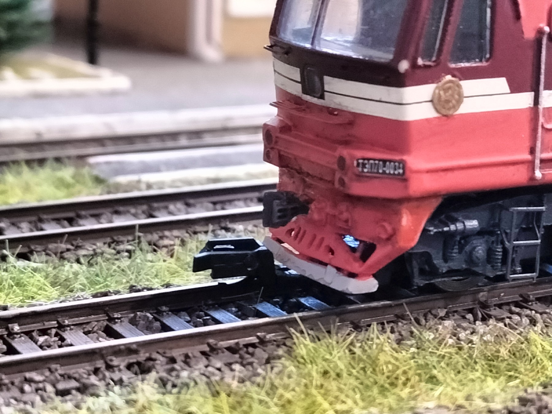 ТЕП70 від Юрія Гончаренка. Цікава модель і загалом мені подобається,хоча деякий покращеннь все ж потребувала. Що було зроблено - Більш надійно прикеїв мітельники та встановив імітації СА3 від Pit. Намагався звести до мінімуму щілину між мітельником і корпусом щоби не пробивалося світло від діодів - вийшло частково. Заміна жерстяних зчепок перевсетовського типу на знімні типу "сільодка", оскільки пасажирські вагони і мене них них через те, що проміжок між вагонами з ними менший. Робити проріз в мітельнику, як на ТЕП 10, не став, натомість поставив зчепки від тілліговського V180. Вона ідеально обходить мітельник. Дремелем випиляв з кришок візків незнімні пересветовські "кочерги", вклеїв вузли кріплення тілліговських зчепок (це не типові шахти NEM, а спеціальні, ішли в комплекті), обшпаклював та після висихання шпаклівки пропитав її суперклеєм. Працює, вагони тягає, те розчіпається. На модель наклеїв травльонку з комплекту та легко пообмазував фільтром.