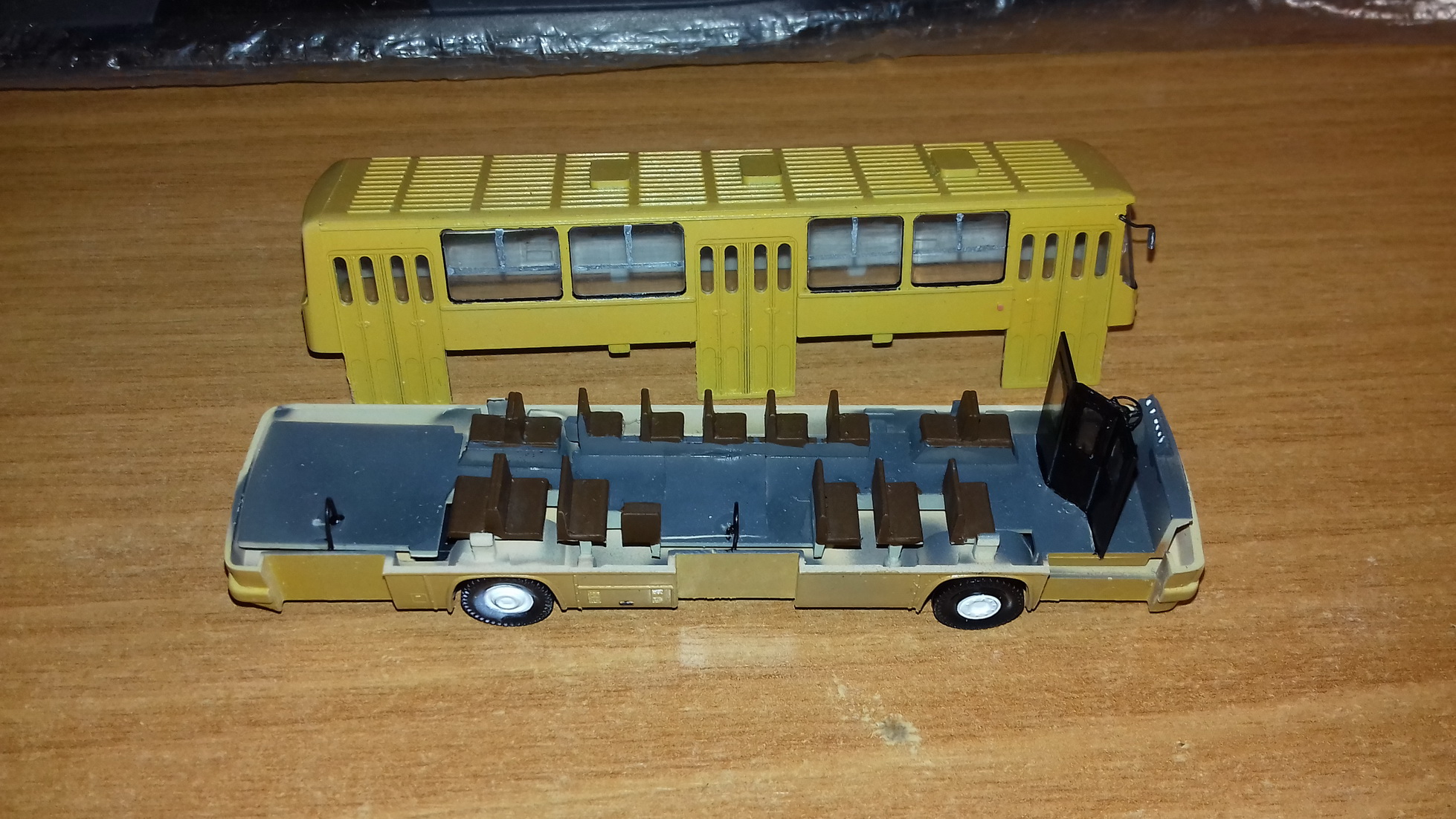 Небольшое "перетрахивание" модельтековского 260-го икаруса - руль, ручка кпп, зеркала заднего вида, потолок из тонкого пластика, покраска. Пока на стадии грунтовки. Красить буду в стандартную для городских икарусов охру.