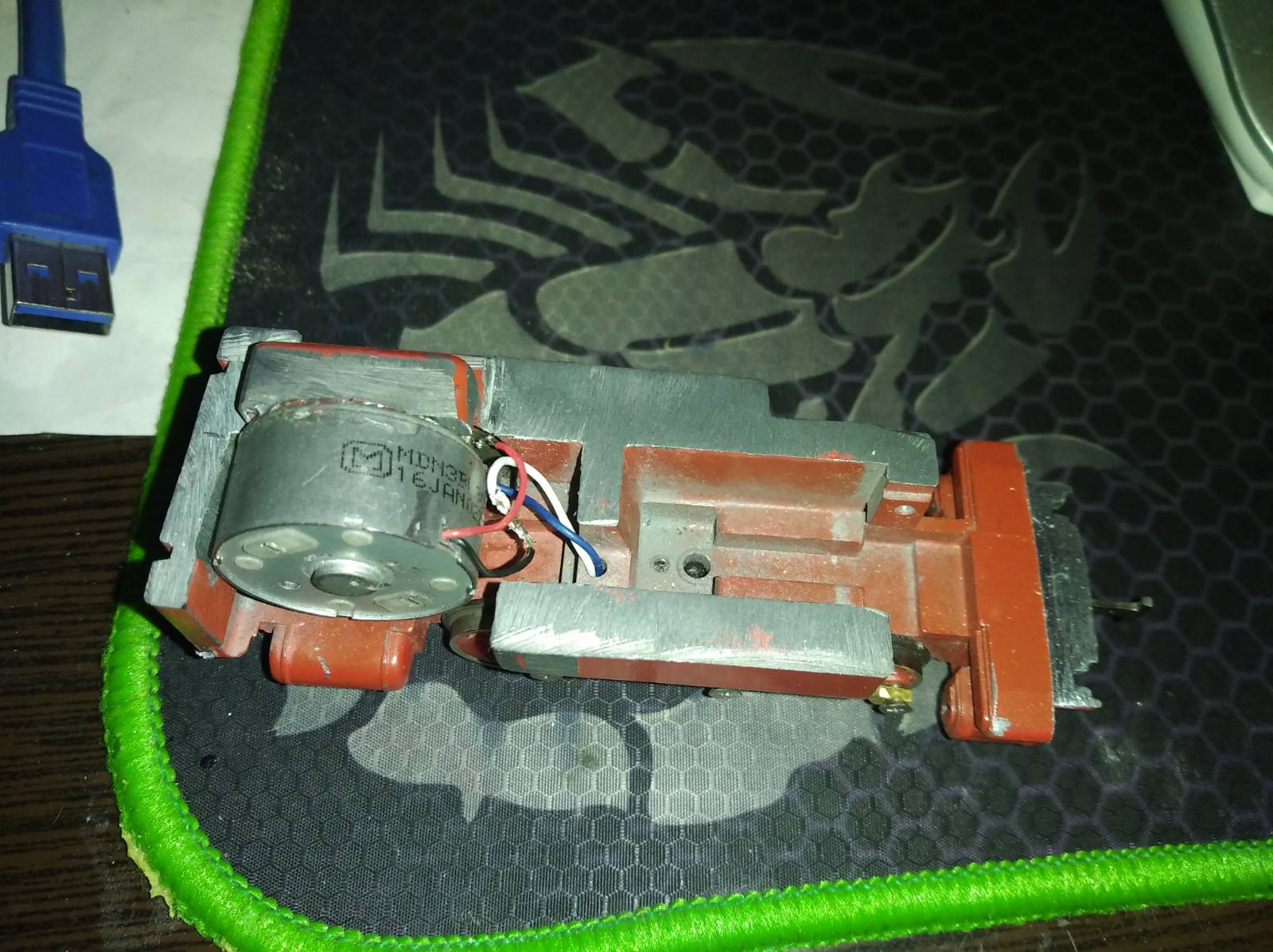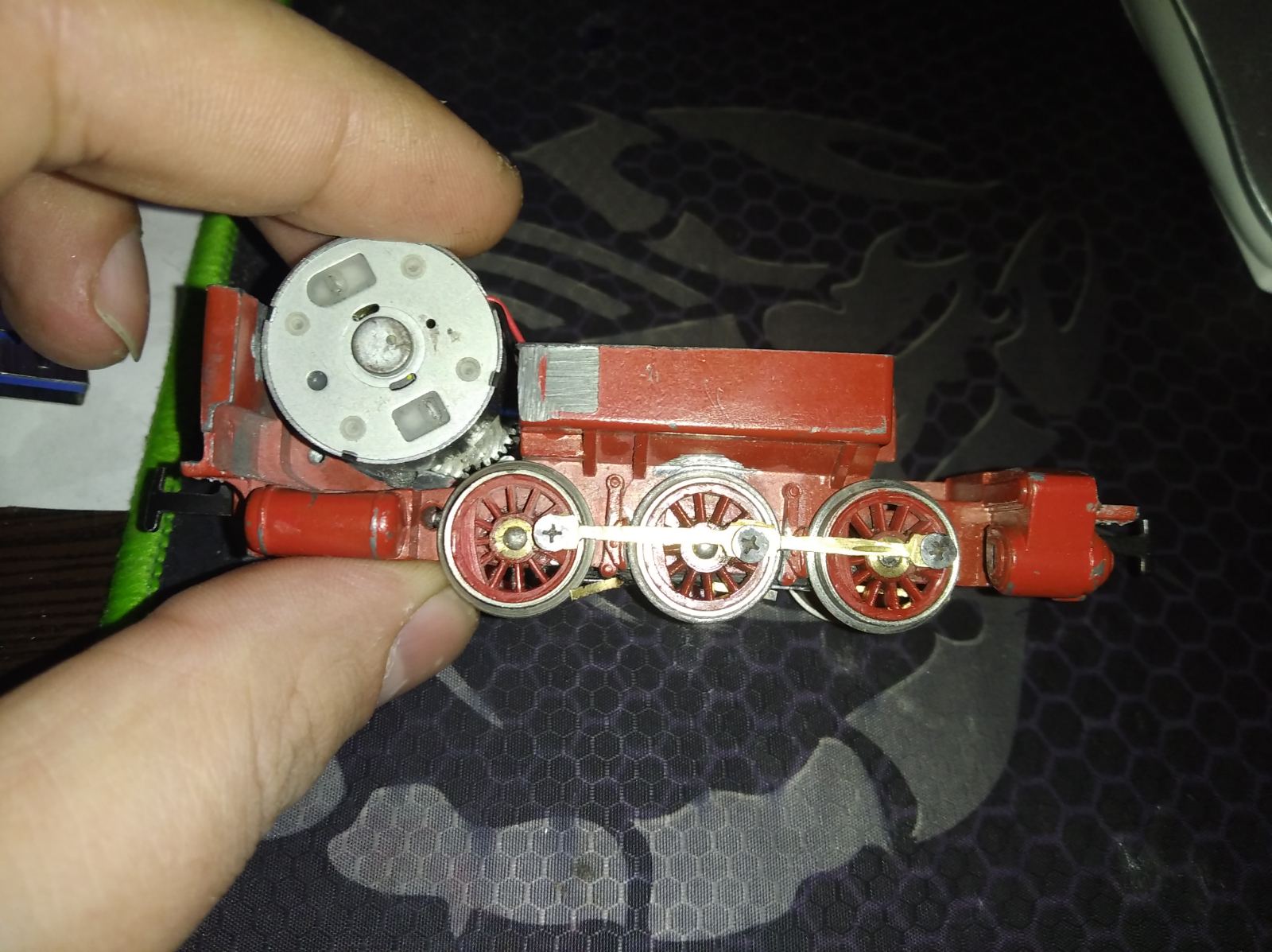 Сразу напишу, что сильно не углубляюсь в детали. делаю на глазок. Ну и второй момент, это минимальный уровень шума, дерганья и прочих помех при приводе на одну ось для данной модели, что мне довелось добится. Основной проблемой тут является вертикальный люфт, который марклин заложили в центральную ось. Потому модель временами немного виляет попцом, а вторая проблема, шестерни редуктора запрессованы и менять их смысла не вижу, не в данной модели. Тому "маємо, що маємо", ну и не забываем, что привод через шестерни как для модели с толкающей передачей, через дышла, довольно капризен, то есть двигатель в отличии от привода с червяком, чувствует каждое задевание и малейшую нагрузку на колесо и соответственно появляются рывки. Сюда очень хорошо был бы привод через червячную передачу, но опять же, не вижу смысла.