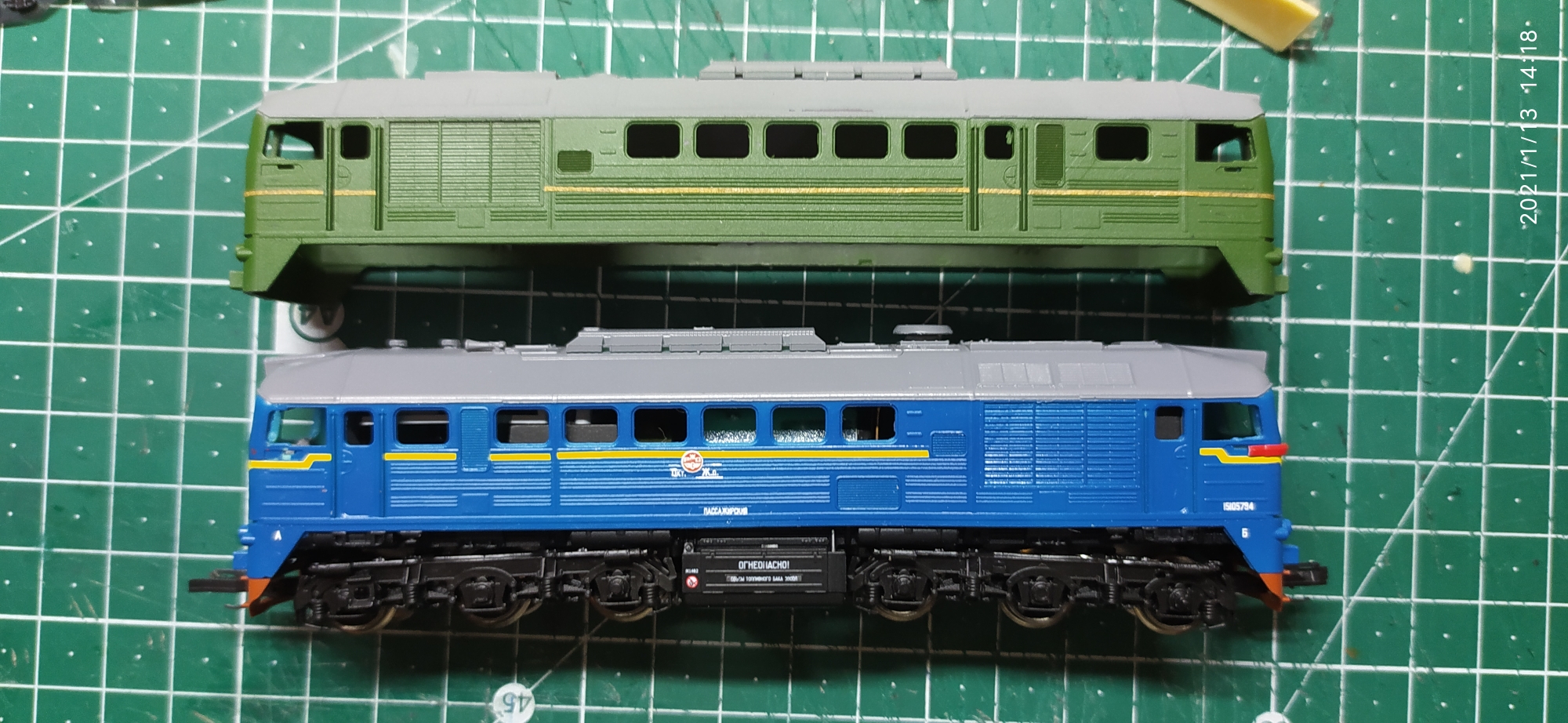 Вот пробы на кошках, зелёный в мате, полоски это лента, почитал, посмотрел, понял что сделал не правильно, надо было место полос дуть жёлтым, затем лента потом основной. Синий глянцем сразу, полосы деколь, пожалуй, на этом варианте наверное и остановлюсь, ну ещё матовый лак поверх нужен. Деки РЖД других нету.