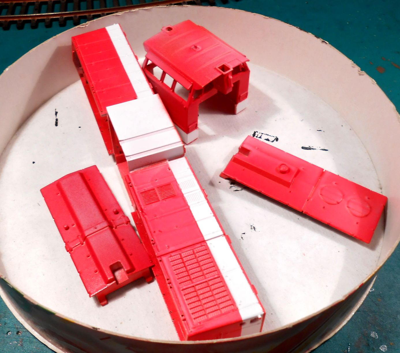 Смотри, я сначала задул кузов белым грунтом. А потом просто замаскировал полосу тонким малярным скотчем и задул в красный.