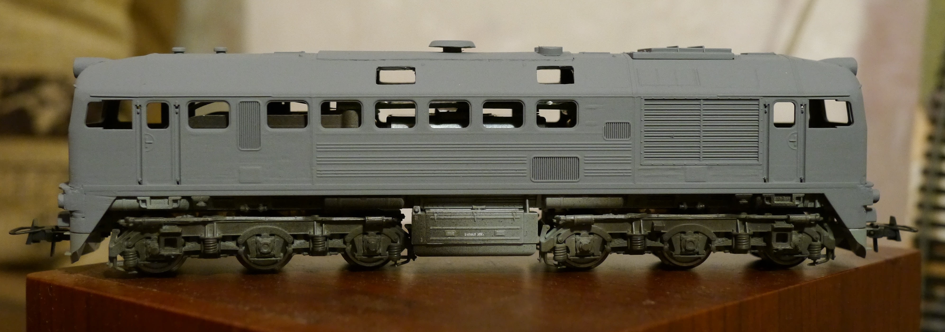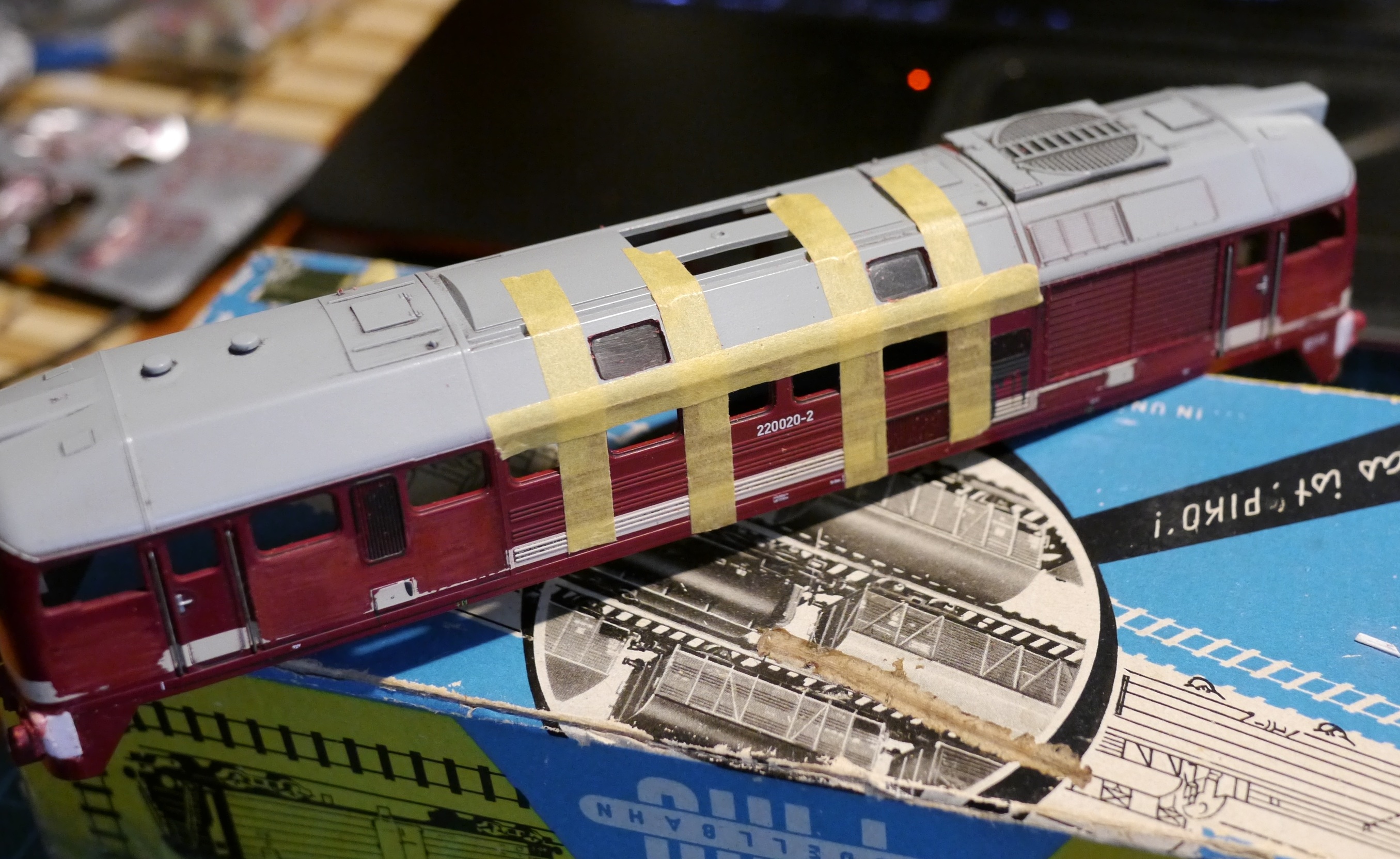 Продвижение есть, но так как я не на даче :) - не такое уж и значительное... Собрал остекление, имитацию дизеля. Вставил буфеные фонарики, наметил малярным скотчем полосу (она будет переделана декалью).