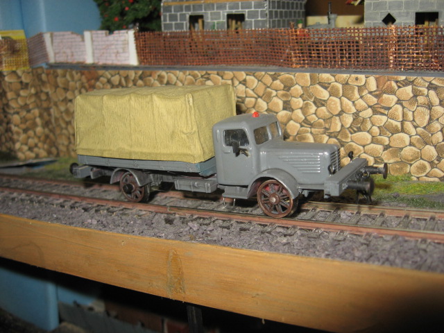 Делалась на основе фабричной модели грузовика. Заменены колеса, поставлены буферные брусы с буферами и сцепки, перекрашена в цвет Вермахта, сделан тент. Модель обмоторена, привод на одну ось, токосъем с двух. Сзади стоит модельная сцепка и можно цеплять вагоны.... хотя лучше цеплять к чему то саму машину... потому как ходовые качества хуже чем удовлетворительные