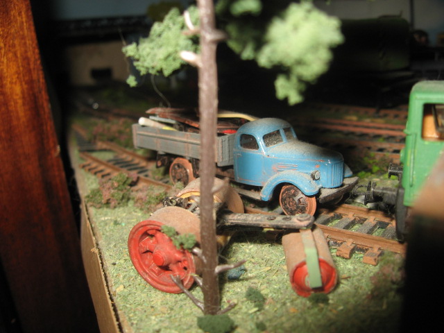 Начав фотать ЗИС на ЖД ходу решил уже показать и его "соседа", мотовоз МГ1. В основном это перекрас модели от Лилипут с небольшими изменениями. Пытался использовать его на маневрах в депо, но из за плохого токосъема мотовоз был отставлен от работы, отправлен в тупик где и стоит уже не один год. Там он отлично вписывается в тематику макета