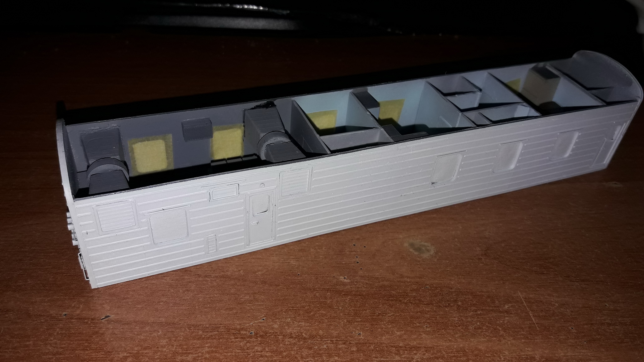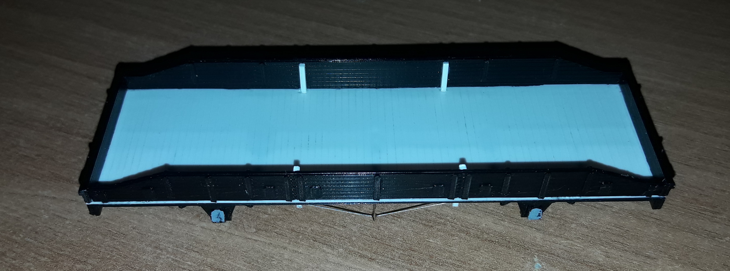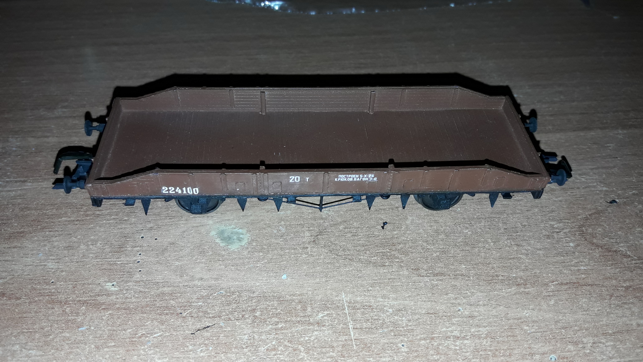 Платформа почти закончена, напечатаны и установлены динамические механизмы, окрашена, частично обдекалена. Дело осталось за колпарами, буферами и крюками. Ввиду того, что буфера и крюки слишком мелкие для FDM печати, то придется либо использовать готовые, либо пытаться напечатать фотополимером.