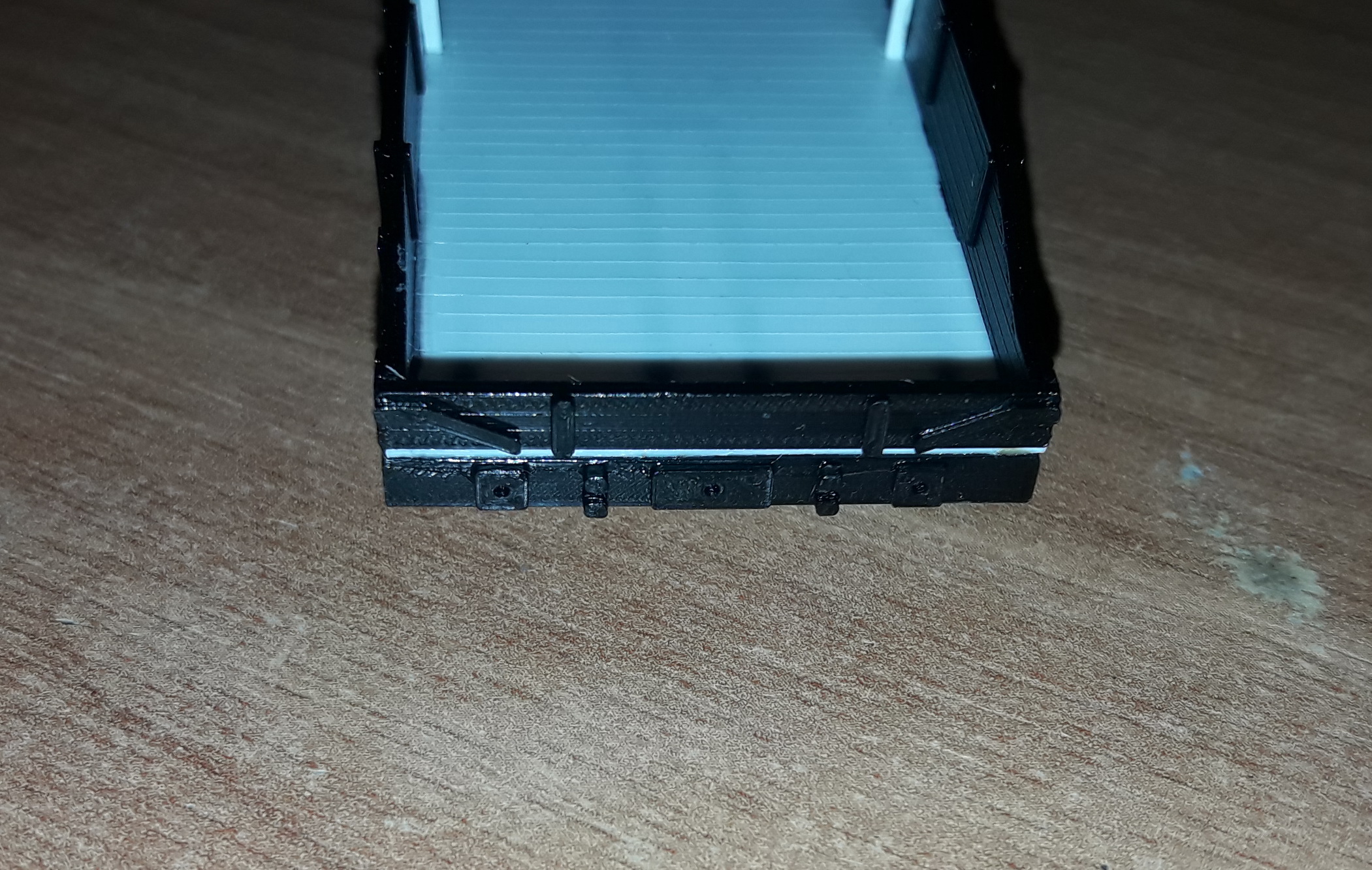 Все печатается горизонтально. И все раздельно. Рама отдельно, буксовые узлы отдельно, рессоры отдельно, отдельно борта, причем каждый борт отдельно из двух продольных половинок, склеенных затем вместе. Печаталось все так, чтоб лицевая поверхность (обращенная кнаружи) при печати была сверху, качество при этом наилучшее.