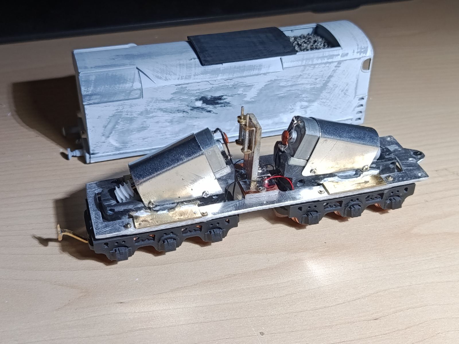 2-3-2 обзавелся тендером, осталось дождаться 2х двигателей из Китая, а то остался только 1. Ток в тележке через изолированные полуоси на корпус. Просто, компактно и надежно.