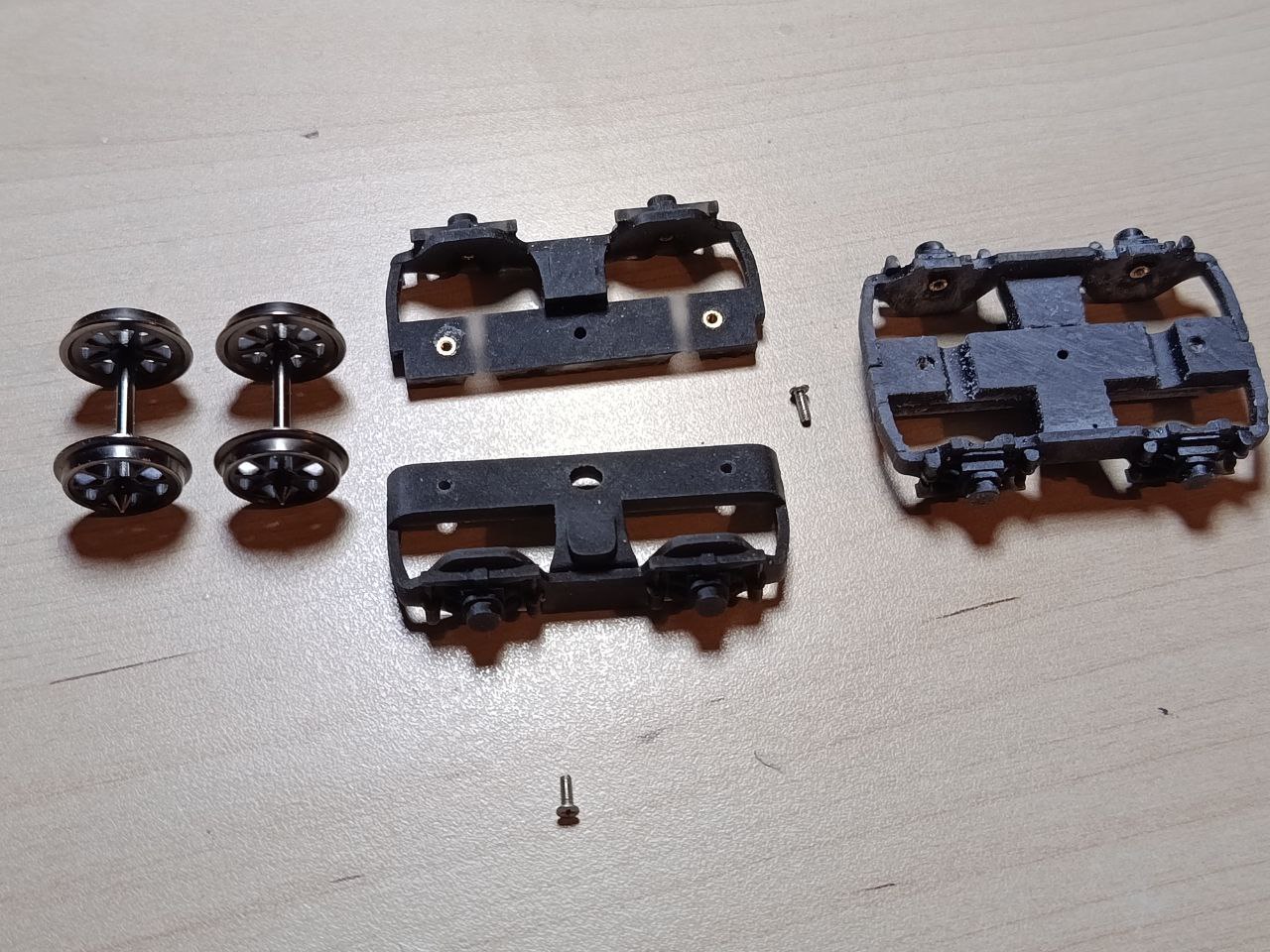 Подумал что в самом паровозе нет смысла делать как обычно трущиеся контакты на ободах основных колескак обычно делал, раз у меня передняя и задние тележки под напряжением (там китайские полуизолированные колпары). Надо просто на шкворень провод накинуть, одна тележка будет плюсом, другая минусом, без лишнего сопротивления качению от контактов