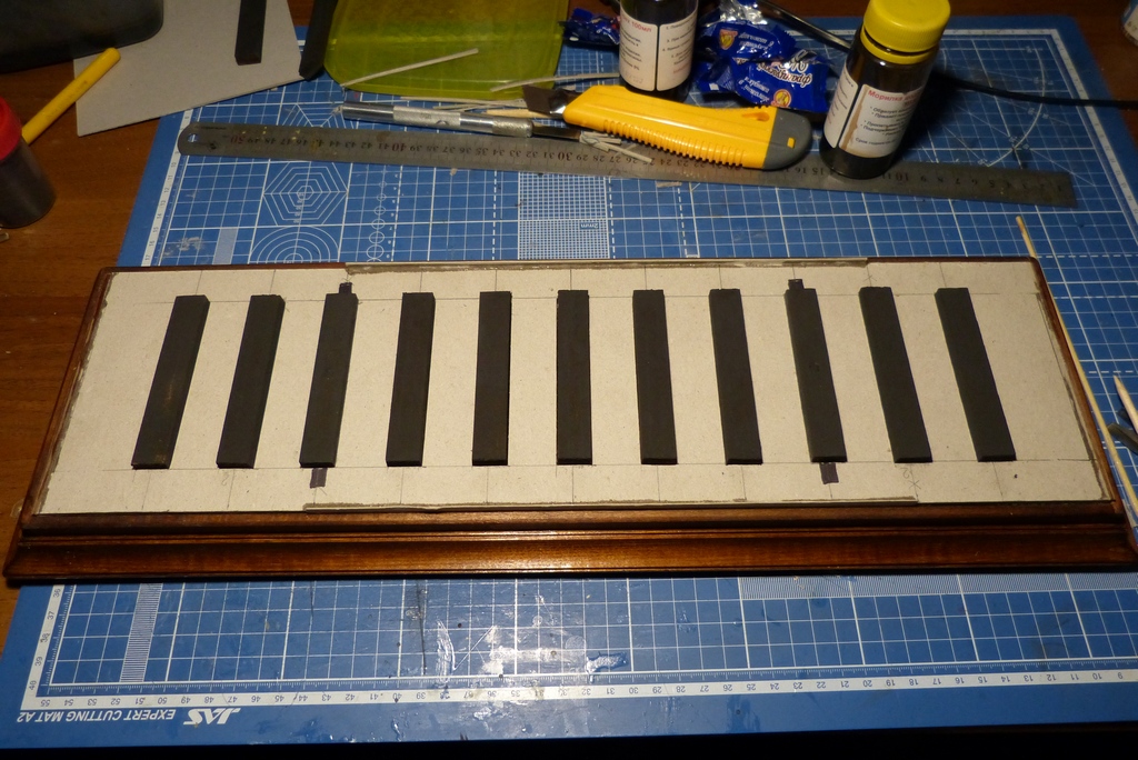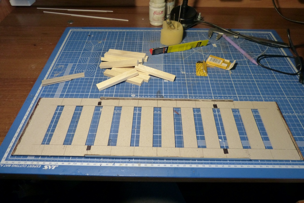 Был чуть занят и решил от мелочевки отдохнуть,напилил шпалы,сделал шаблон направляющими для шпал,просверлил зеркало,наклеил на основу , вклеил в подставку , установил шаблон и шпалы, третья шпала с каждой стороны со штырьком,в последубщем шпалы соединяться с рельсами и крепление и полотно будет съемным,такой опыт уже есть с паровозом Саламанка.