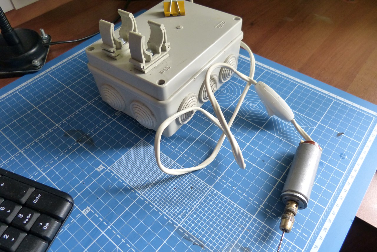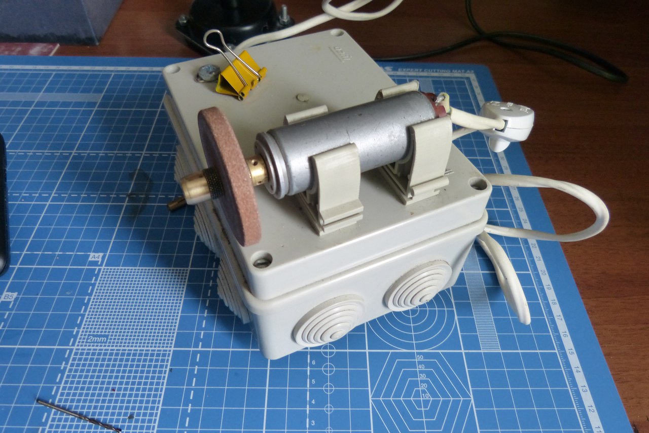 А точильце вот такое,это моторчик 27v от печатающего устройства СМ6337 я уволок еще в 1988г. с нашего ПО "Счетмаш",там понижающий транс и диодный мост,теперь когда появились всякие штуки я все спрятал в монтажную электрокоробку,для того чтобы использовать как точило прикрутил клипсы для пластиковых труб