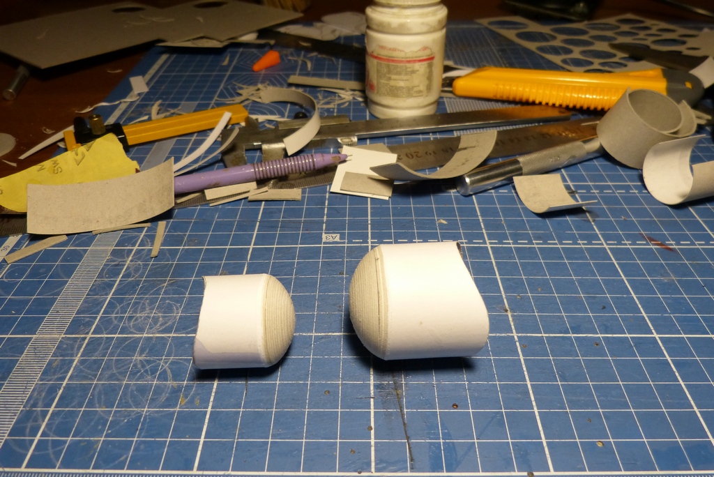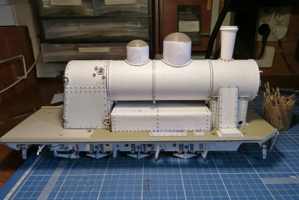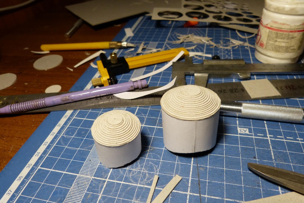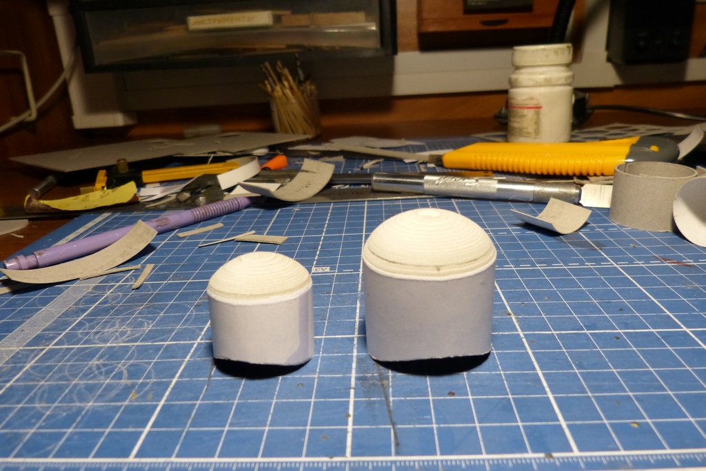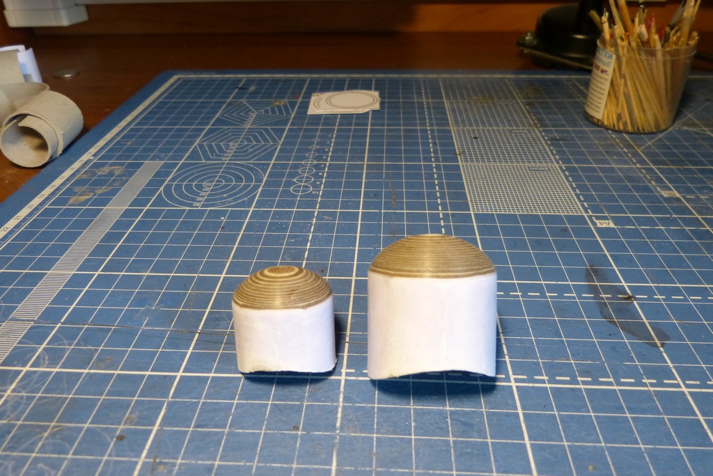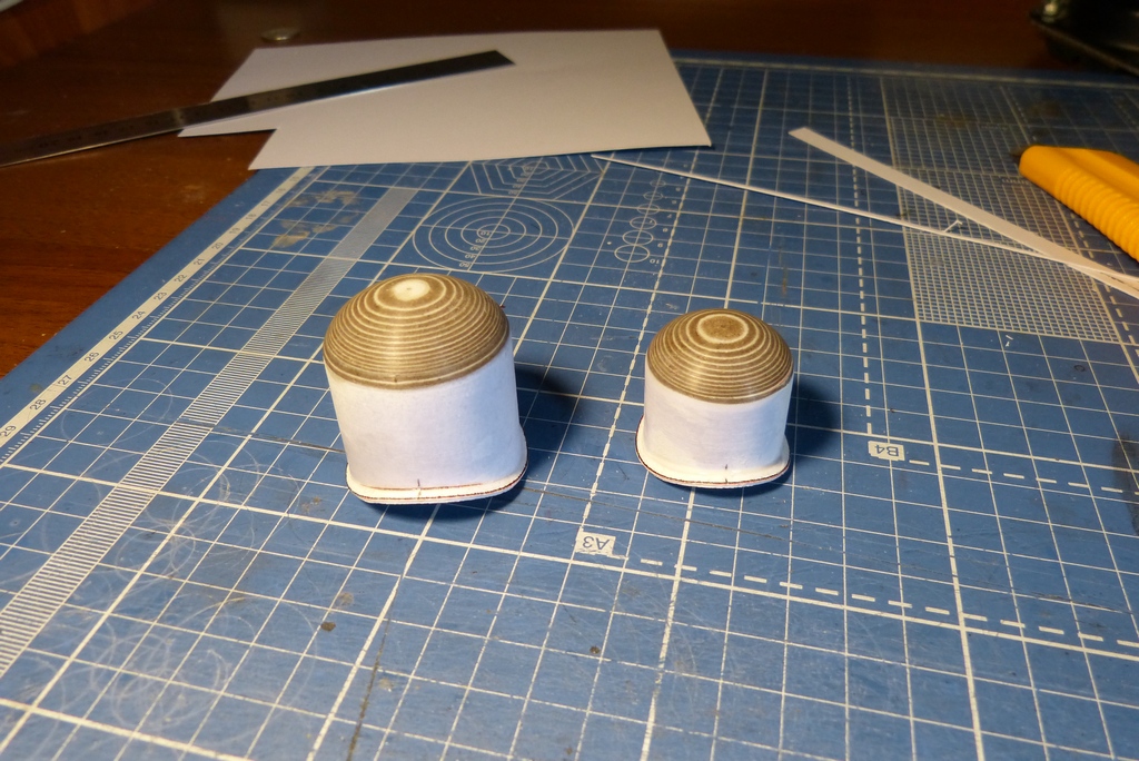 Ну вот крупняк закончился,Сделал колпак сухопарника и питательный колпак.Чтобы придать нужную форму нарезал кружочков и приклеил получилась такая пирамидка,потом на шуруповерте с помощью приспособы зачистил и закруглил,потом пропитал суперклеем финальная шлифовка,получилось как задумывал,установил на котел и примерил все это сооружение.