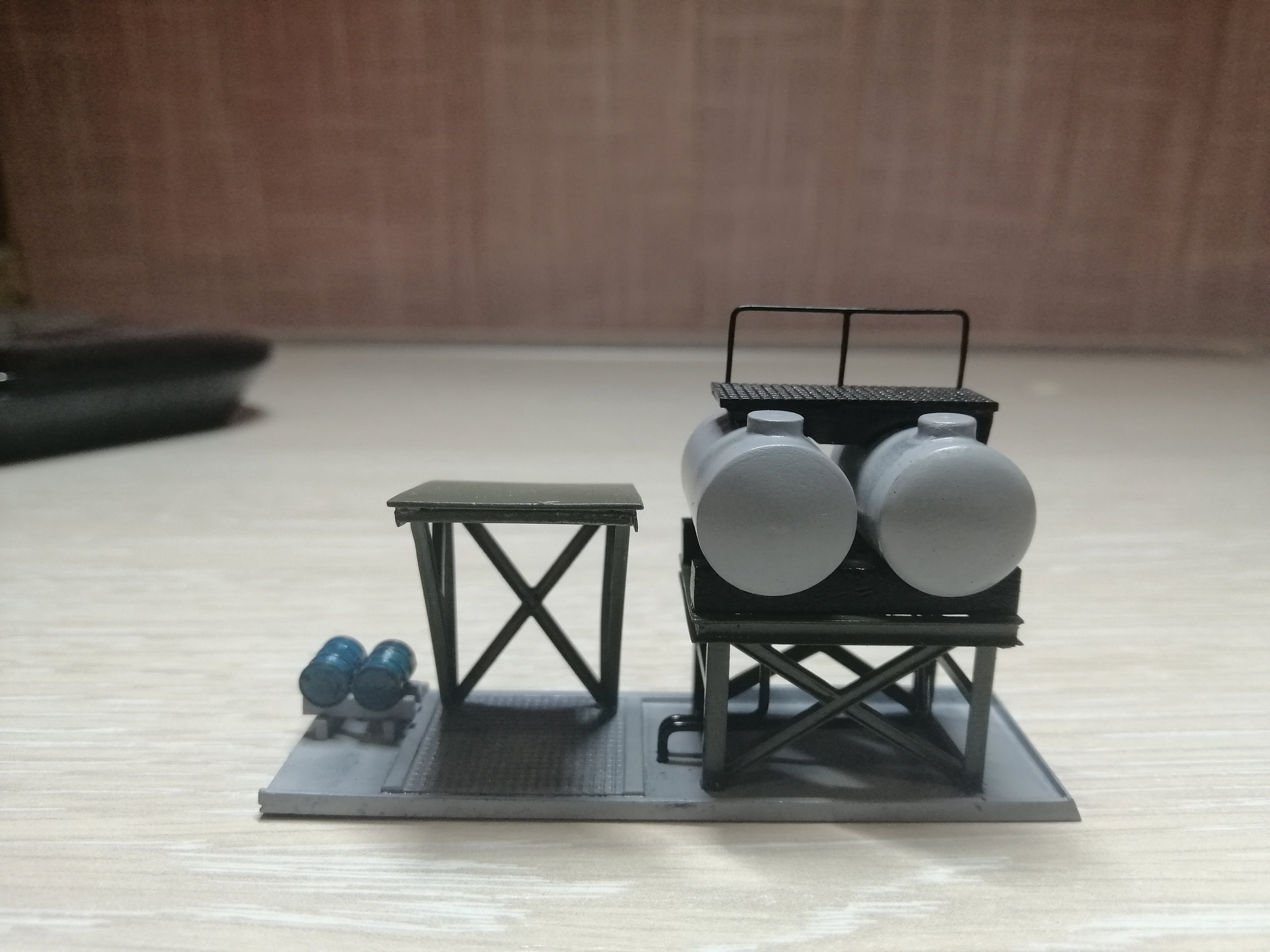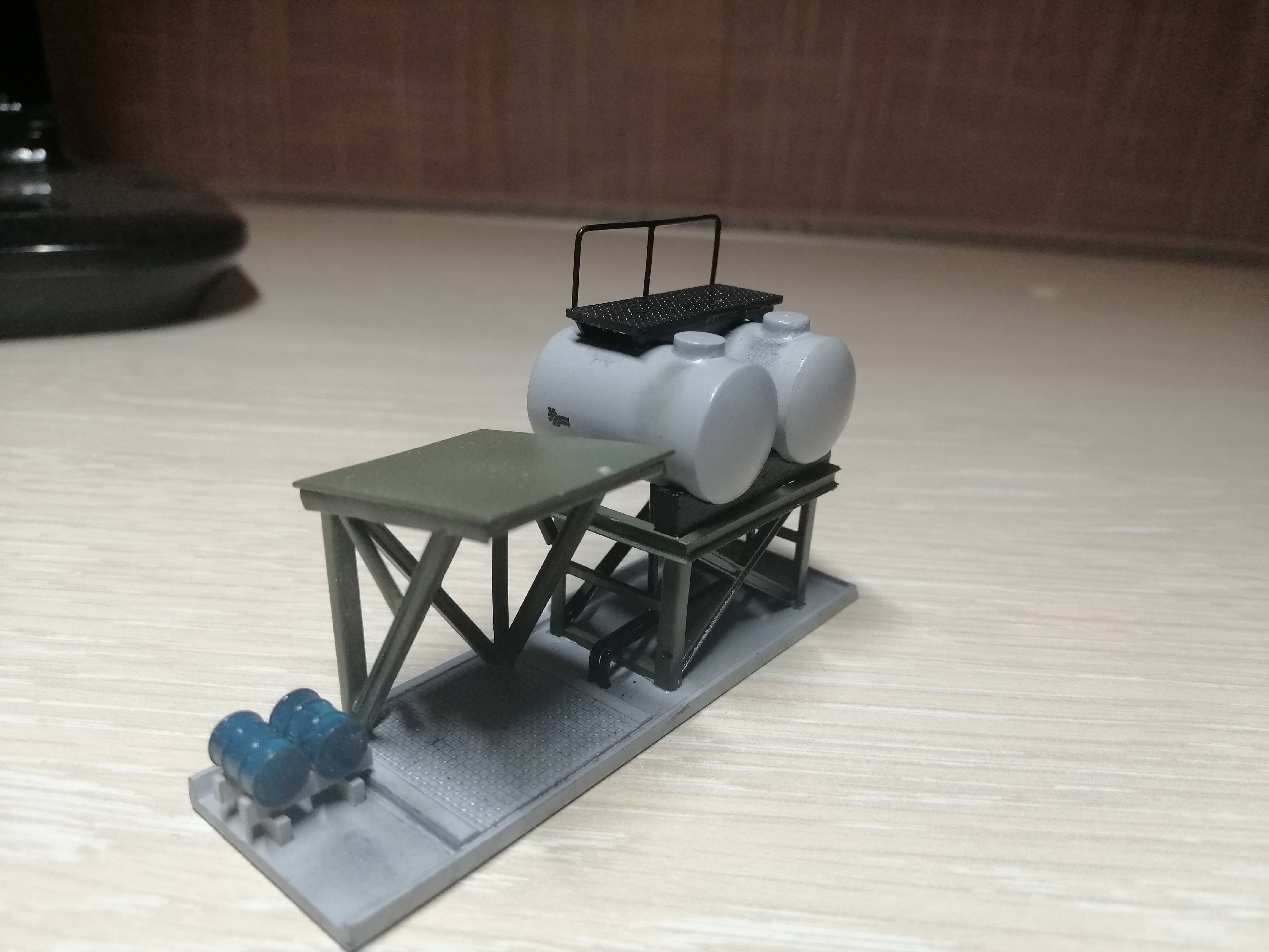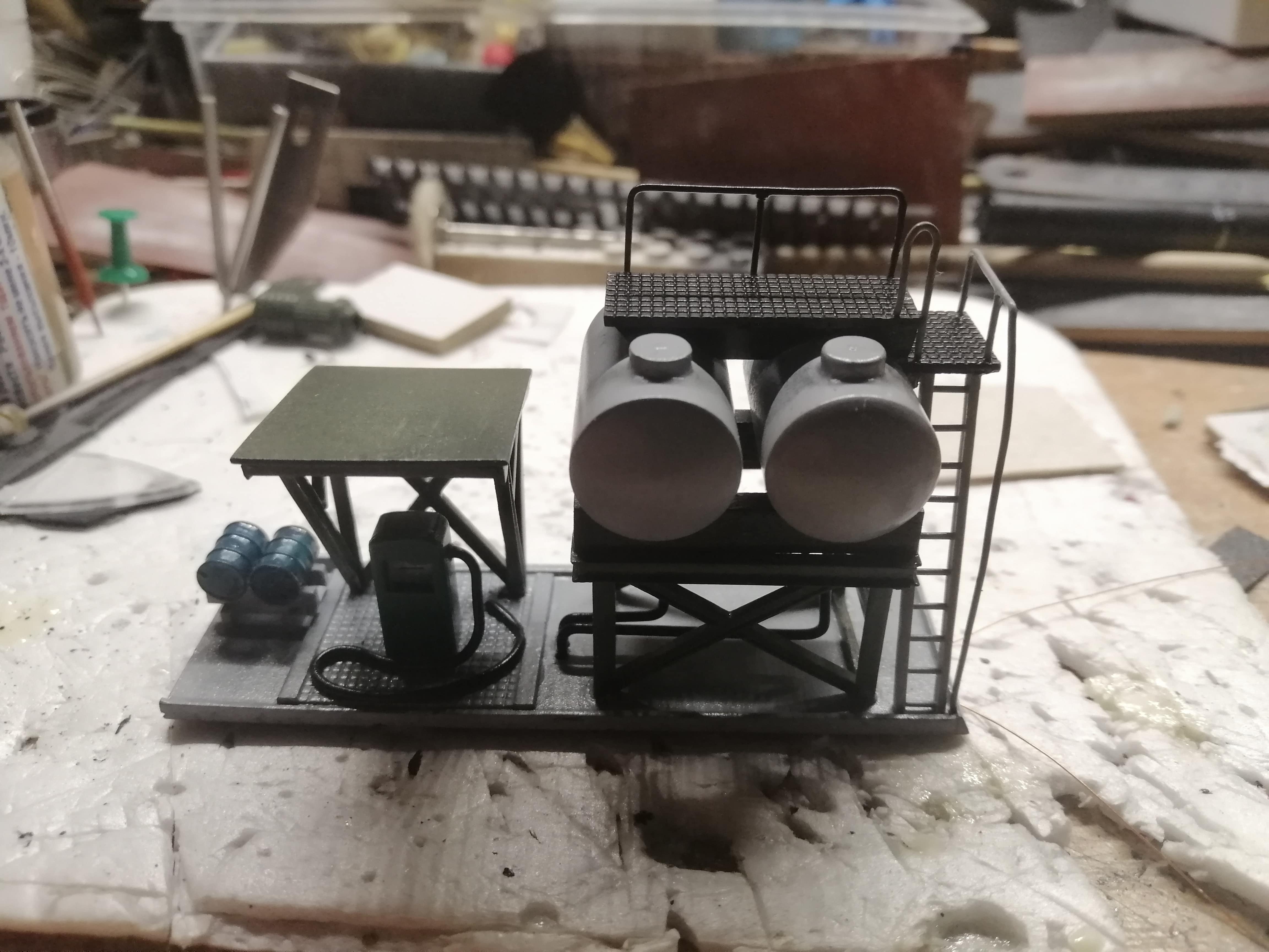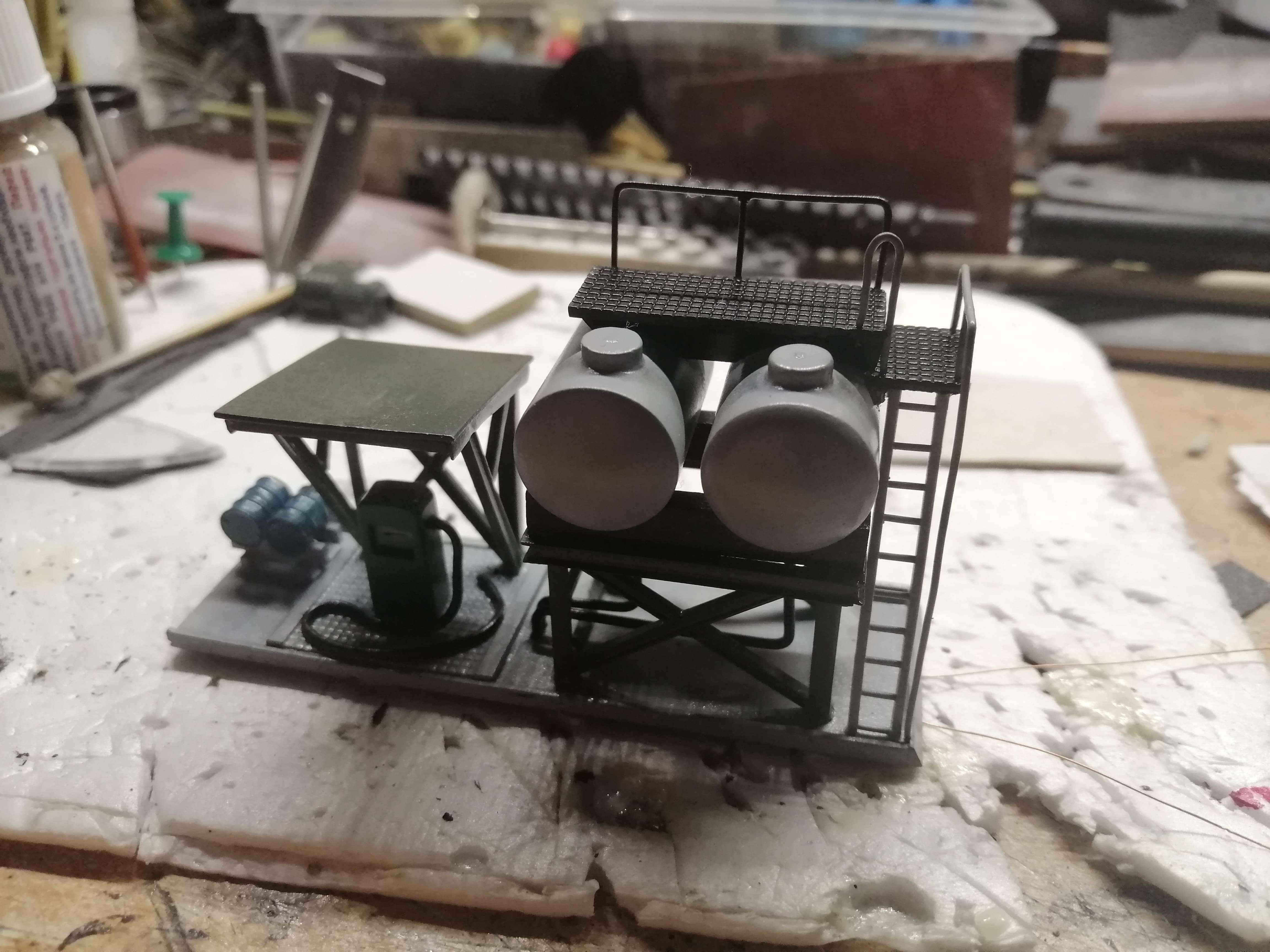 Получилось викроїть пару годин. Продовжив маленьке будівництво. Зробив трап з перилами на цистерни . присобачив як аксесуар підставку на пару бочок з мастилом. За бочки окреме спасибі Тарасу (wildTarik) На сьогодні все. Осталось психануть і зробить саме нудне - драбину на трап. Ну і щоб муза залишилась чаювать - бо ще робить колонку, рубероїд на кришу ну і світло- куди ж без нього.