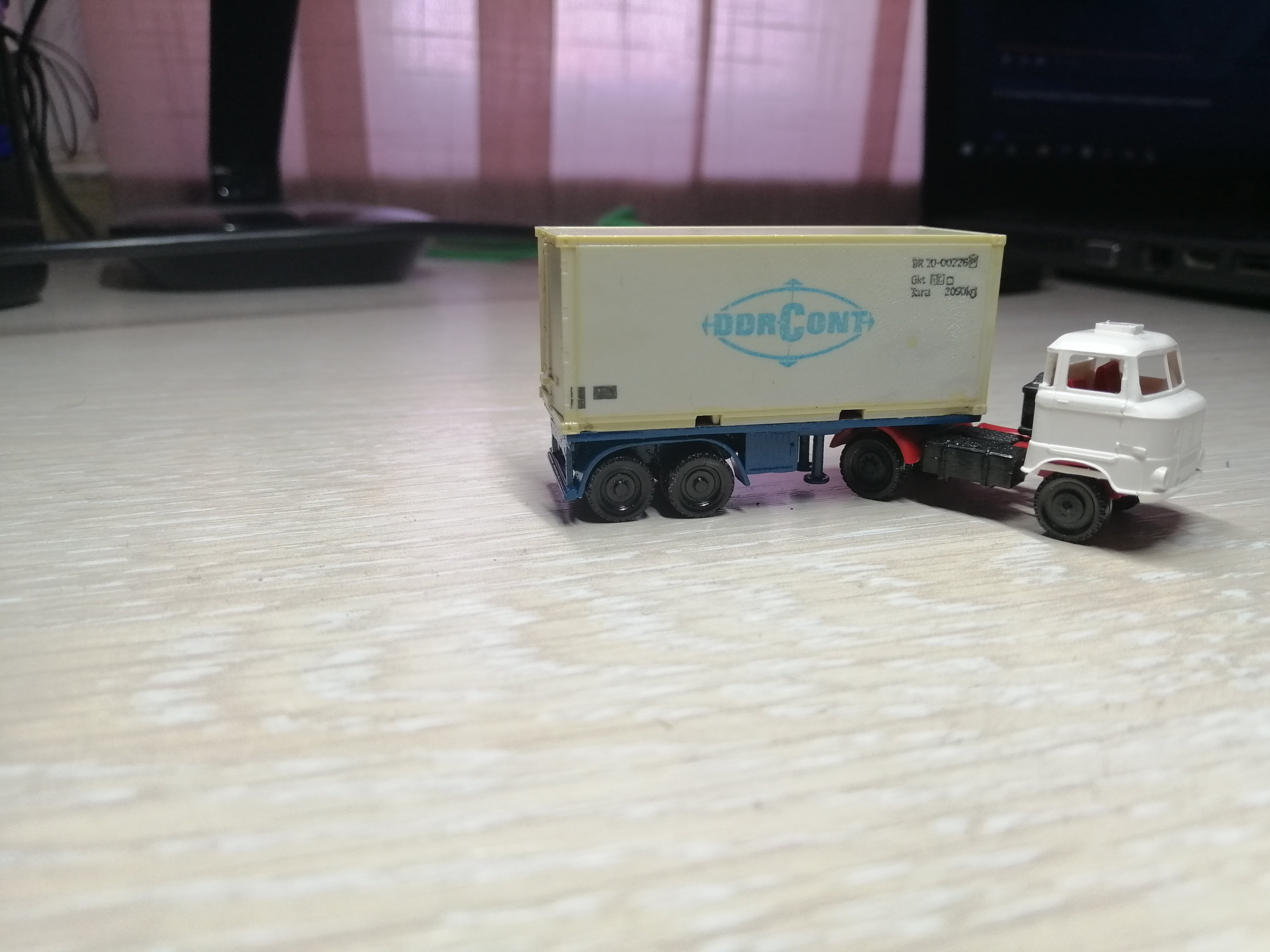 Кузов с надписом - це колишня дискетка от флопи диска "доведена напильником"до потрібної форми. потім пофарбована. декаль - 5середніх букв слова з якоїсь польської деки приблизно 35 маштаба. По "легенді"- абравіатура якоїсь частної лавки. ВИБАЧАЙТЕ - але на питання щоб купити німецькі деки в ТТ..... - букви того місця називать не буду. Ми ж моделісти - інтелігенція