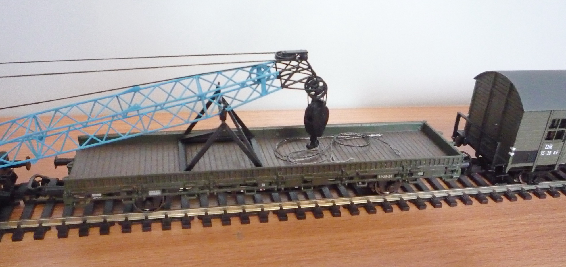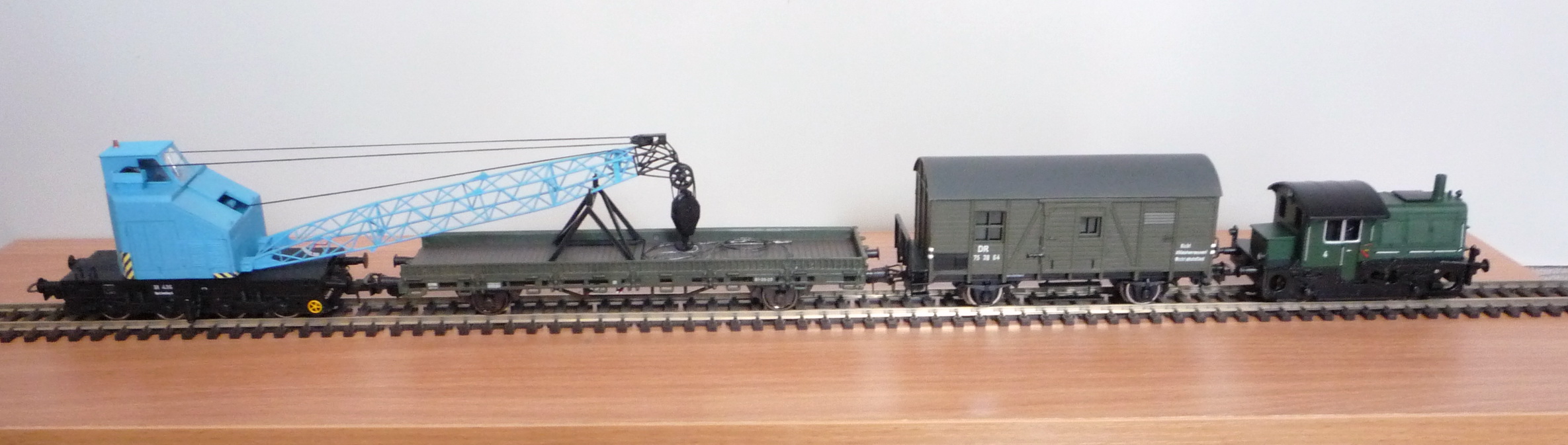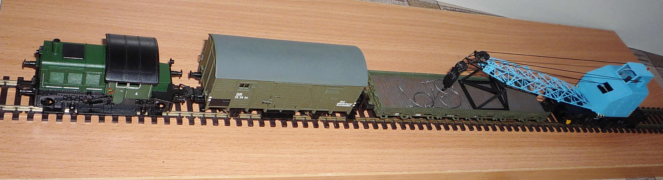 Подкрановая платформа от KIBRI. Перекрашена и доделана. Старому PIKO тоже нашлось применение: Тягловая сила - восстановленный стариннейший лок ROCO: В итоге получился вот такой состав: