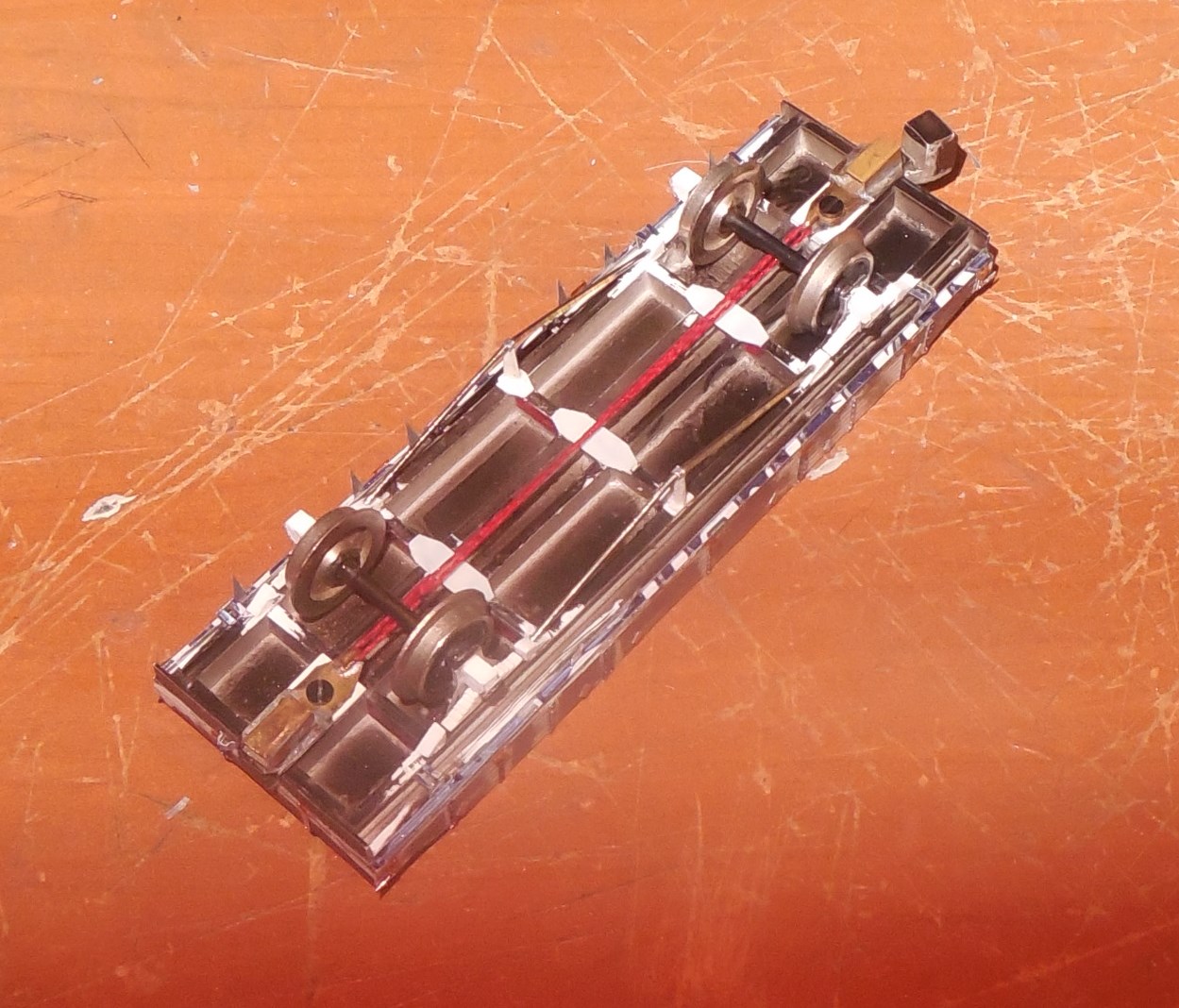 поставил торчащую к нам половинку. токосьем на латунных полосках к тыльной стороне колес т.к. там чисто всегда.