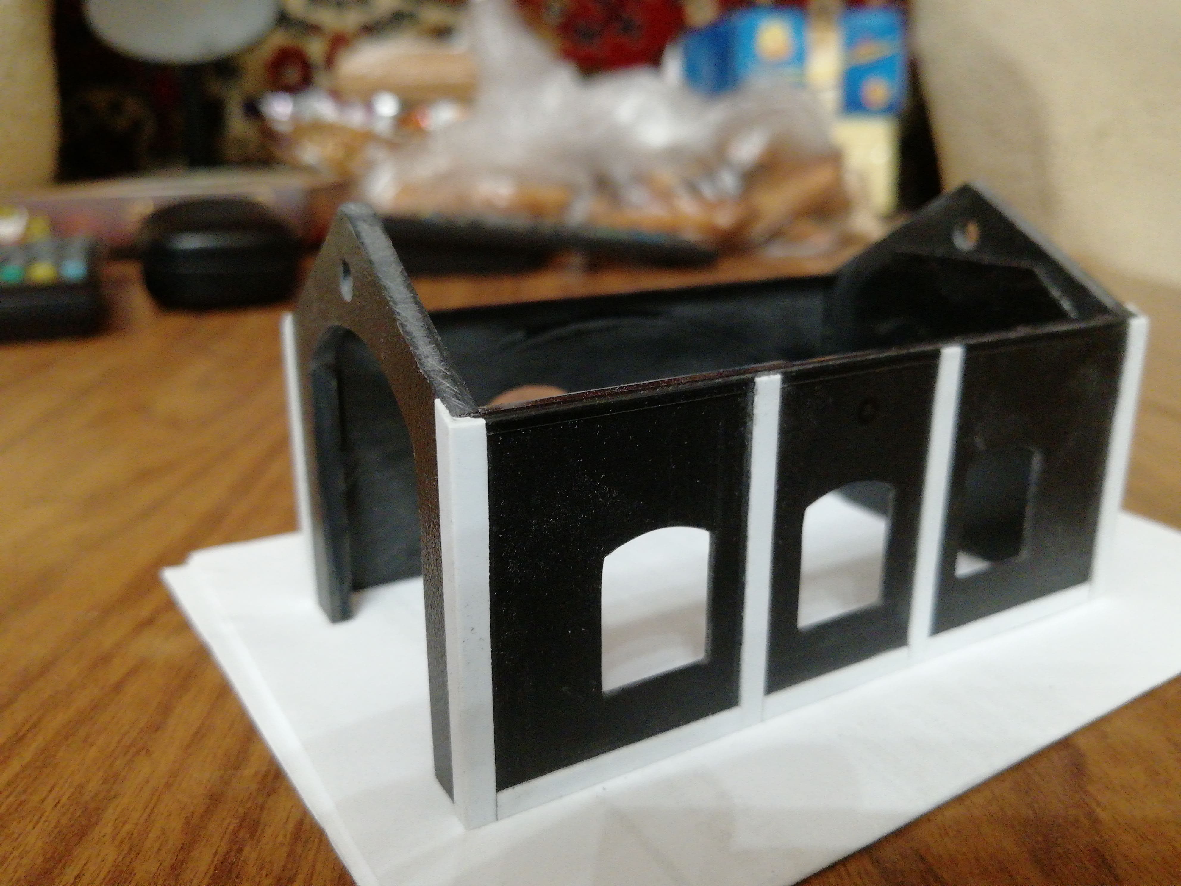 Поки драбинку непаяв. Зате "муза" навіяла нову ідейку для тех. поста. Начав пилять -гномики допомагали. І так. дві коробки від компакт дисків і народились стіни для сарайки для мийки тиском котлів і промивки якихось там труб на паровозах (я не спец в данному питанні) Знайомий просвітив що зазвичай були відкриті площадки з високими шитами вдоль рельсів щоб миюча хімія не летіла по всому депо. але інколи зустрічались різні навіси або сарайки. густо заляпані ржаво-біло-сіруватими маслянистими плямами. Поки що вийшло таке Сарайка трохи помотивна - не робив бокову пристройку щоб не був широким.