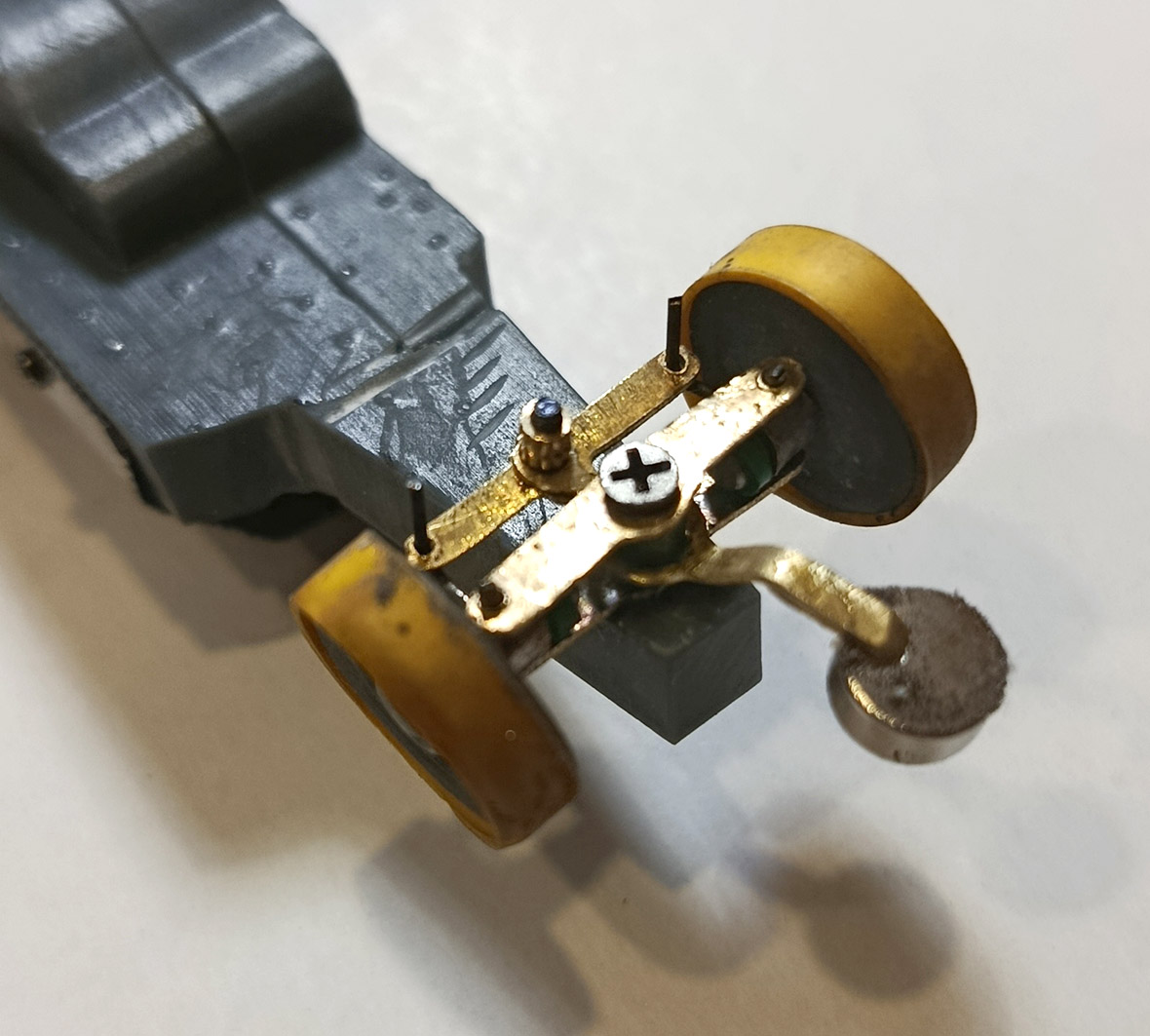 Некоторое время я подумываю сделать какой то аналог системы, где ездят машинки в H0. И вот попробовал сделать функциональный макет Faller car system что б посмотреть будет ли работать и какие есть трудности. По изготовлению рулевого ориентировался на это видео с некоторыми изменениями https://www.youtube.com/watch?v=riehhgKlRwo. В размерности автобуса Я-6 сделал шасси. Так как двигатель скоростной n20 на 3v, то поставил понижающий редуктор, а не как обычно делают напрямую через червяк, та и не должен древний автобус быстро ездить. Смоляные колеса конечно имеют плохое сцепление, поэтому поставил шины из термоусадки. С двигающей частью вопросов как раз не было, работает как задумывалось. Ожидаемо сложнее всего спаять и собрать рулевую часть. На наполуоси может быть трудно подобрать трубку, которая будет вращаться довольно плотно, что б не болталась. На видео как ездит по кругу на листе 2 мм ПВХ, под которым кольцо обычной вязальной стальной проволоки 1,2 мм. Так как мотор на 3 вольта, а акум на 3,7, то на видео шасси ездит раза в 2 быстрее чем должно, если поставить резистор https://drive.google.com/file/d/1sTOD45 ... sp=sharing