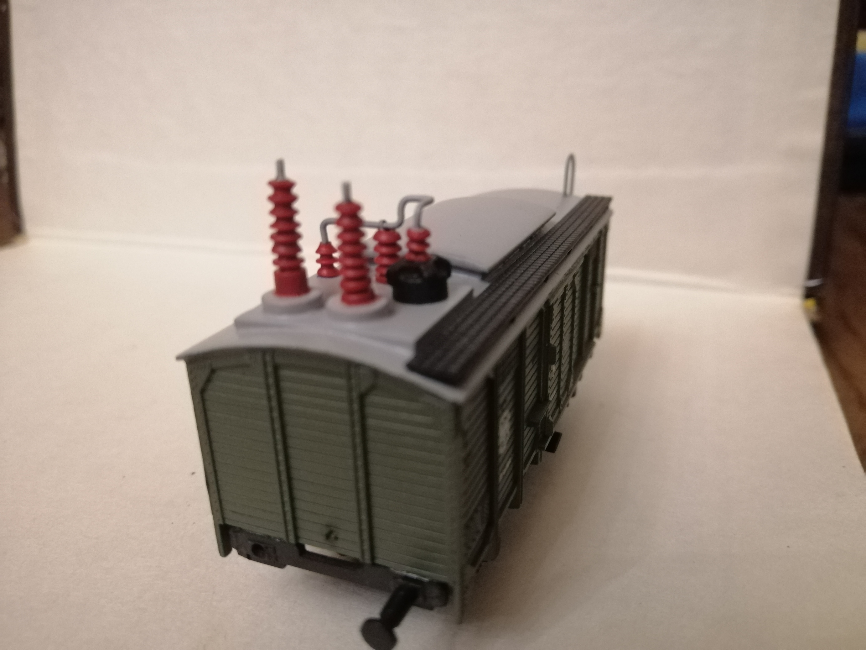 Сломаные буфера решил не востанавливать просто рассверлил дырочки-будем считать немцы сняли на свои нужды. Такие вагоны всеравно годами стоят в тупиках. За выходной сделал кузов-трап надсройки на крыше из тех же дискет и покрасил. Пол ночи из литников точил изоляторы