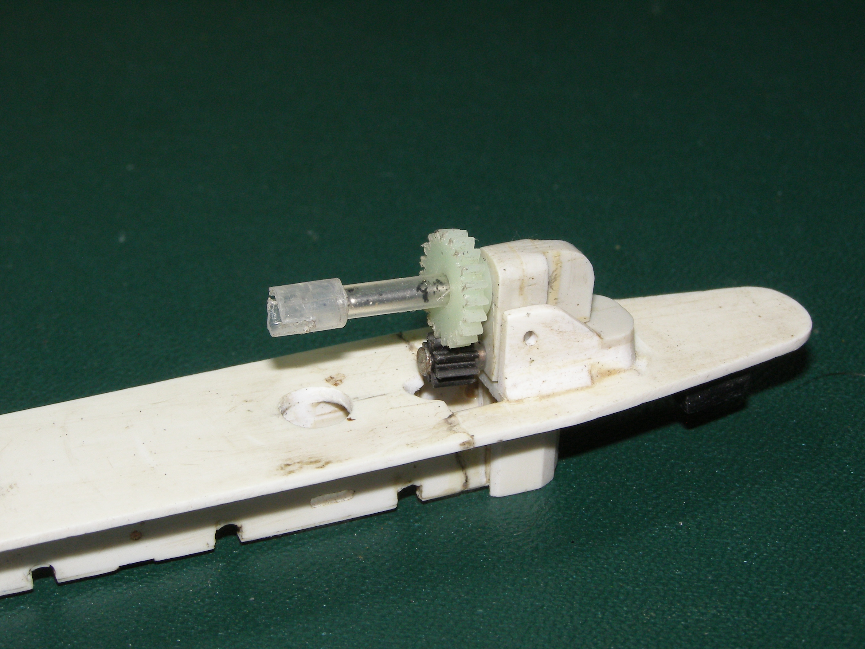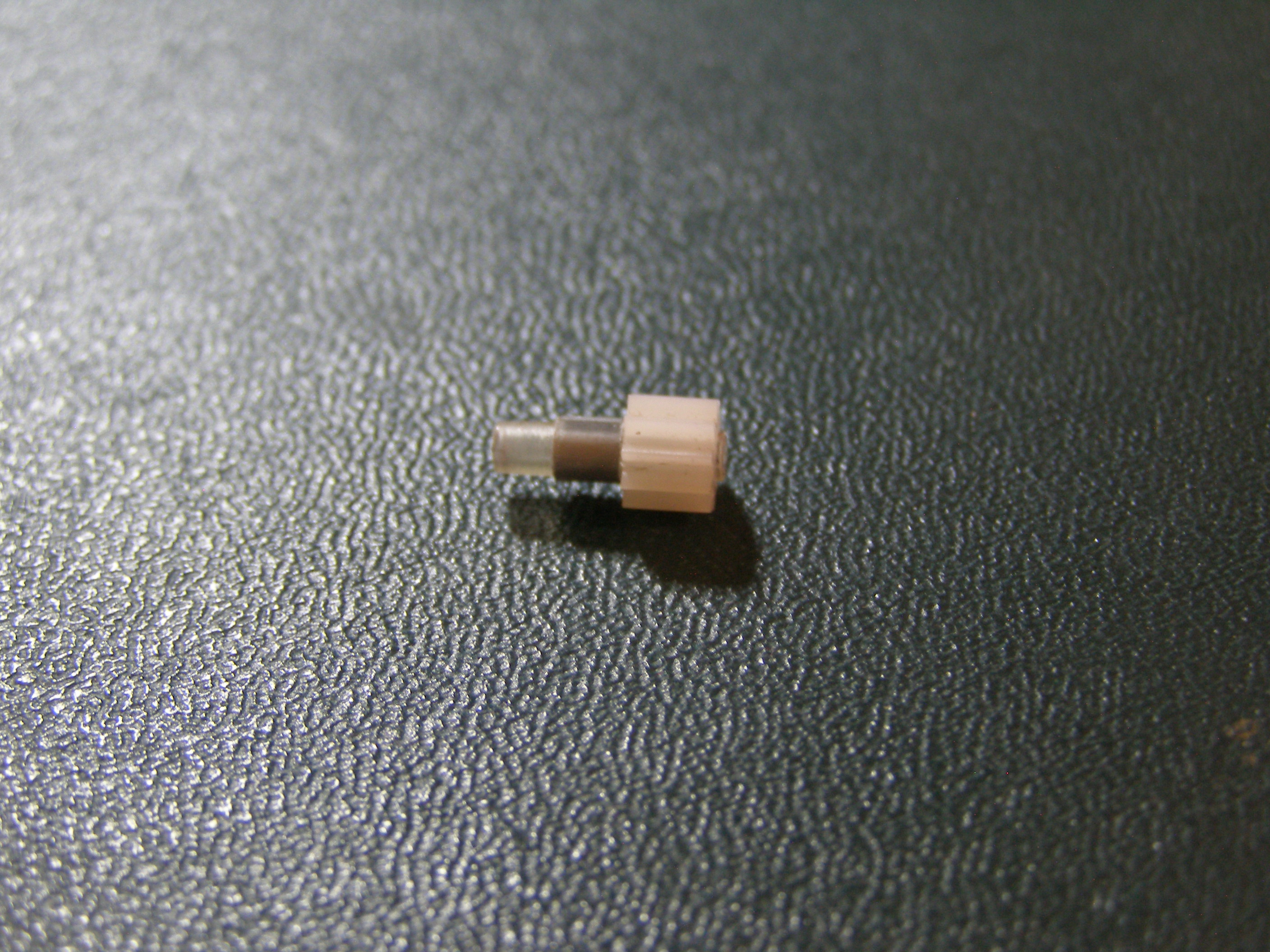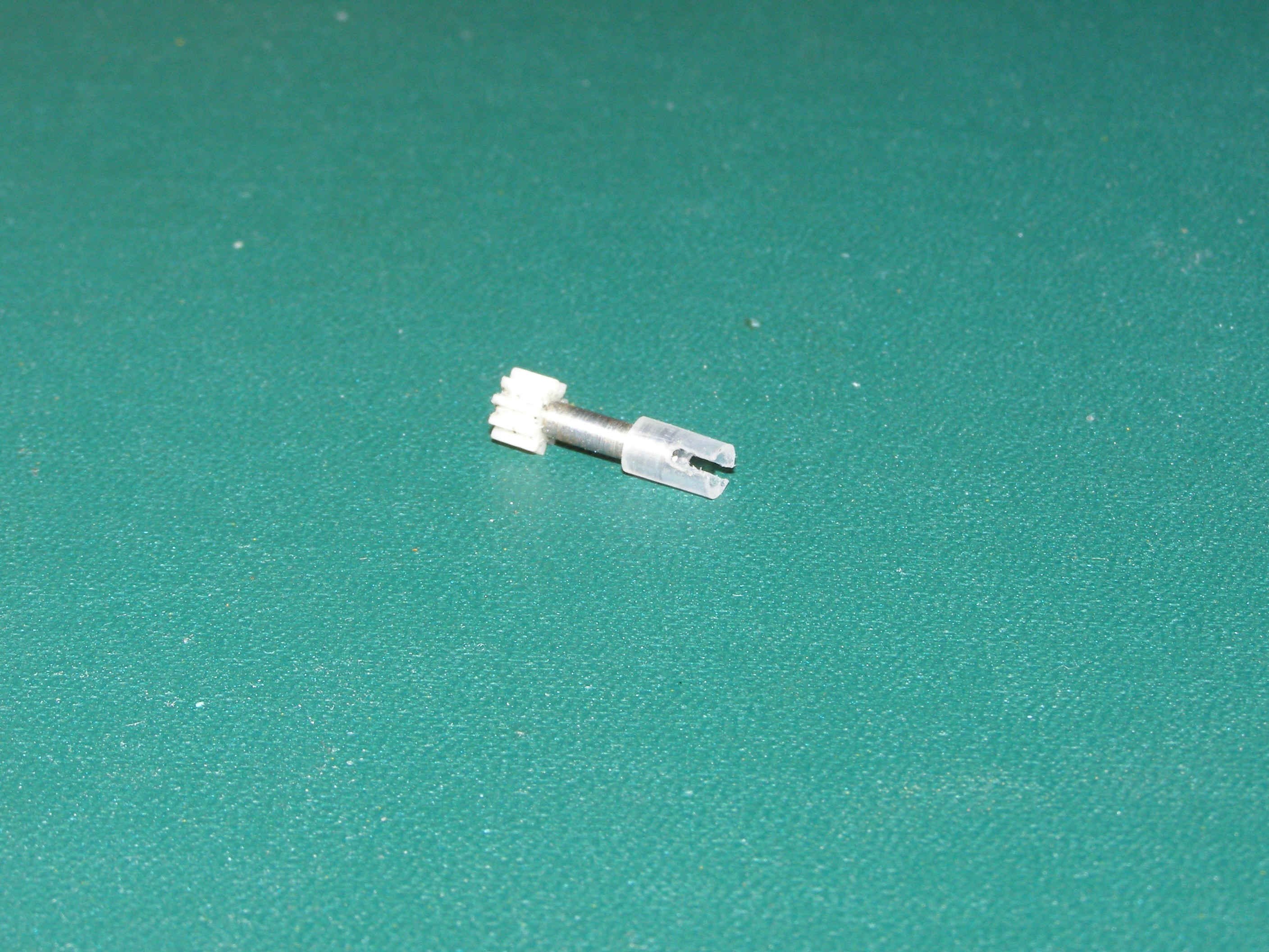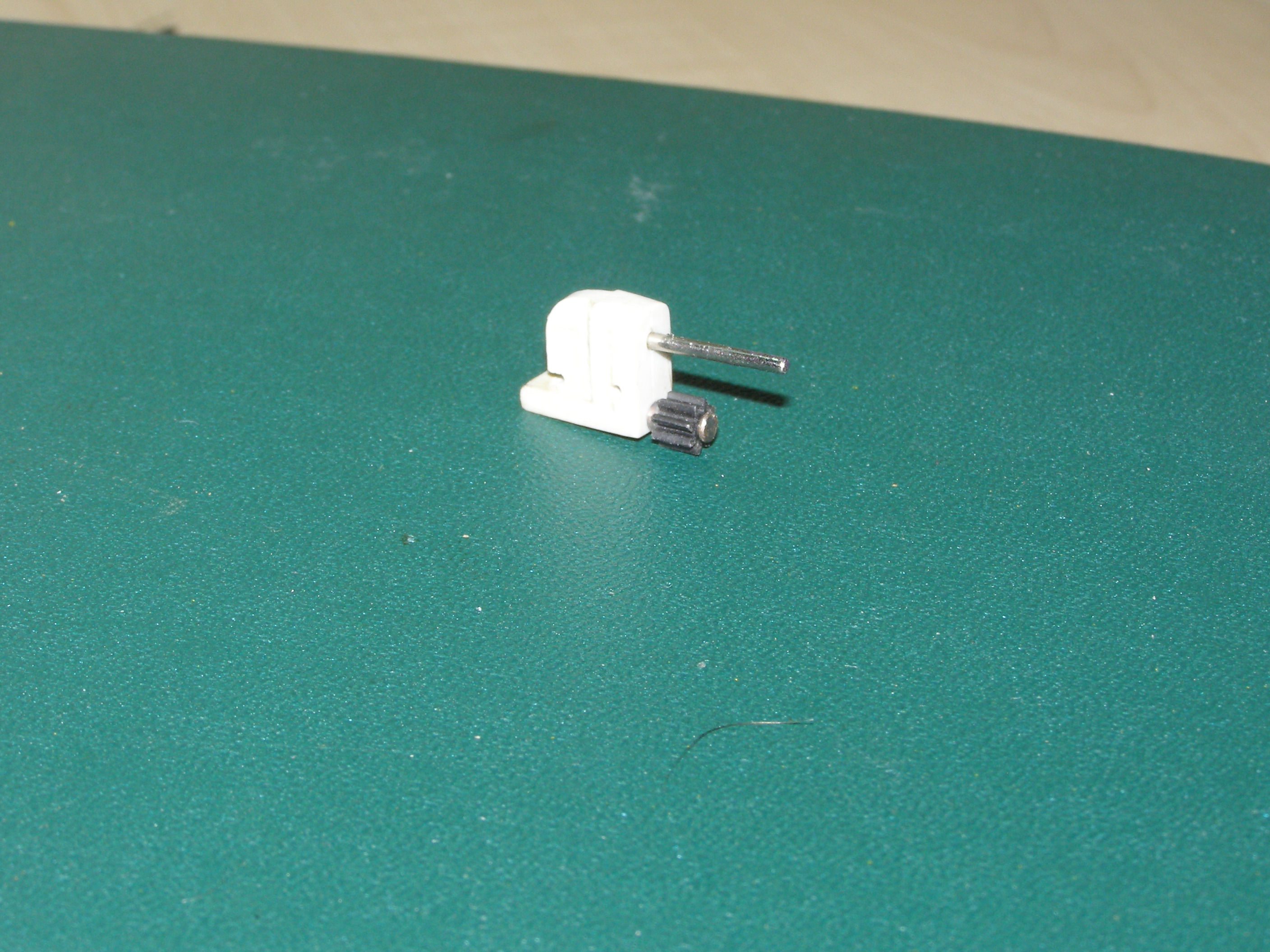 На его конец одевается стакан с прорезями для кардана. Вал сделал из стержня от ручки,но он не выдержал испытаний - на нем плохо держалась шестеренка и на больших оборотах при трении на металлической оси нагрелся и немного поплавился. Все было без смазки, пробовал работоспособность. Со смазкой может и работал. Но хорошо что так получилось. Заменил его на металлическую втулку. Получилось вот так