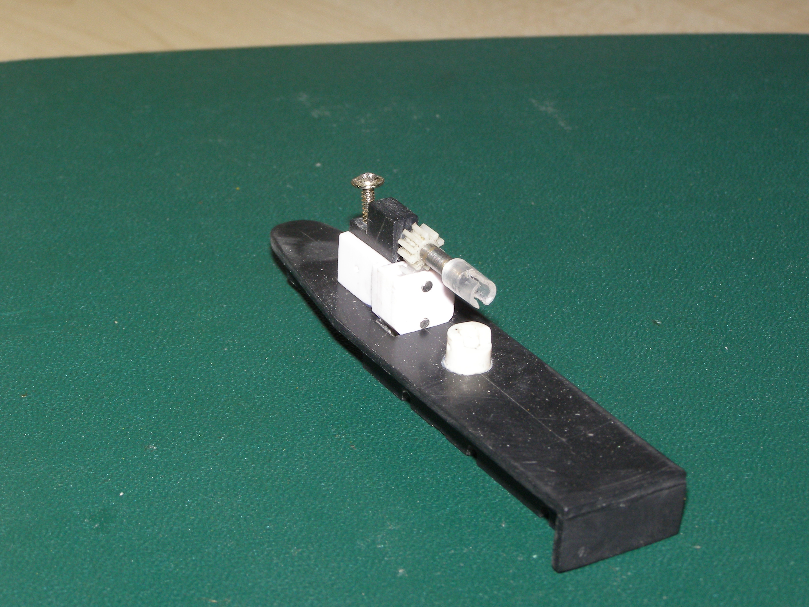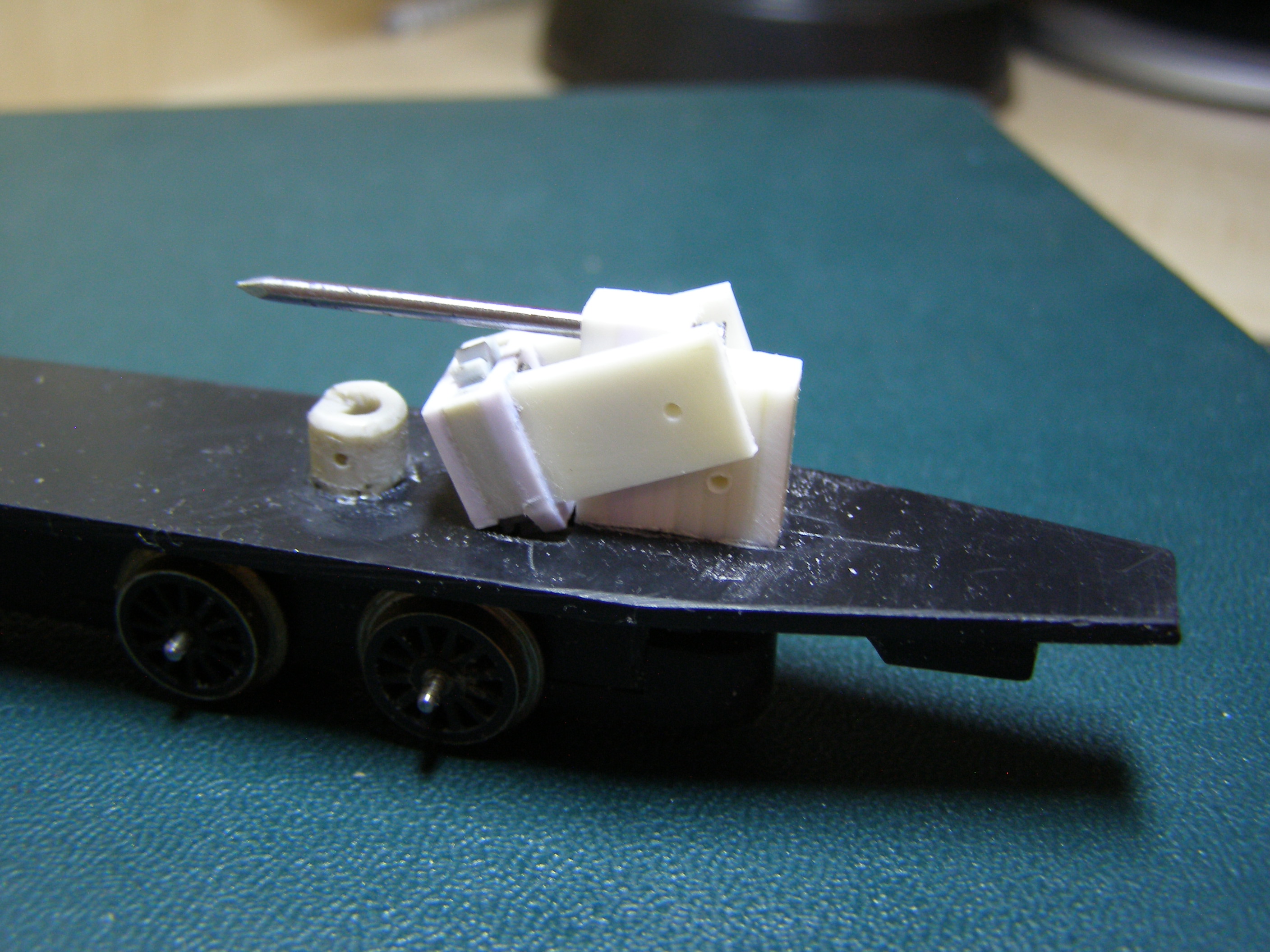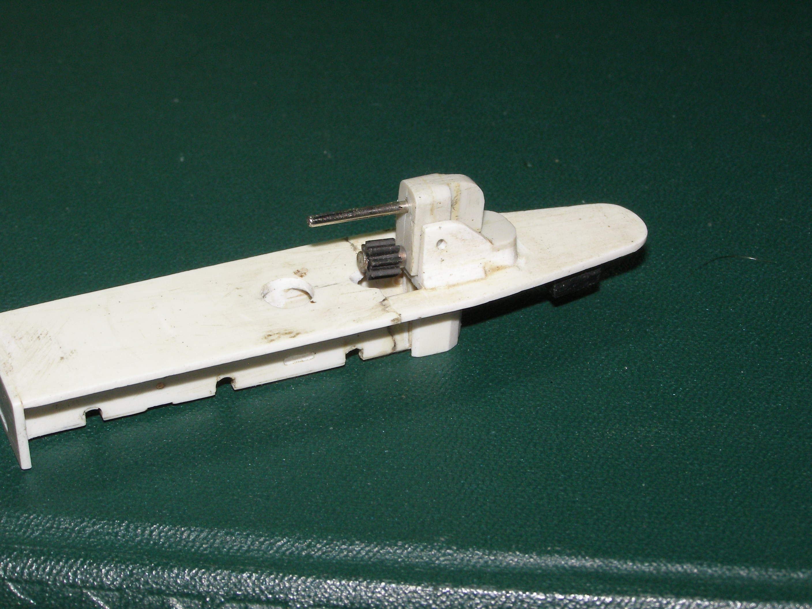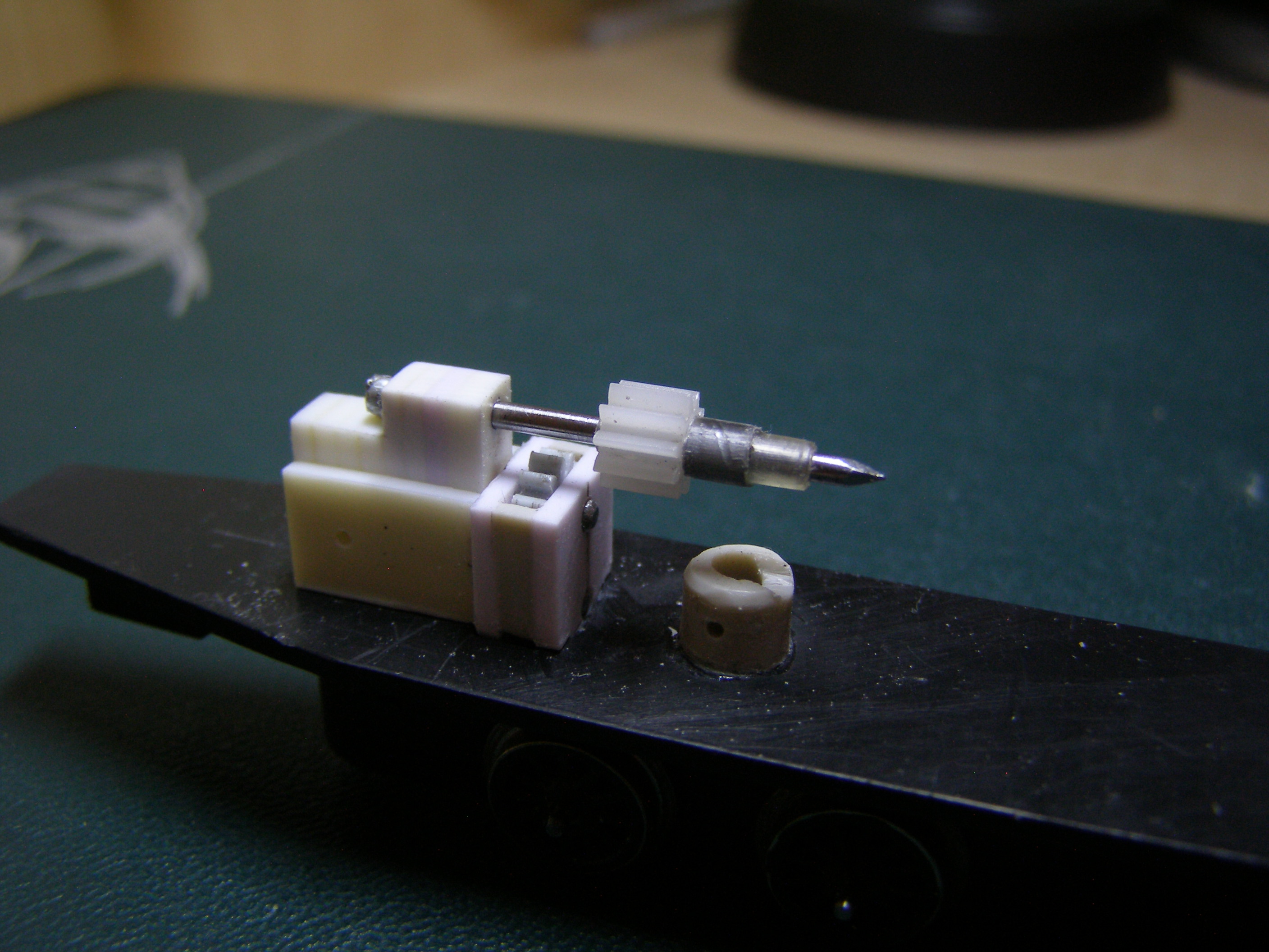 Приклеил стойку с осью посередине рамы тележки, при этом стакан надетый на приводной вал должен был находиться на одной оси (по вертикали) с осью вращения тележки - грубо говоря над дырочкой в оси. Это нужно для того чтобы при вращении тележки кардан нормально вращал вал, т.е. чтобы получился шарнир. На фото приводной вал без стакана,но его можно представить. Ось была обрезана по размеру. Теперь последовательность установки редуктора, который к стойке будет крепиться шпилькой в отверстие. Редуктор сел плотно, ничего не болтается и не клинит.