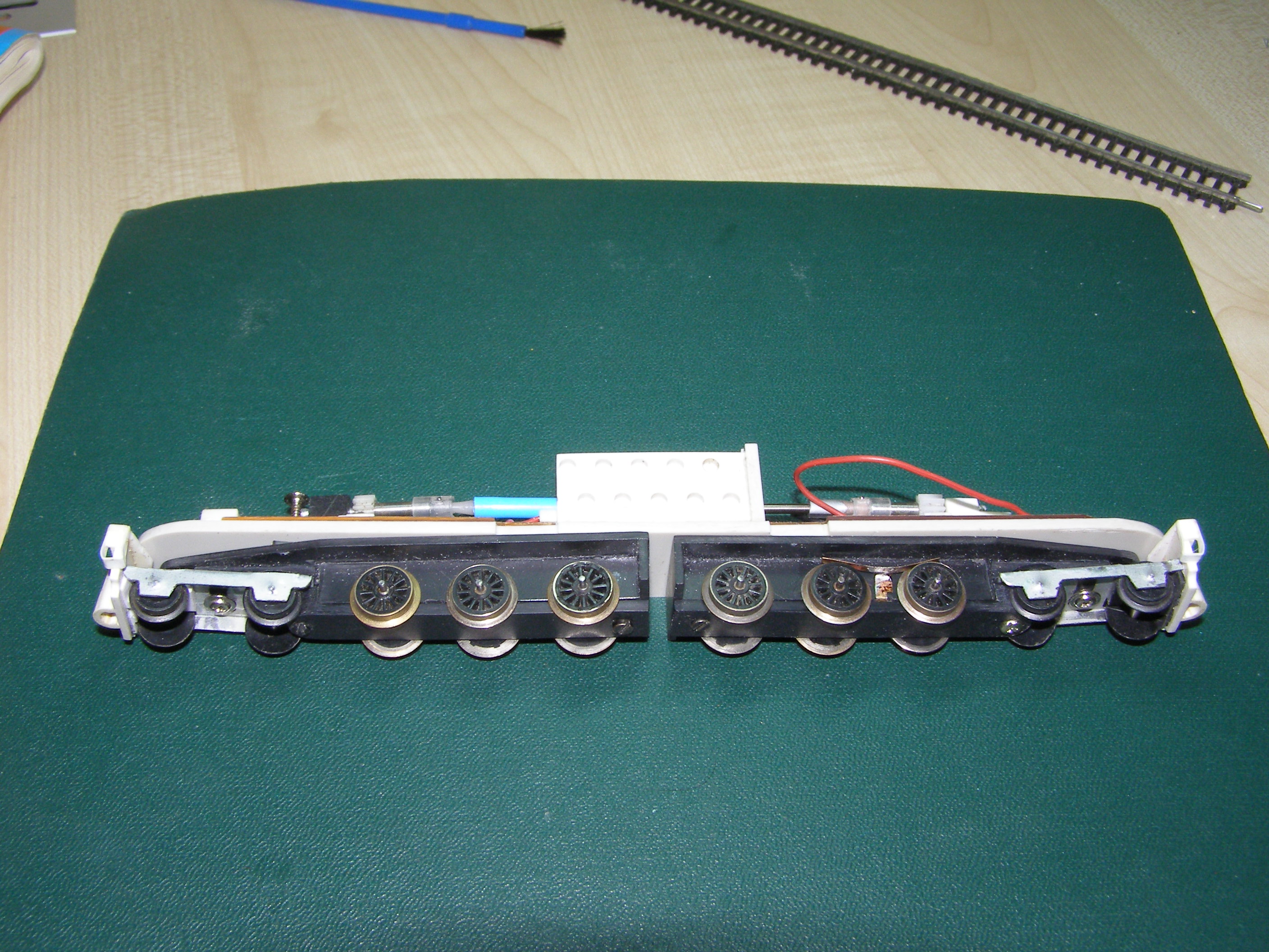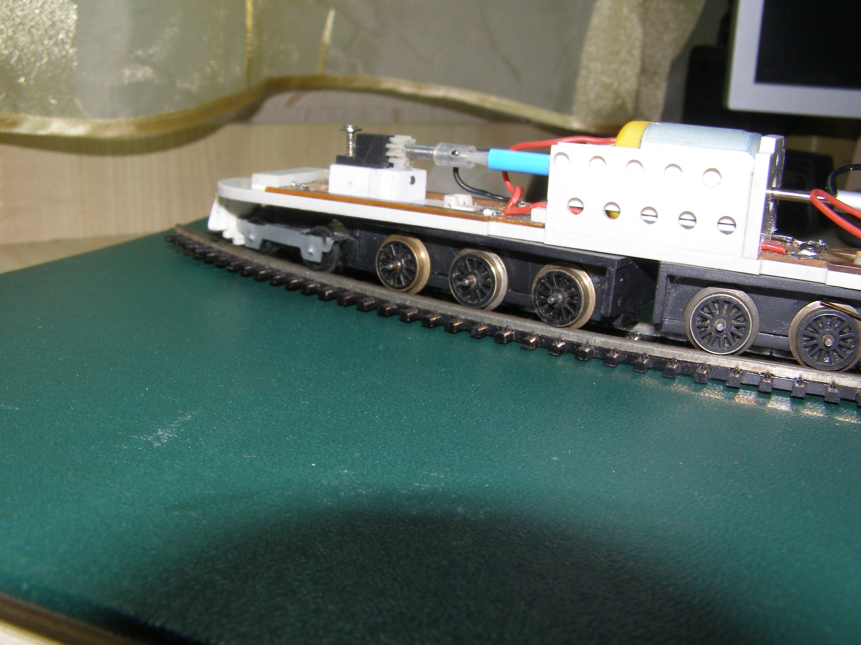 Пишет, что у этой ходовки использовались колеса от BR130 "Людмила" и они были слишком маленькие, так что он купил новые спицованные колеса от Tillig задорого, а в качестве пантографа использовал травленый набор для какого-то старого чешского локомотива. Они чуть меньше, чем надо, но выглядят гораздо лучше, чем пластиковые оригинальные.