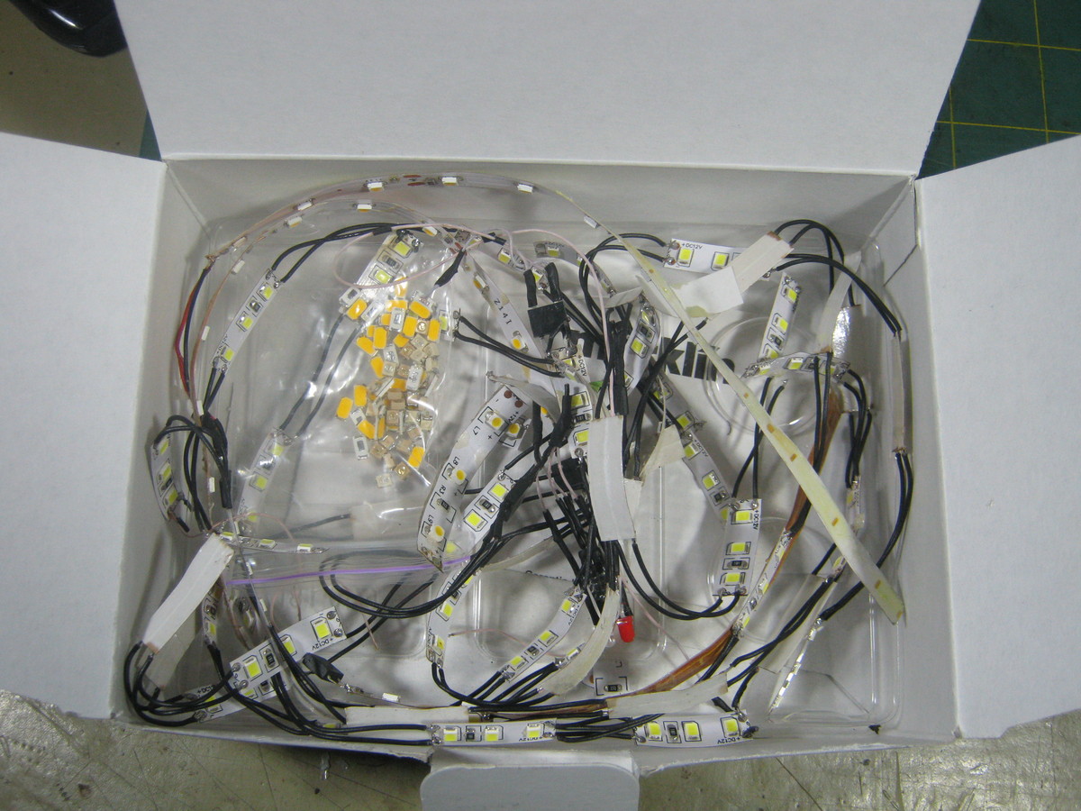 Вот содержимое волшебной коробочки. Там отдельно светодиоды в пакете, а основной объём занимают вот такие сборки. Явно где-то был ограблен пассажирский состав...
