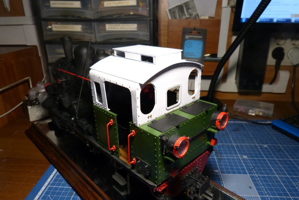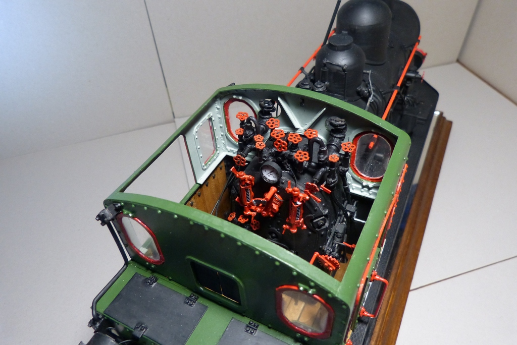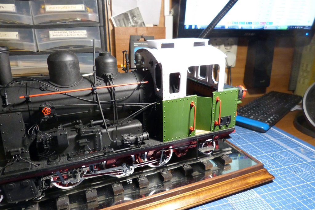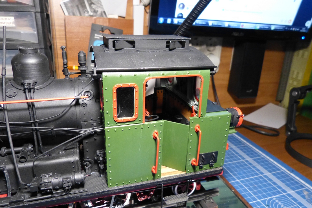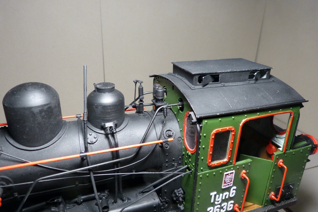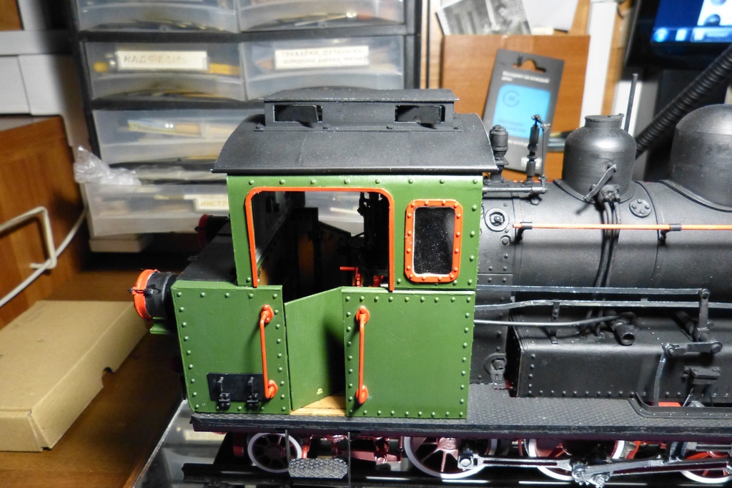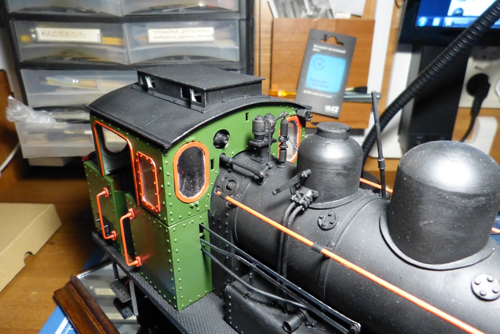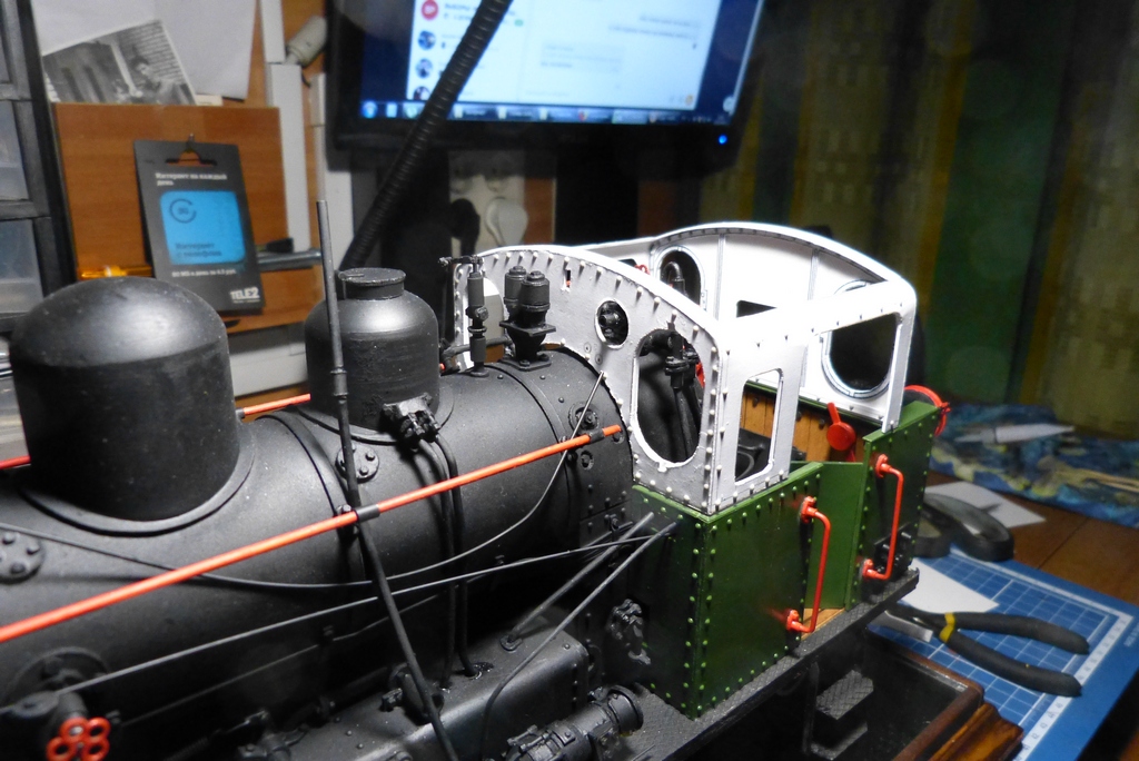 Установлен верх будки,будка машиниста готова,осталось две трубки от распредкоробок,две трубки с клапанами от вентелей на котле к пароразборной каропке,рычаг свистка,тяга к сухопарнику и таблички с надписями