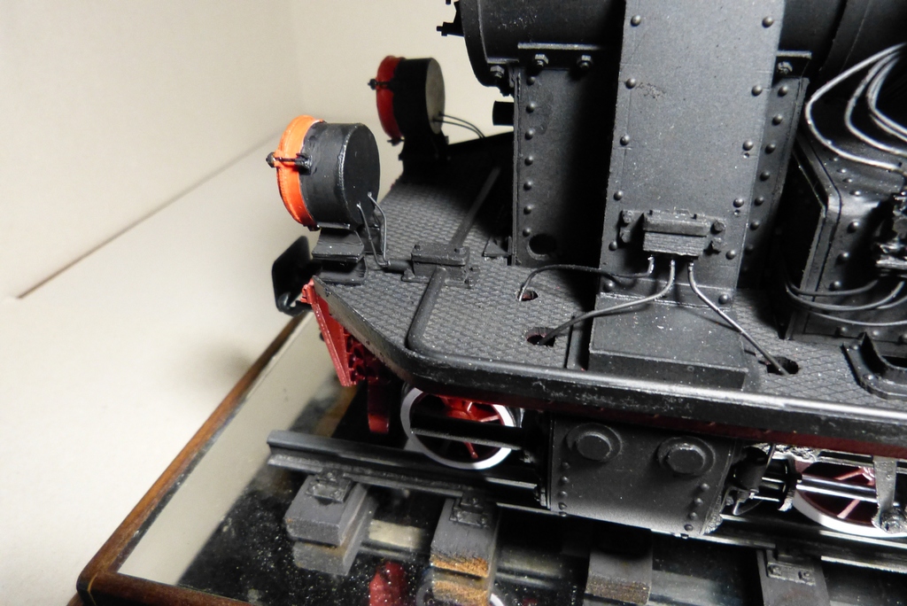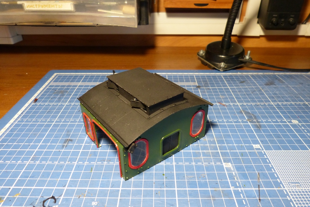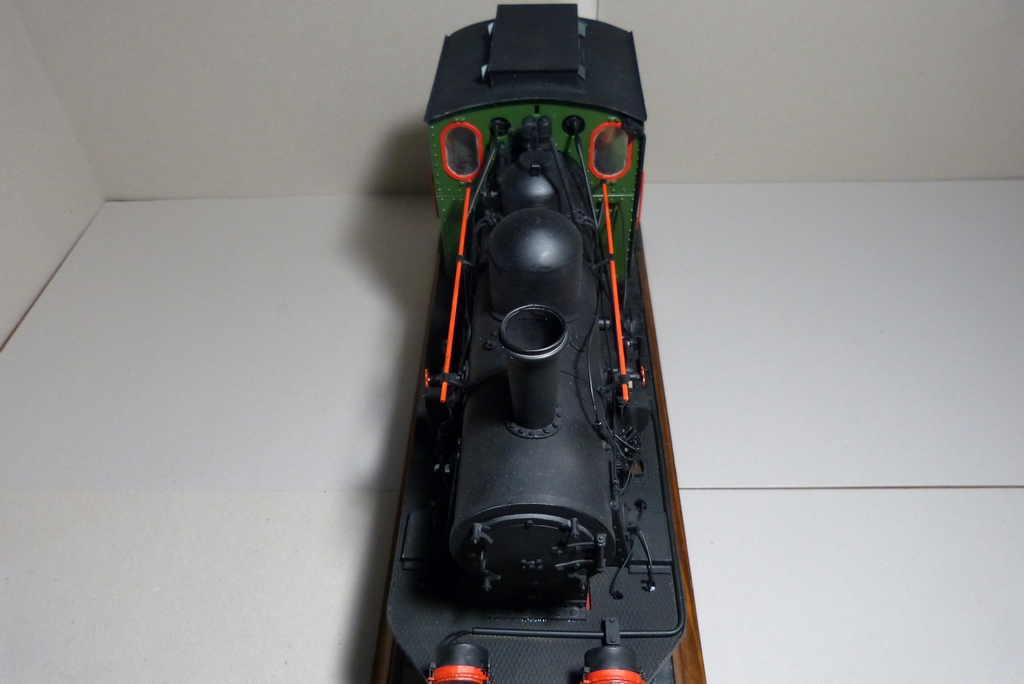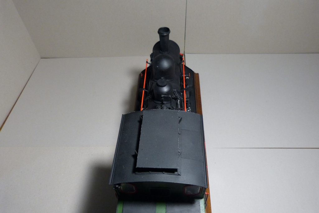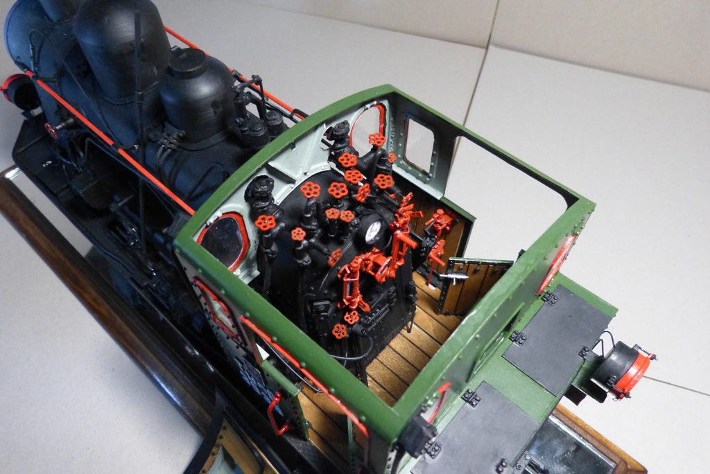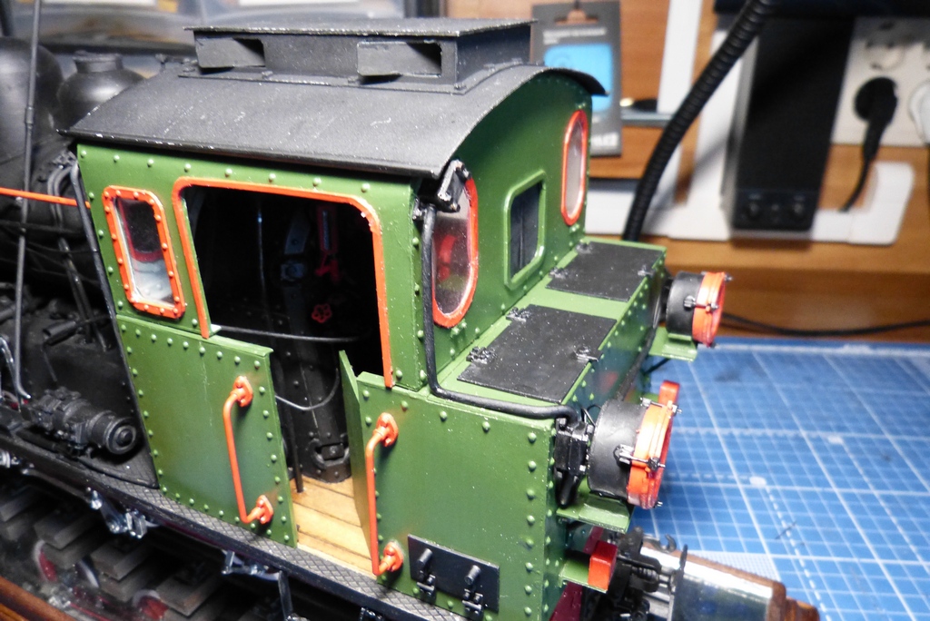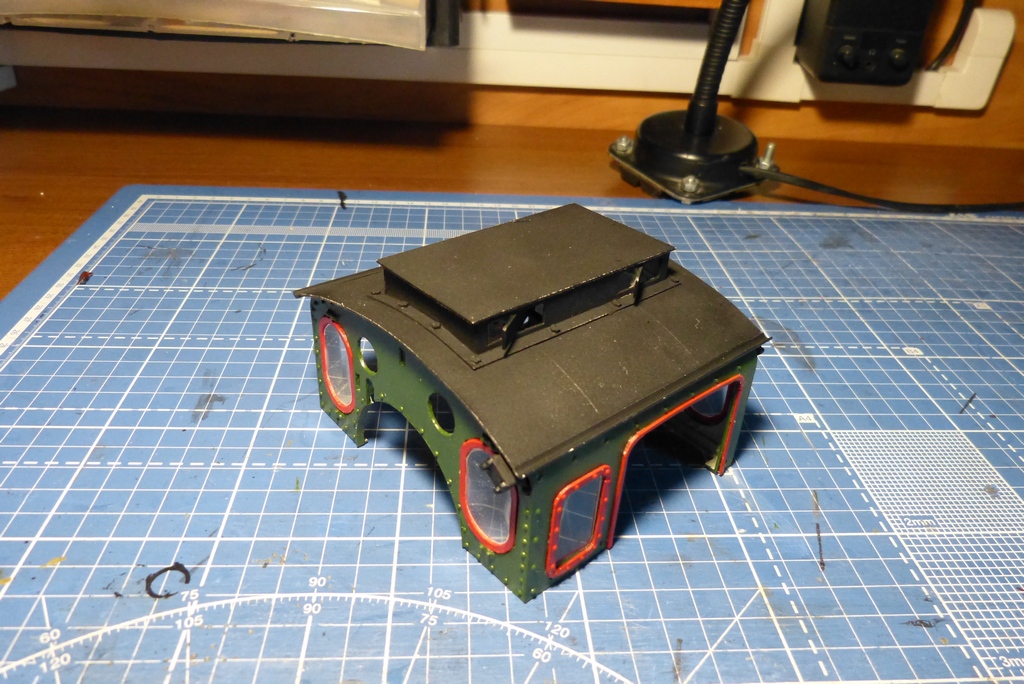 Установлен верх будки,будка машиниста готова,осталось две трубки от распредкоробок,две трубки с клапанами от вентелей на котле к пароразборной каропке,рычаг свистка,тяга к сухопарнику и таблички с надписями