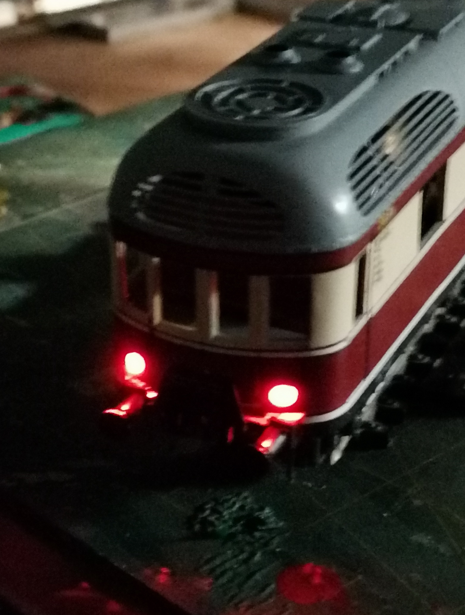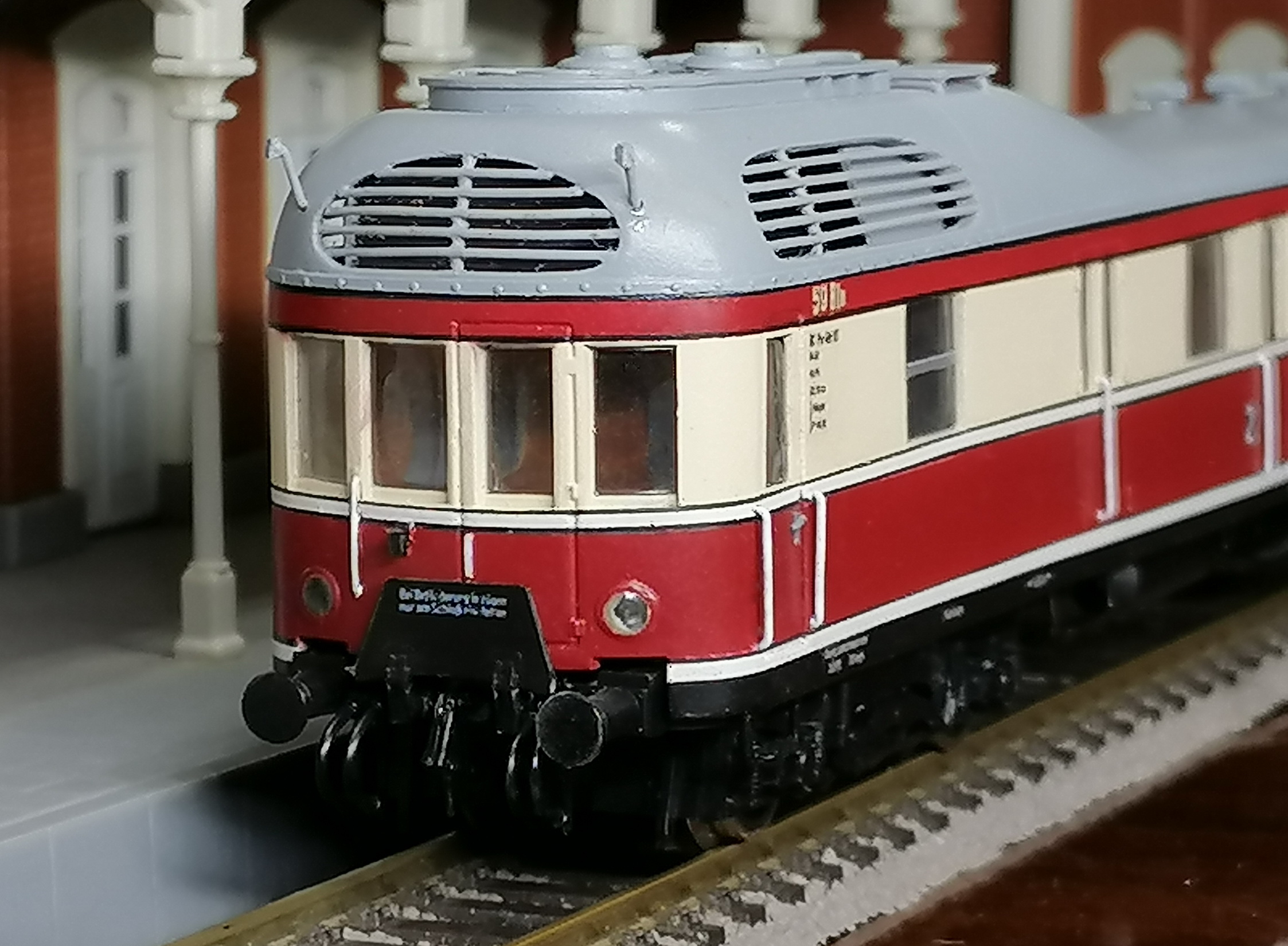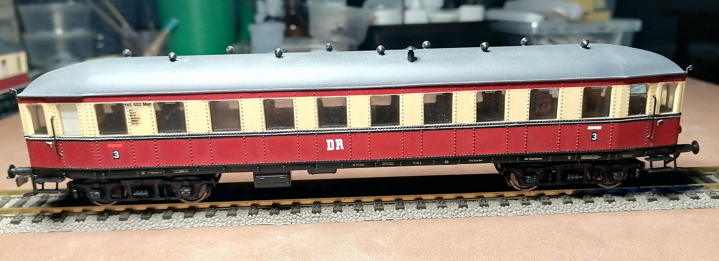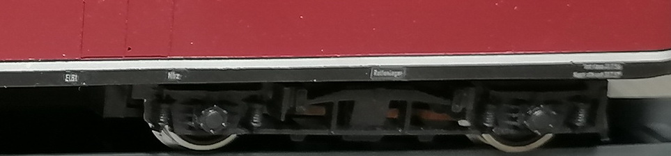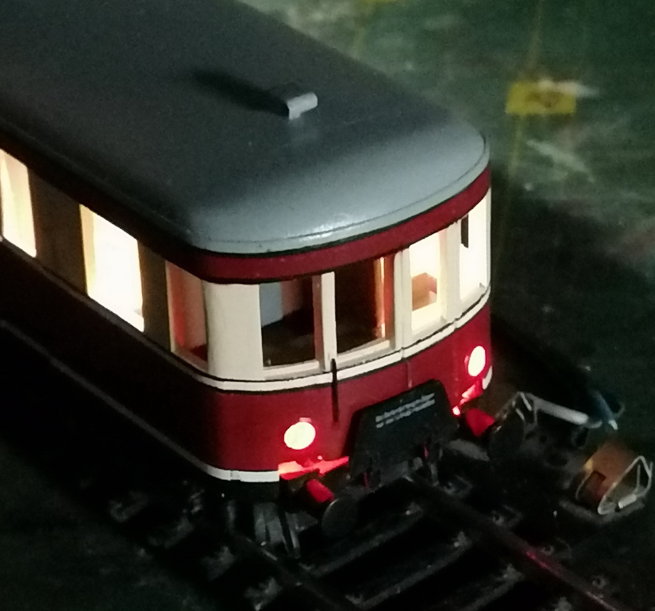 Вагон к VT135 552 всё-таки закончил. Напечатал декали (черные). Неудачно вышло - краска немного поплыла и окрасила подложку, видно очень тонкий нижний слой лака. Может ещё переделаю на другой бумаге. Белые надписи на раме остались родные. Долго не мог найти нужные готовые тележки. Потом плюнул и отлил боковины из смолы. На родных тележках вагона срезал боковины подчистую и приклеил отлитые. Покрасил и установил. Приделал токосъём. Отлил вентиляционные грибки, тормозные шланги, спаял подножки и другую мелочь. Освещение салона и красные задние фонари - само собой. В общем, на полке смотрится. Особенно издалека.
