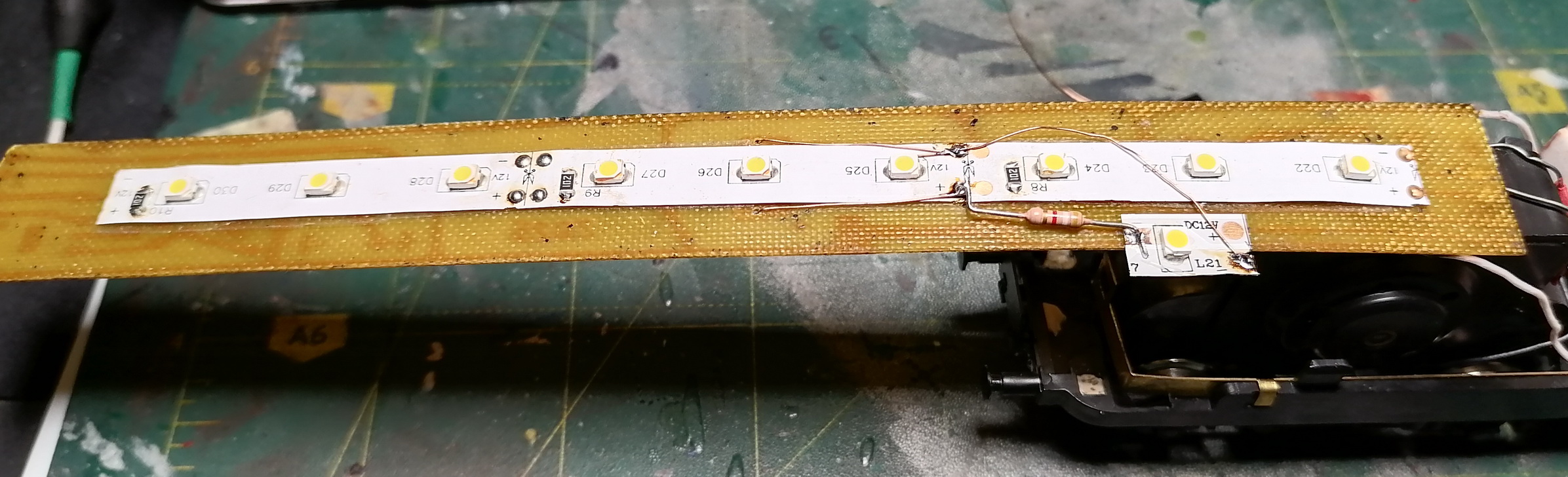 Под освещение салона и фары нарисовал плату и припаял светодиодную ленту. Резисторы на ленте 150 Ом заменил на 1 кОм для приглушения яркости.