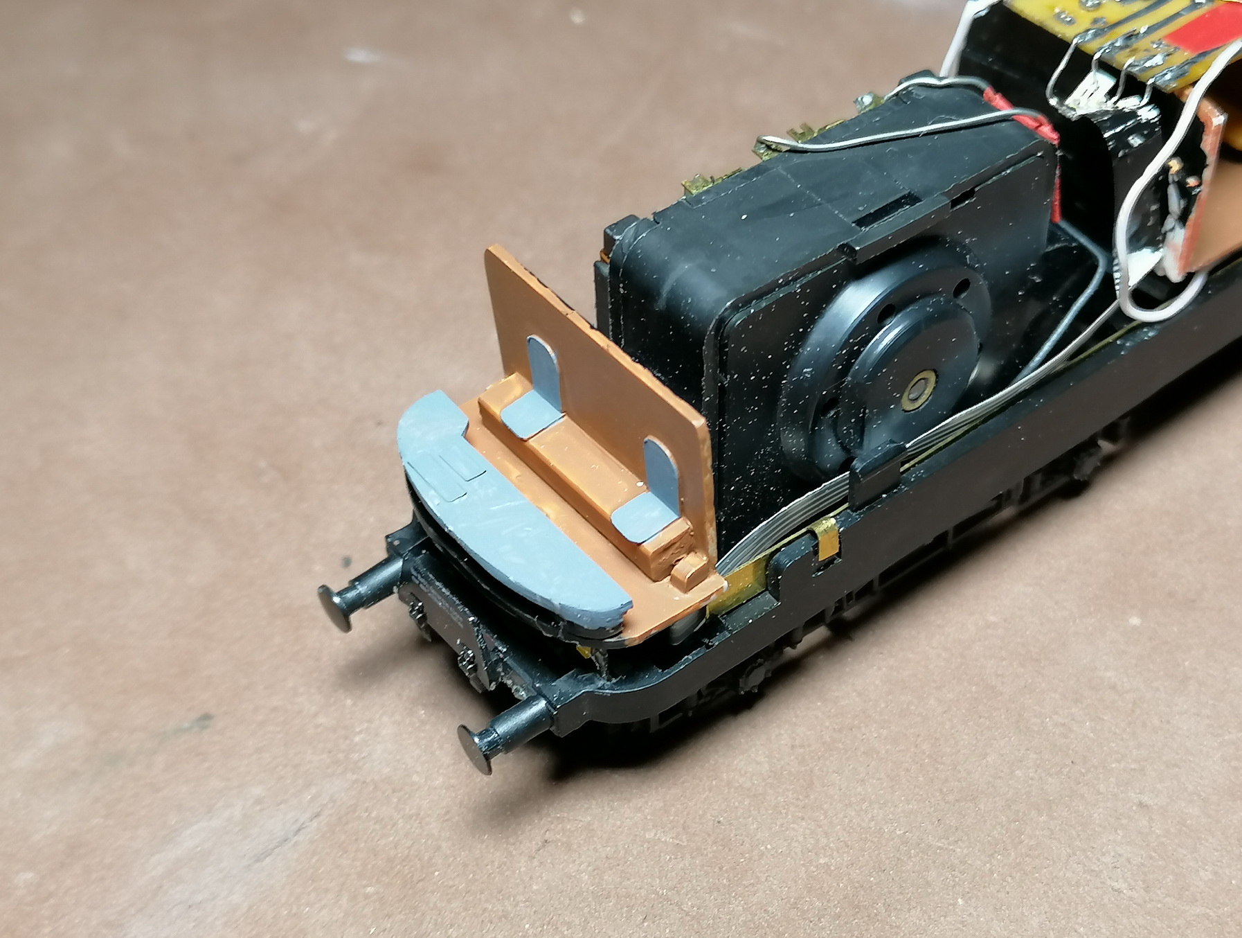 Далее потрошение ходовки. Её тоже надо удлинить на 5мм, убрать лишнее подвагонное хозяйство и добавить туда недостающее. Что там было снизу - ?. Буду делать только то, что видно на фото модели. Снизу должны идти паровые трубы от котла в передней части вагона к задней тележке, где находится паровая машина. Но как они идут - неизвестно. Поэтому с ними заморачиваться не буду. И новый салон.