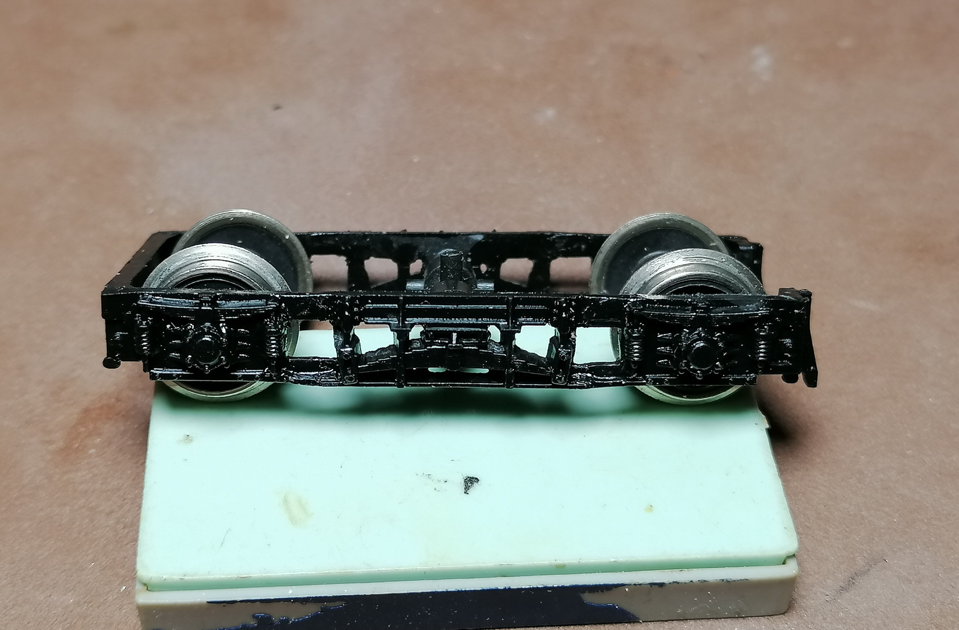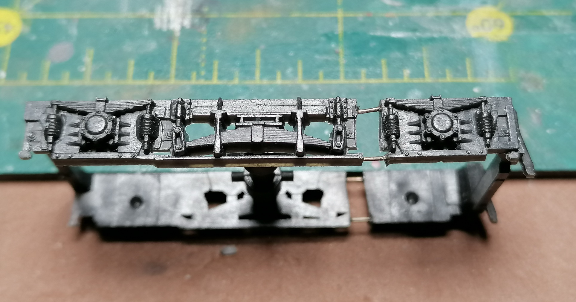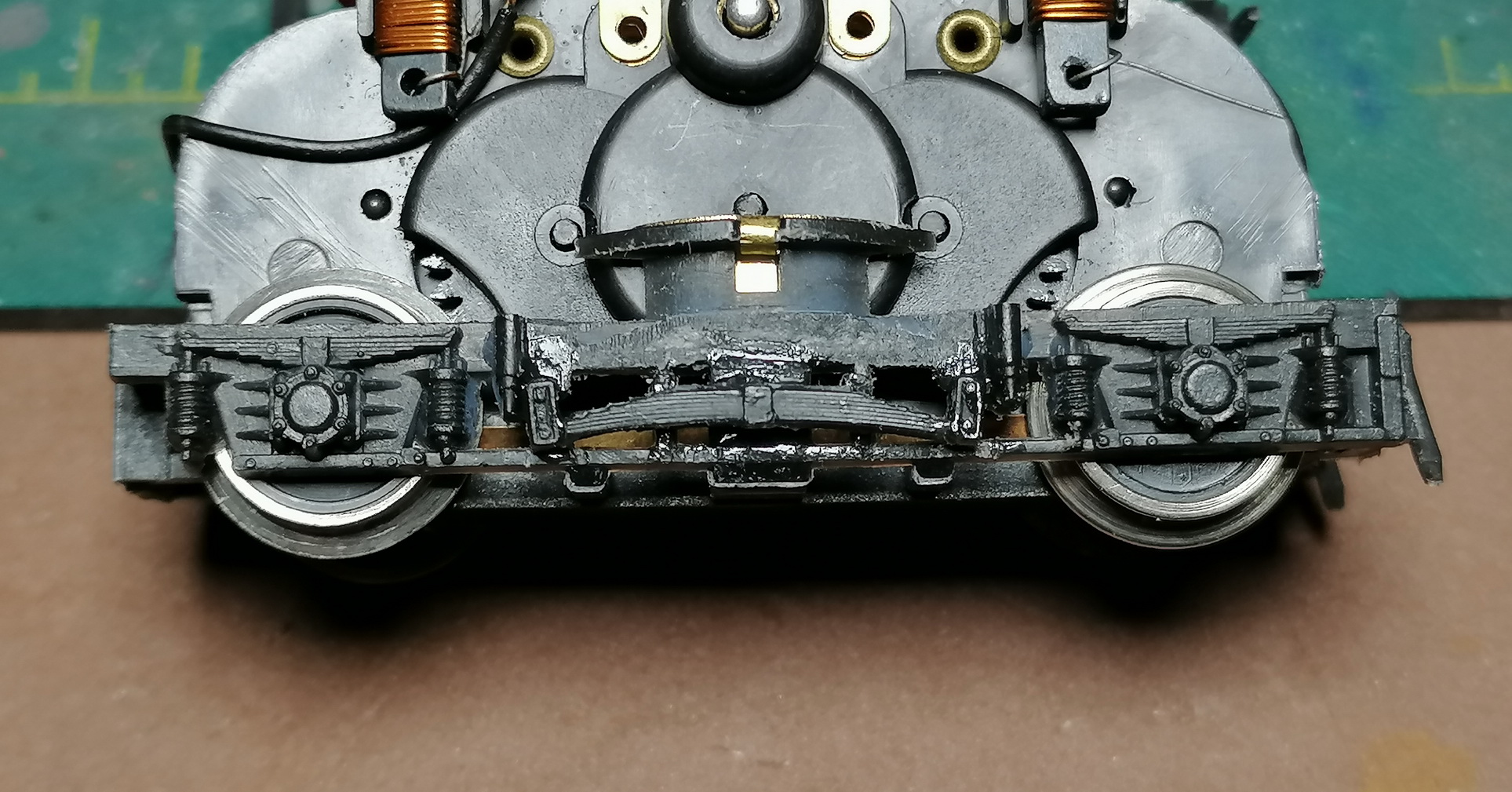 Остекление закончил. Взялся за раму. Спаял подножки и переделываю тележки. На передней (моторной) тележке увеличивать межосевое на 5мм не стал, слишком проблемно, ограничился переносом центральной рессоры на другое место. А на задней увеличиваю до 40мм, как на передней. Потом зазоры залью эпоксидкой.