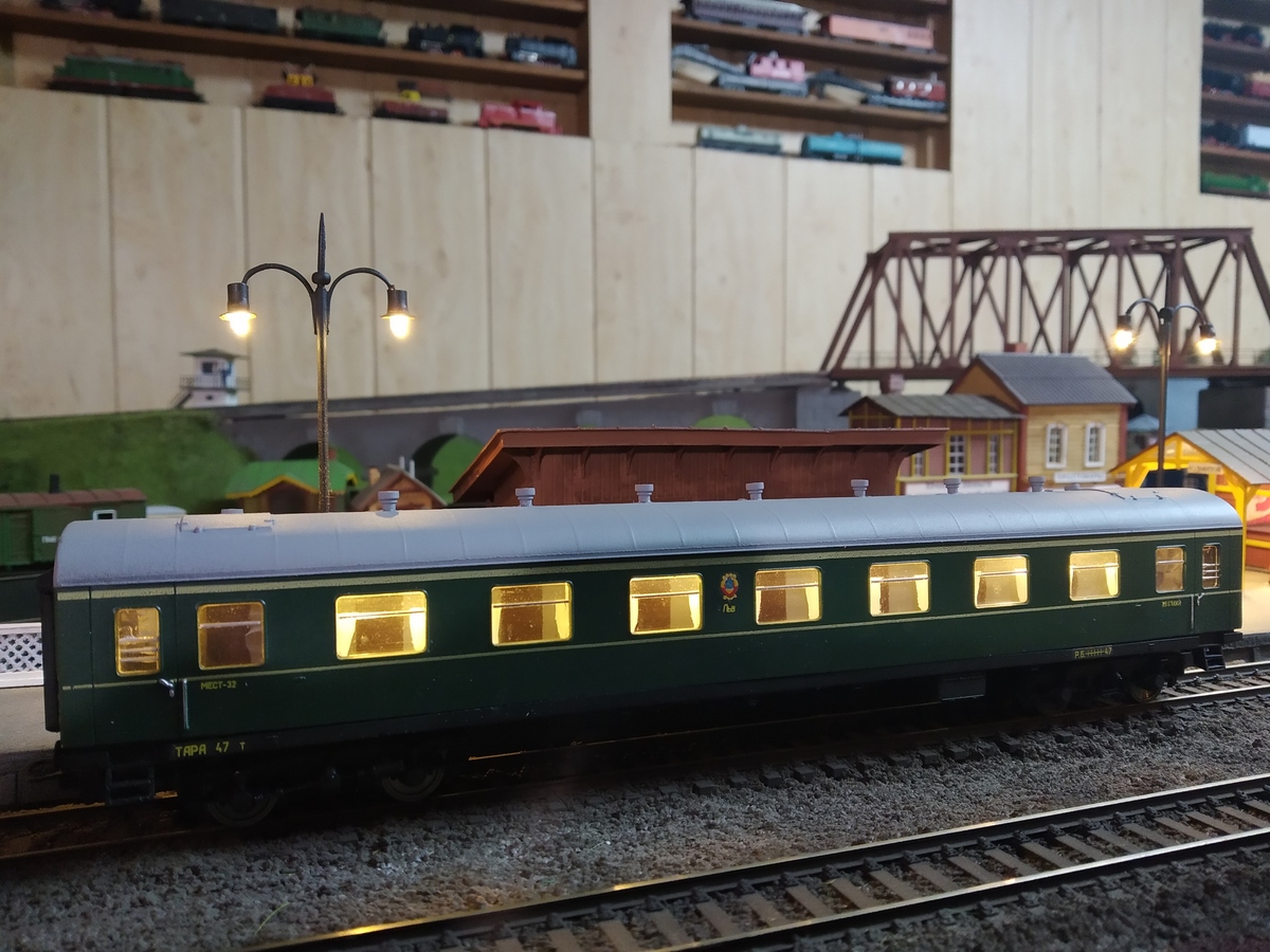Немного подтянул один вагон бывшего первого класса. Попутно, наконец-то, сделал ступени ( отсутствовали все) и оформил и оформил интерьер и освещение жилого отсека багажного вагона.