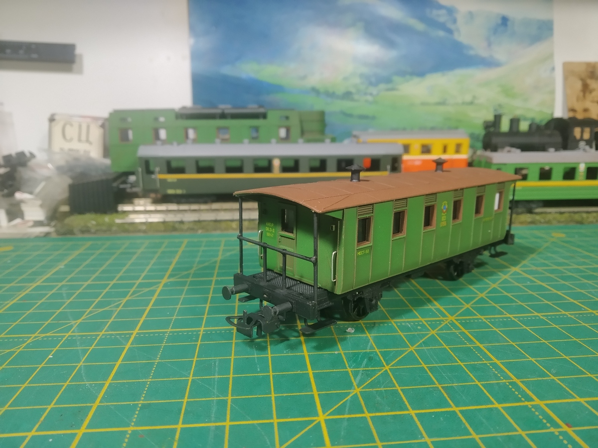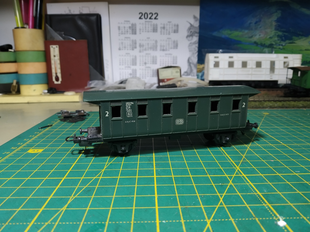 В тот период совместно с багажным вагоном, который якобы завершал проект, был приобретён ещё и пассажирский вагон Lima. По кузову отличается от Rivarossi лишь кронштейнами крыши на тамбурных площадках. Подвагонное совершенно иное, колёсная база длиннее Rivarossi на 15 мм и конструкция больше напоминает Kleinbahn. По ходовой пока лишь подогнал колёсную базу до 60 мм под Rivarossi. По кузову продвижение чуть больше. Полагаю, вагончик хорошо впишется в уже имеющийся состав.