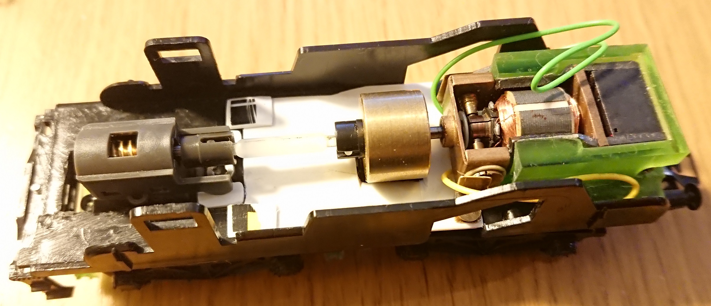 Продвинулся дальше. В целях улучшения обслуживаемости модели переделал временный токосъём на ведомой телеге. Также сделал выемку под маховик на новом двигателе