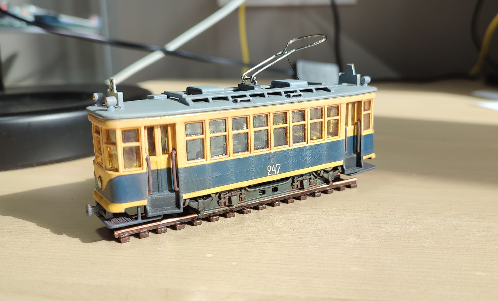 наконец добил долгострой в виде Х в харьковской окраске. Ездить он будет по настольному микромакету 55х55 см, поэтому у него колея 9 мм, что не достоверно. Из крупных косяков - плохая окраска и на некоторых впадинах легла шагренью, хотя везерингом я более менее доволен и он меньше похож на игрушку чем без него. Очень толстые поручни (на тот момент я не догадался сделать их их витой пары) и делал из скрепок. Ну и смолу на окнах в теории можно отполировать, но у меня это не получилось и покрыл толстым слоем лака что б прозрачность была приемлемая, что дало желтоватый оттенок и неоднородность.