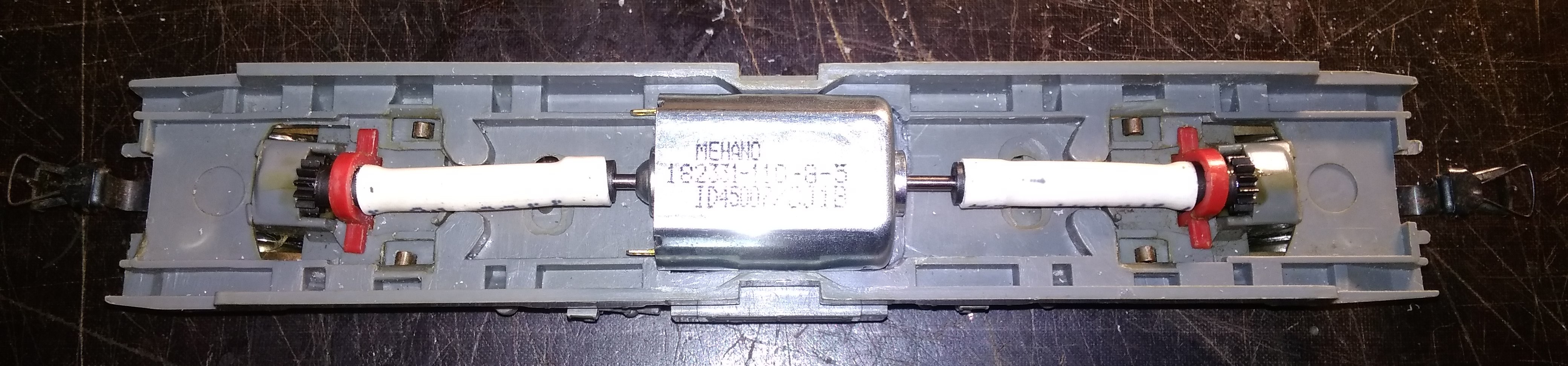 собрал раму. Из нескольких вариантов передачи вращения, лучший результат показала пружина из проволоки 0.1 (только она слишком мягкая и не держит форму). Поэтому заказал на Али прожины из 0.2 и 0.3 мм. Изоляция от тонких проводов оказалась слишком жесткой и на кривой двигатель с трудом вращал обе тележки. Так как боковины рамы изолированы, то ток планирую брать прямо с них. Для разборки выкручиваются винты сбоку (на фото это с другой стороны), боковина снимается и тележки вываливаются